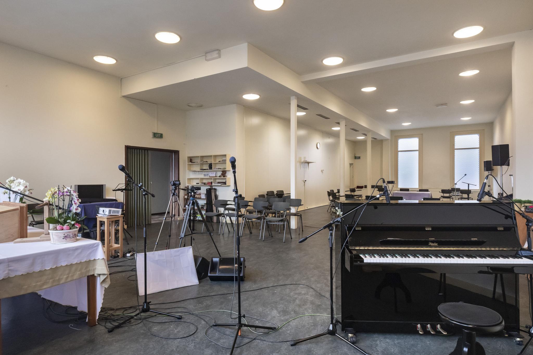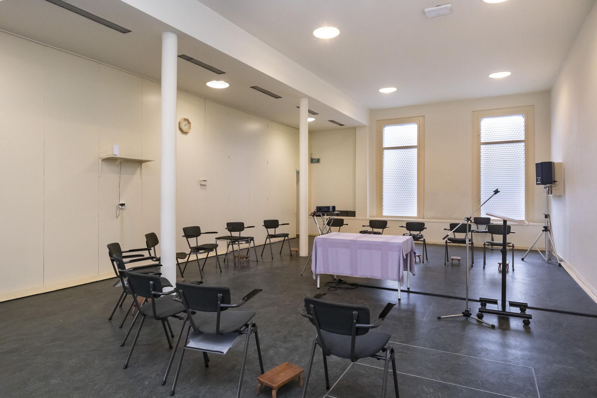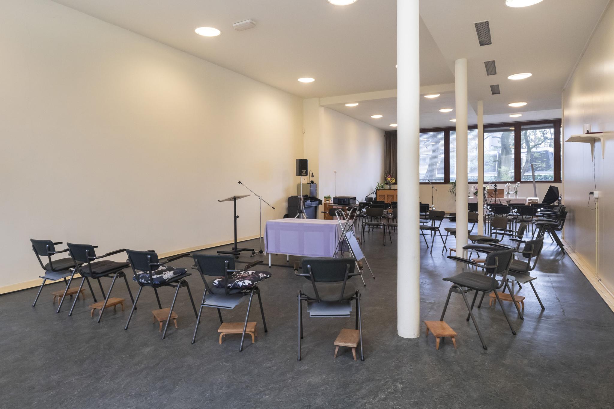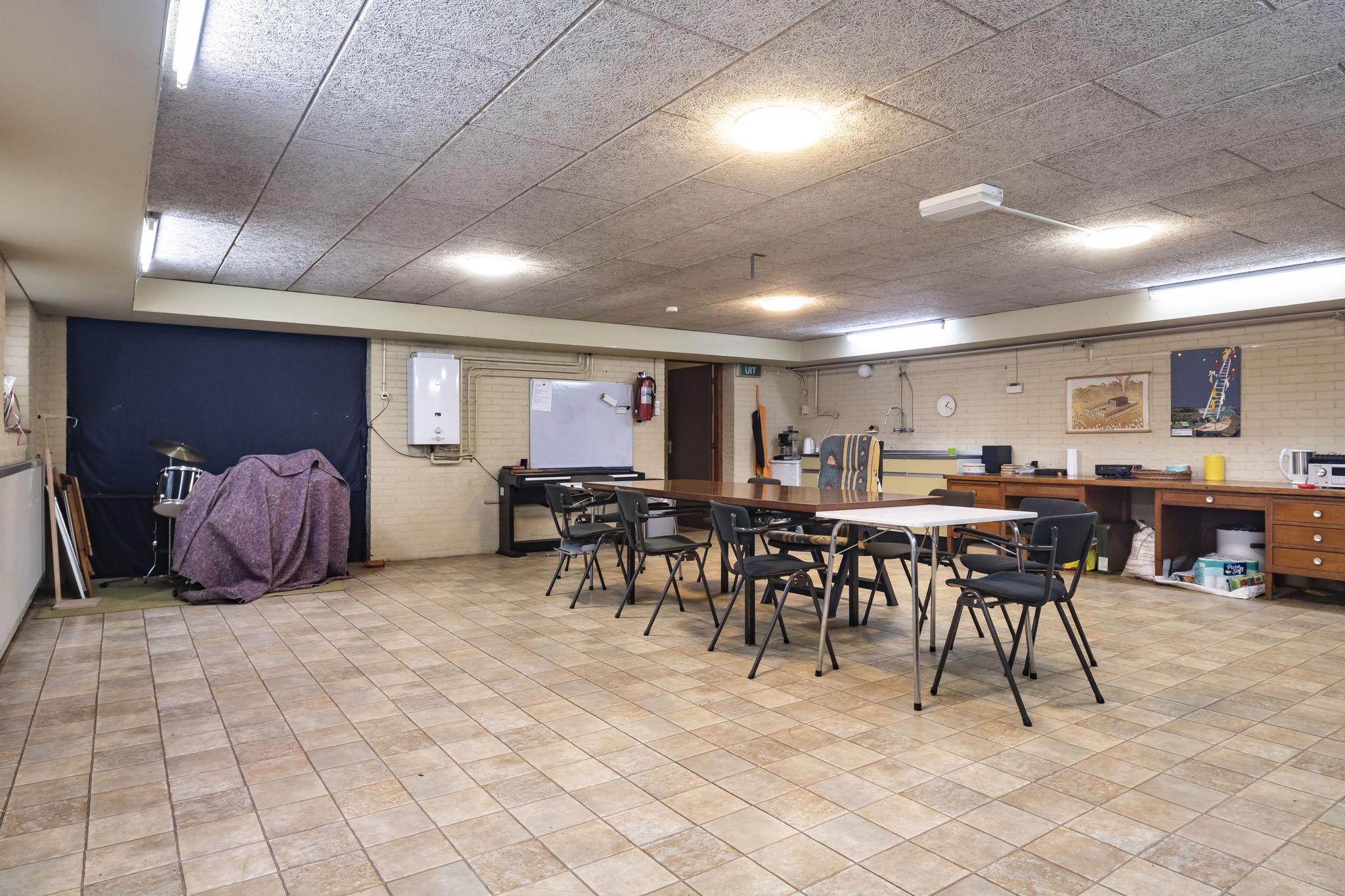 Deze verdiepingen zijn de voormalige kerk en bestaan uit diverse multifunctionele ruimtes, vijf toiletten en een pantry. Via het souterrain is de achtertuin bereikbaar welke is voorzien van een eigen parkeerplaats met carport.