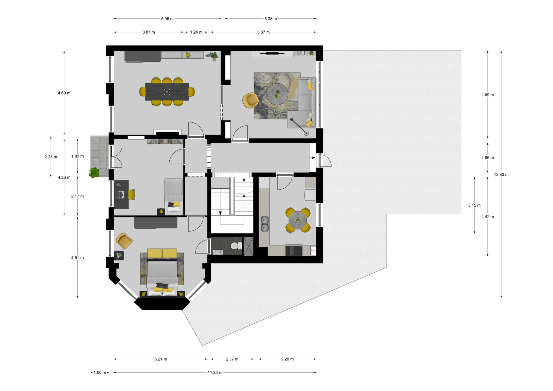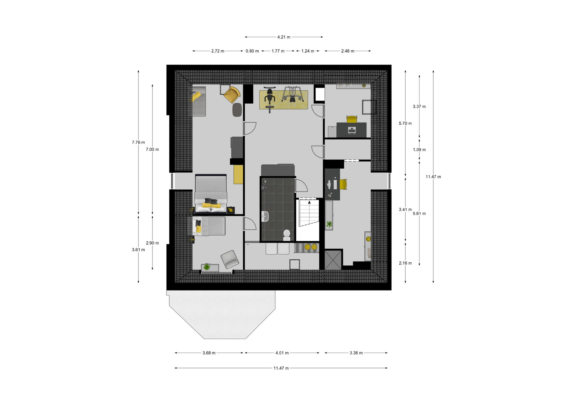 Overloop, twee riante slaapkamers waarvan één met eigen toilet, royale woon- en eetkamer en keuken. Via de overloop is het dakterras bereikbaar welke beschikt over een prachtig uitzicht over de Rijn en de Uiterwaarden.