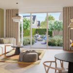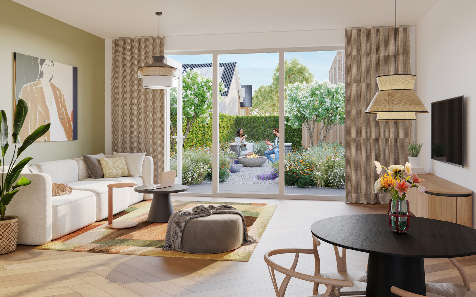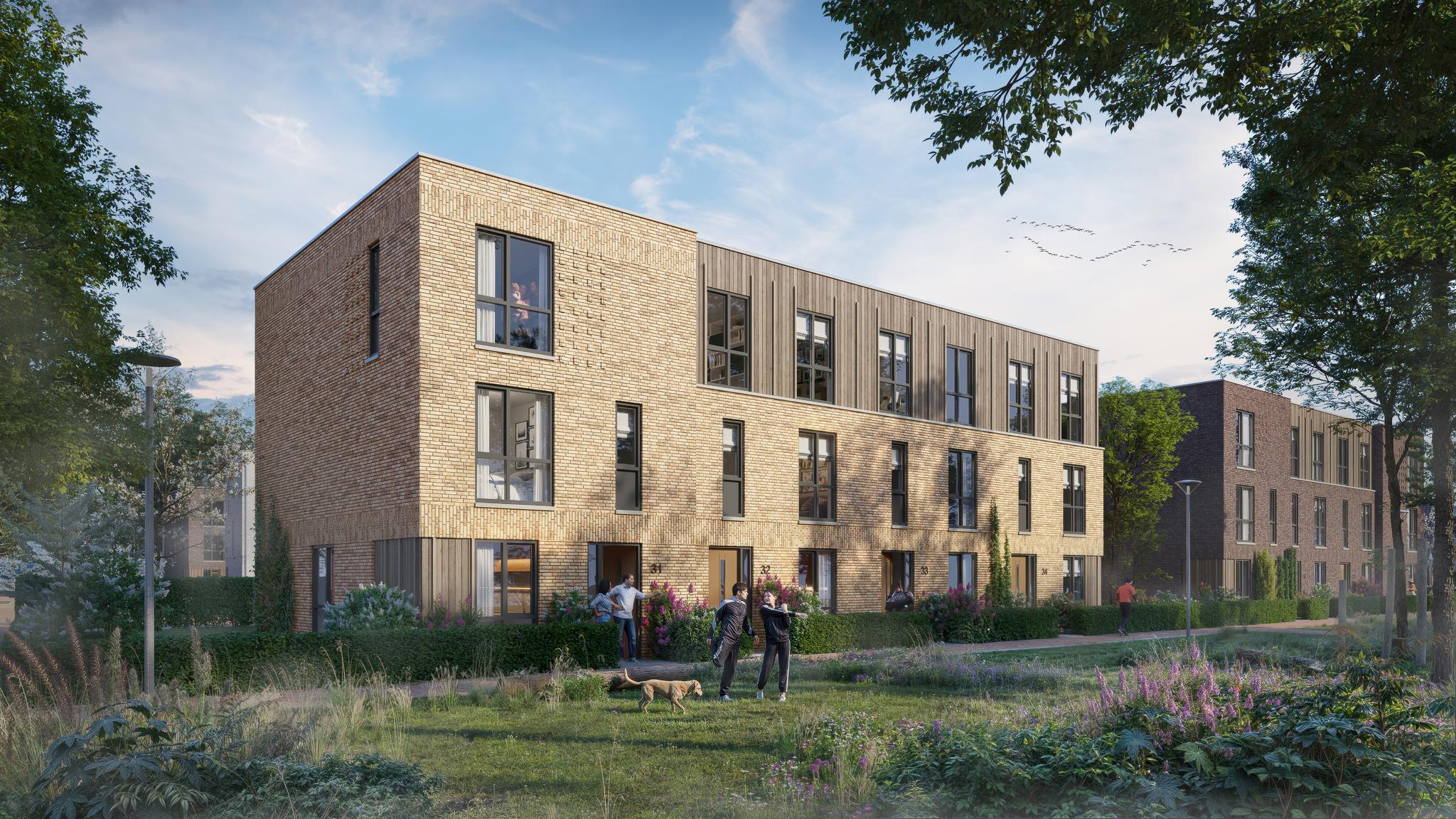 Een mooie vrije positie in het groene park. Karakteristiek in vorm en schaal. Op deze manier ontstaat er samenhang en herkenning met omliggende buurtschappen. De grondgebonden woningen zijn afwisselend toegepast in 2 en 3 lagen met een plat dak en 2 lagen met een kap. Hierdoor ontstaat een mooie diversiteit in het beeld welke wordt versterkt door sprongen in de gevel en afwisseling in gevelmateriaal en kleur.