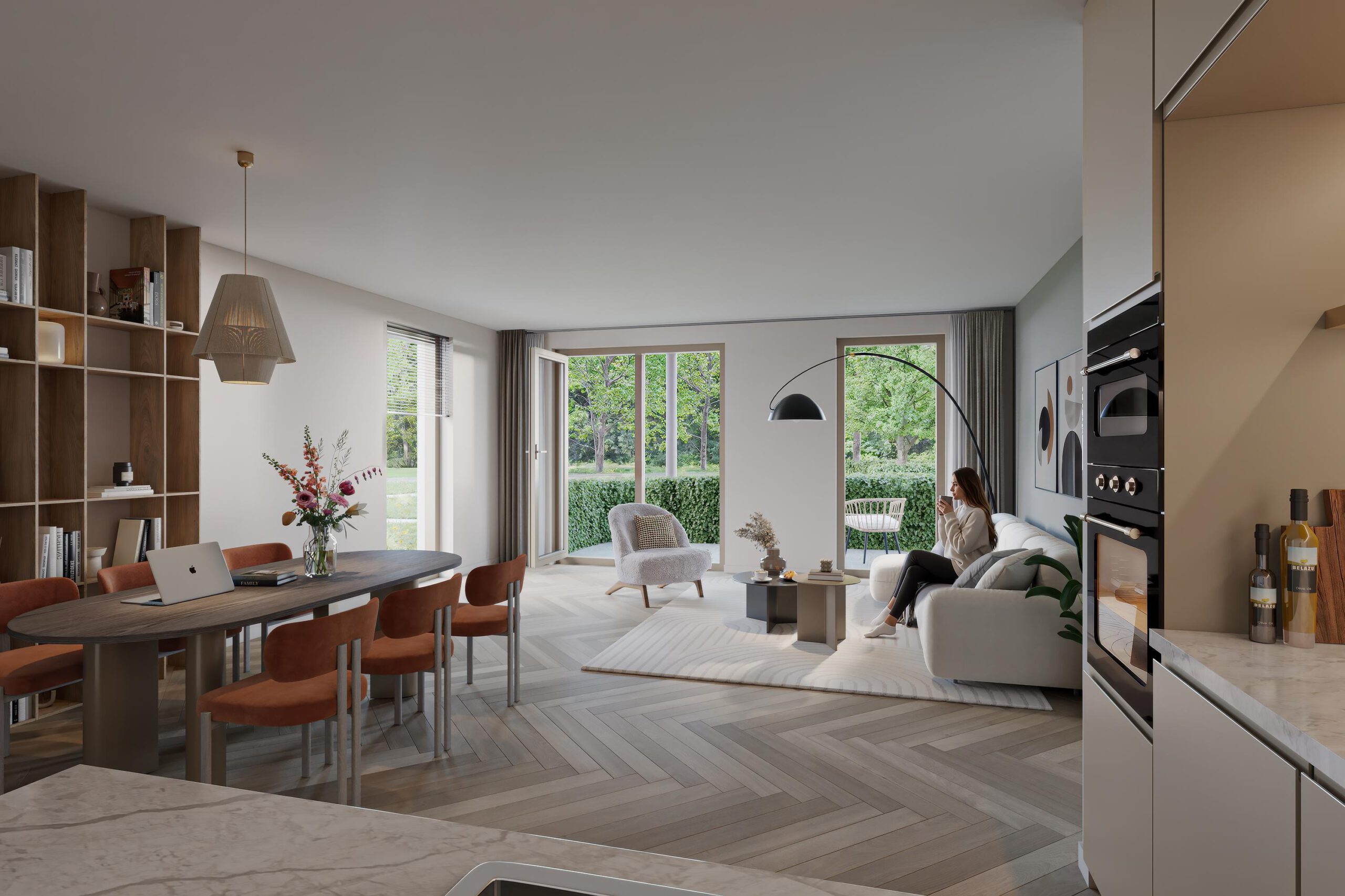 De buitenruimte verschilt per woning: tuin op maaiveld, een balkon op de verdiepingen, soms zelfs twee balkons, en enkele varianten grenzen aan de dektuin. Binnen krijg je een royale woonkamer, twee goede slaapkamers en een slimme bergruimte. De keuken ligt centraal en leent zich voor samen koken en lang natafelen. Het comfort merk je dagelijks: een aangename temperatuur, stille kamers en lage energielasten.
