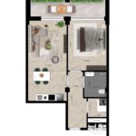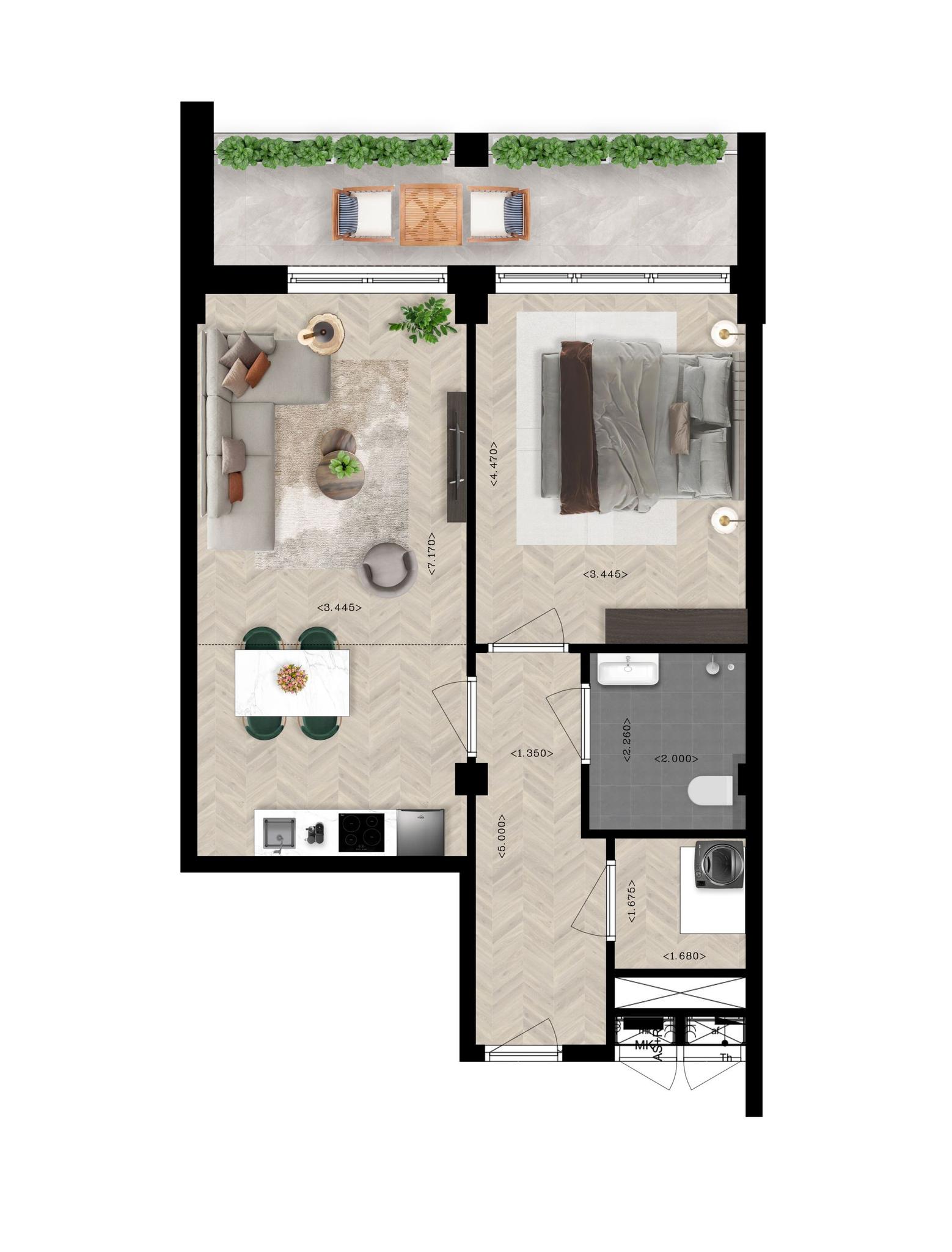 De 15 tweekamerappartementen van dit type vind je op de eerste, zevende en achtste verdieping van Velperwaard. De lichte woonkamer met open keuken grenst aan het brede balkon, net als de grote slaapkamer Vanuit de ruime hal heb je toegang tot de badkamer, het separate toilet en de royale inpandige berging.