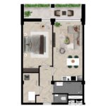 De 15 tweekamerappartementen van dit type vind je op de eerste, zevende en achtste verdieping van Velperwaard. De lichte woonkamer met open keuken grenst aan het brede balkon, net als de grote slaapkamer Vanuit de ruime hal heb je toegang tot de badkamer, het separate toilet en de royale inpandige berging.