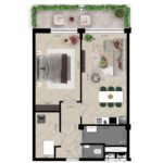 De 15 tweekamerappartementen van dit type vind je op de eerste, zevende en achtste verdieping van Velperwaard. De lichte woonkamer met open keuken grenst aan het brede balkon, net als de grote slaapkamer Vanuit de ruime hal heb je toegang tot de badkamer, het separate toilet en de royale inpandige berging.