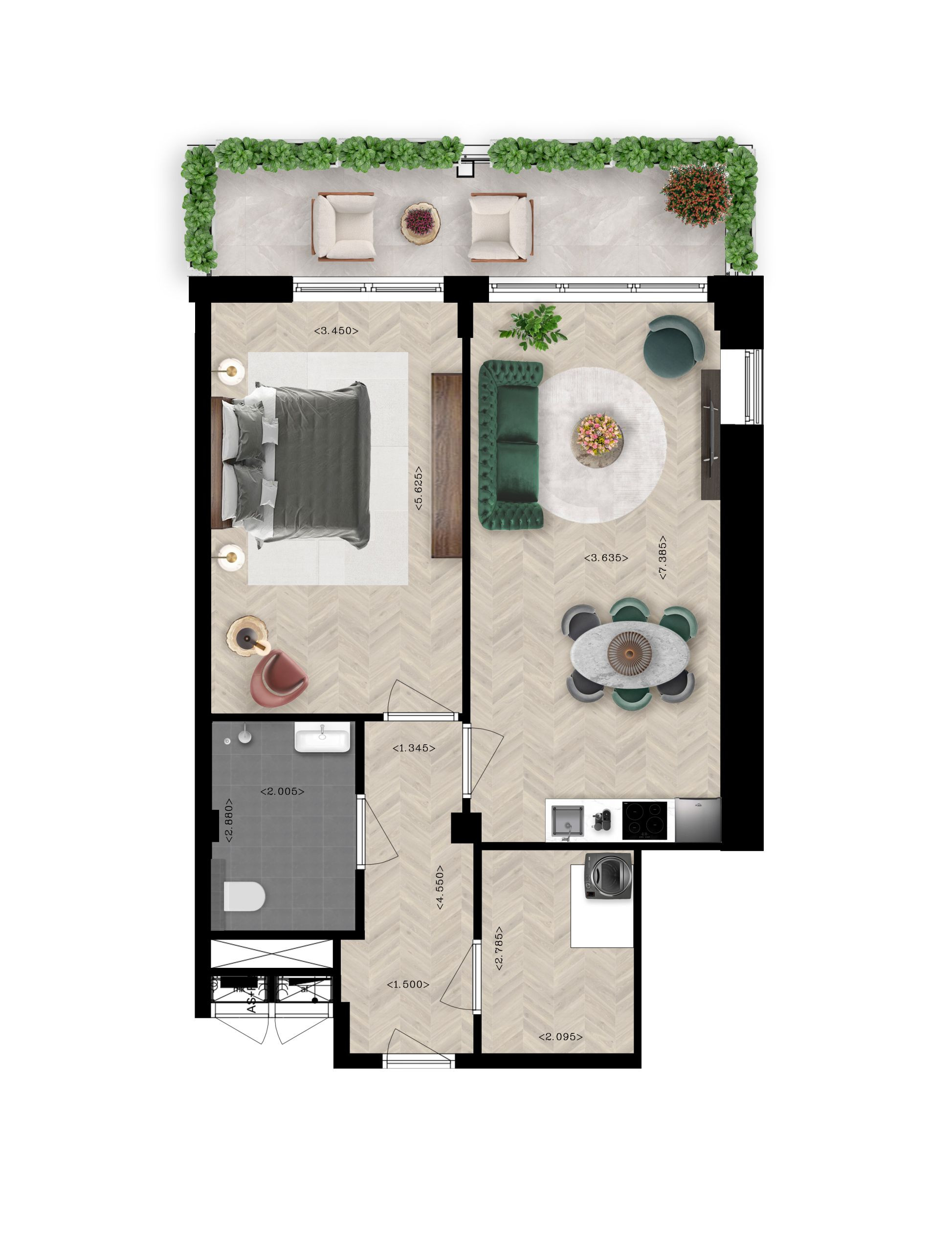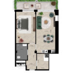 De drie appartementen van dit type vind je op de eerste, zevende en achtste verdieping. Ze hebben een zonnige woonkamer met open keuken die grenst aan het brede balkon op het zuidwesten. Ook via de slaapkamer heb je toegang tot het balkon. Een moderne badkamer met douche en toilet plus een ruime inpandige berging maken het compleet.