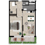 De 15 tweekamerappartementen van dit type vind je op de eerste, zevende en achtste verdieping van Velperwaard. De lichte woonkamer met open keuken grenst aan het brede balkon, net als de grote slaapkamer Vanuit de ruime hal heb je toegang tot de badkamer, het separate toilet en de royale inpandige berging.