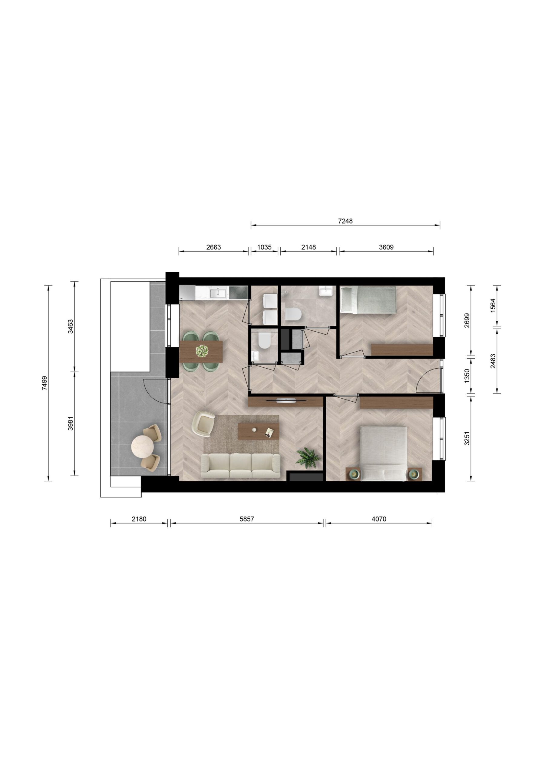 De 56 appartementen van dit type liggen verspreidt over blok 2, 4 en 5 en bieden comfortabel wonen met veel licht en ruimte. Vanaf de woonkamer met open keuken stap je zo je balkon op. Twee slaapkamers en een complete badkamer maken het hele woongenot helemaal af. Afhankelijk van het blok geniet je van de indeling en ligging die bij jouw woonwensen past.