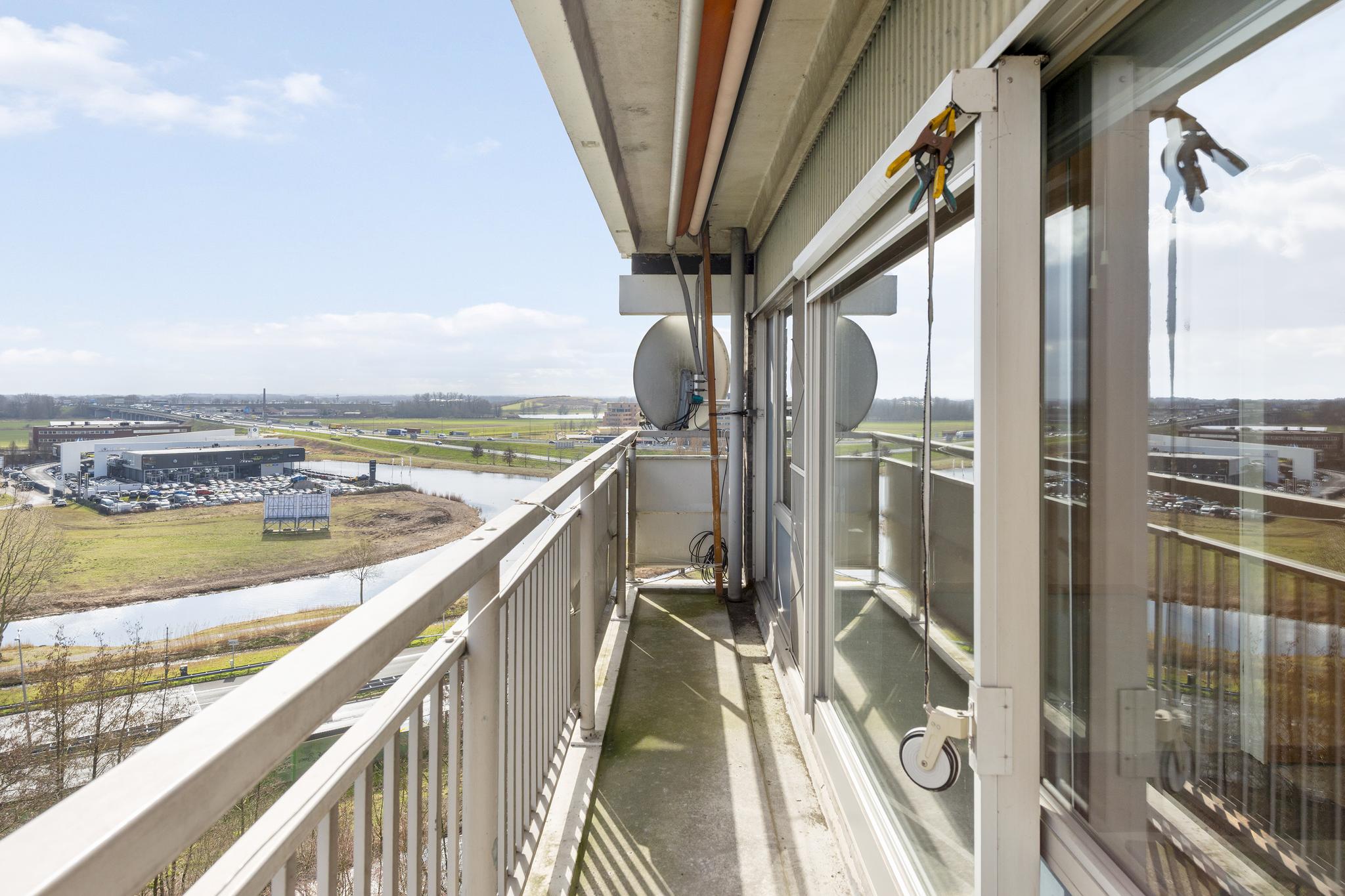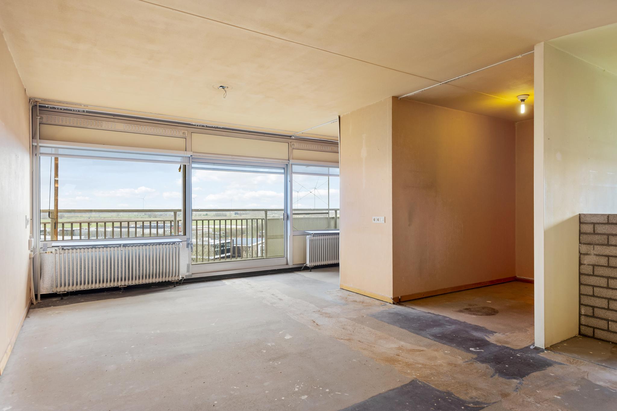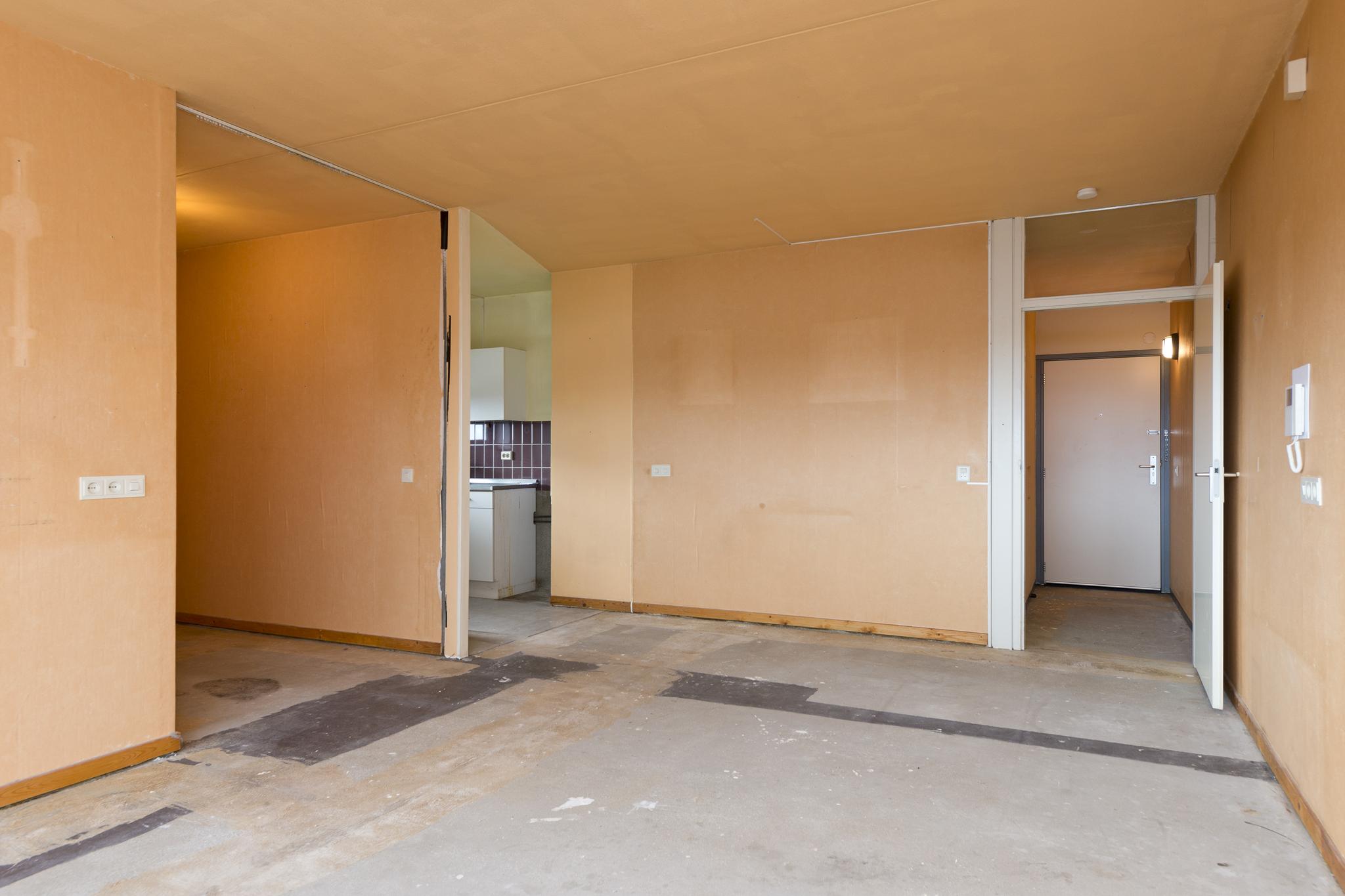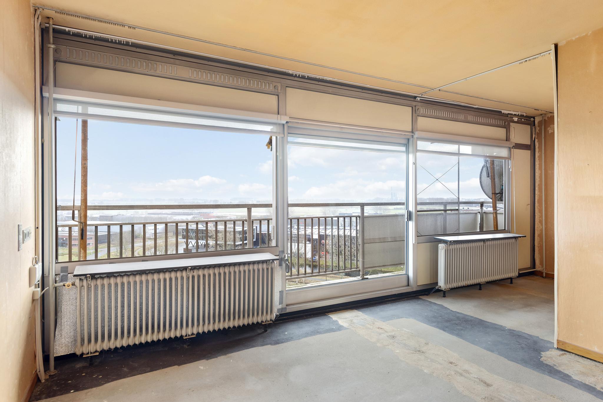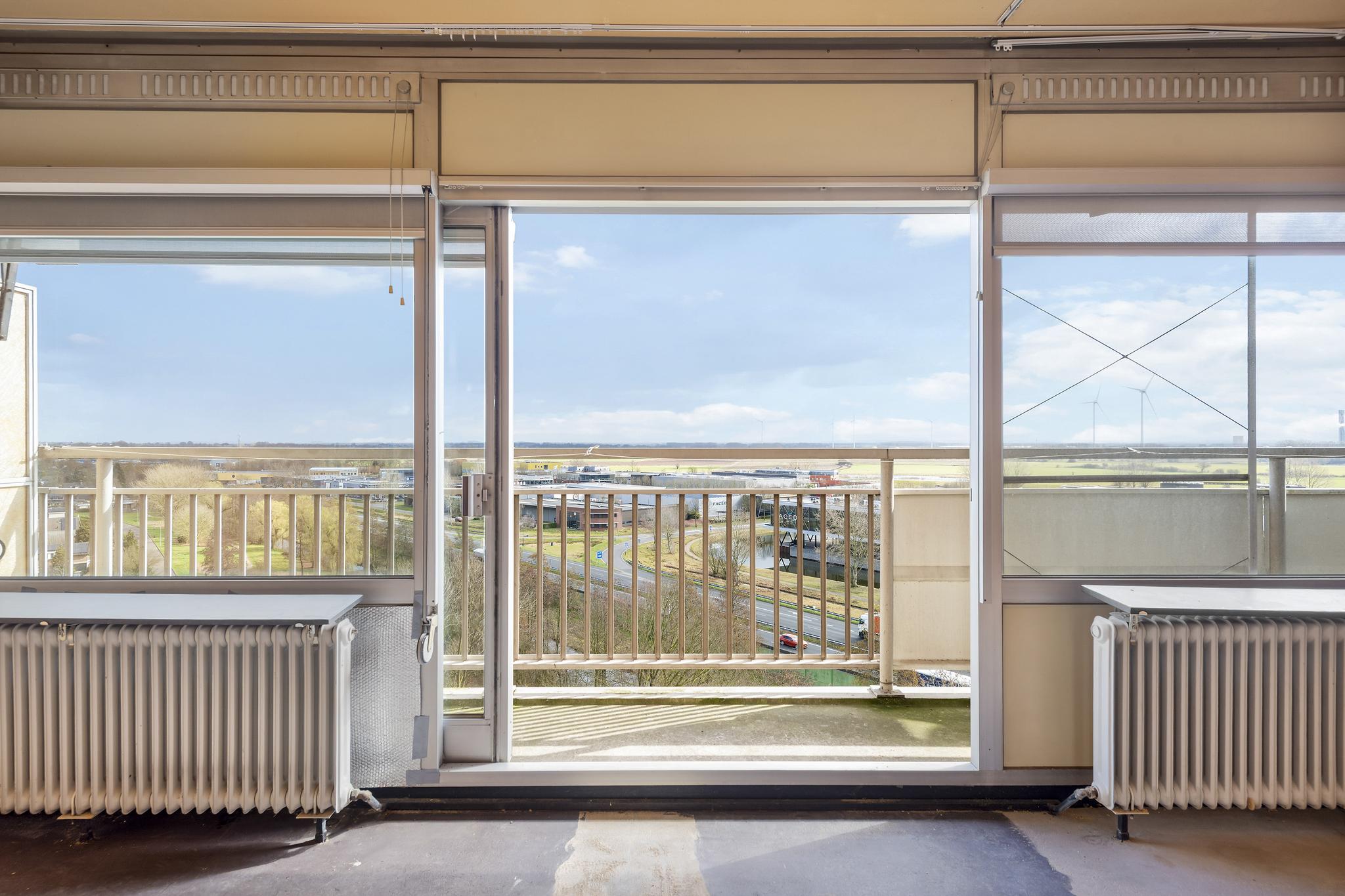 5e verdieping: entree, ruime lichte woonkamer met open keuken, tussenruimte ideaal als werkplek, goed formaat slaapkamer, badkamer voorzien van toilet, wastafel, doucheruimte en aansluiting wasmachine. Door de schuifpui in de woonkamer heeft u toegang tot het balkon, dat zich uitstrekt over de gehele breedte van het appartement. Rustig gelegen op de bovenste verdieping van het complex met fraai en levendig uitzicht.