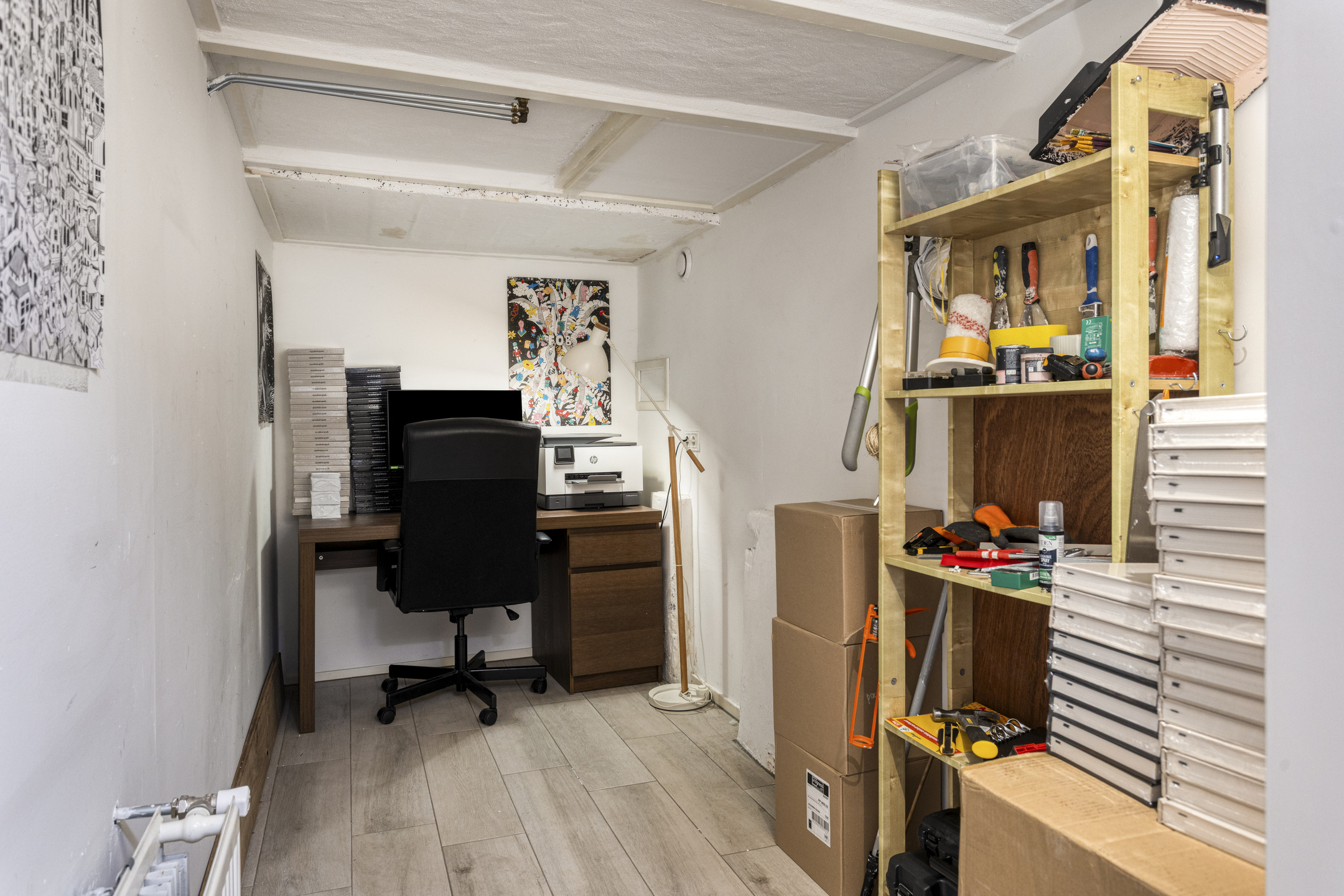 Het souterrain biedt verrassend veel extra ruimte. Hier bevinden zich twee slaapkamers, een moderne badkamer uit 2021 met inloopdouche, tweede toilet, afzuiging en een breed wastafelmeubel. Daarnaast is er een aparte ruimte voor wasmachine en droger en een royale berging die uitstekend kan dienen als inloopkast.