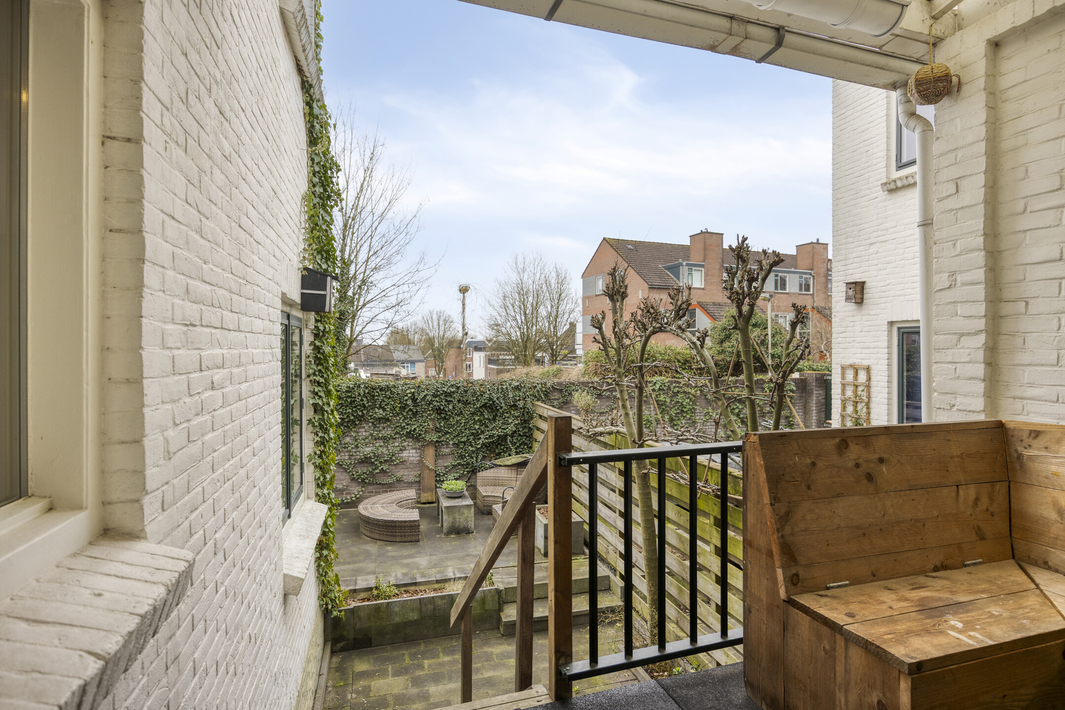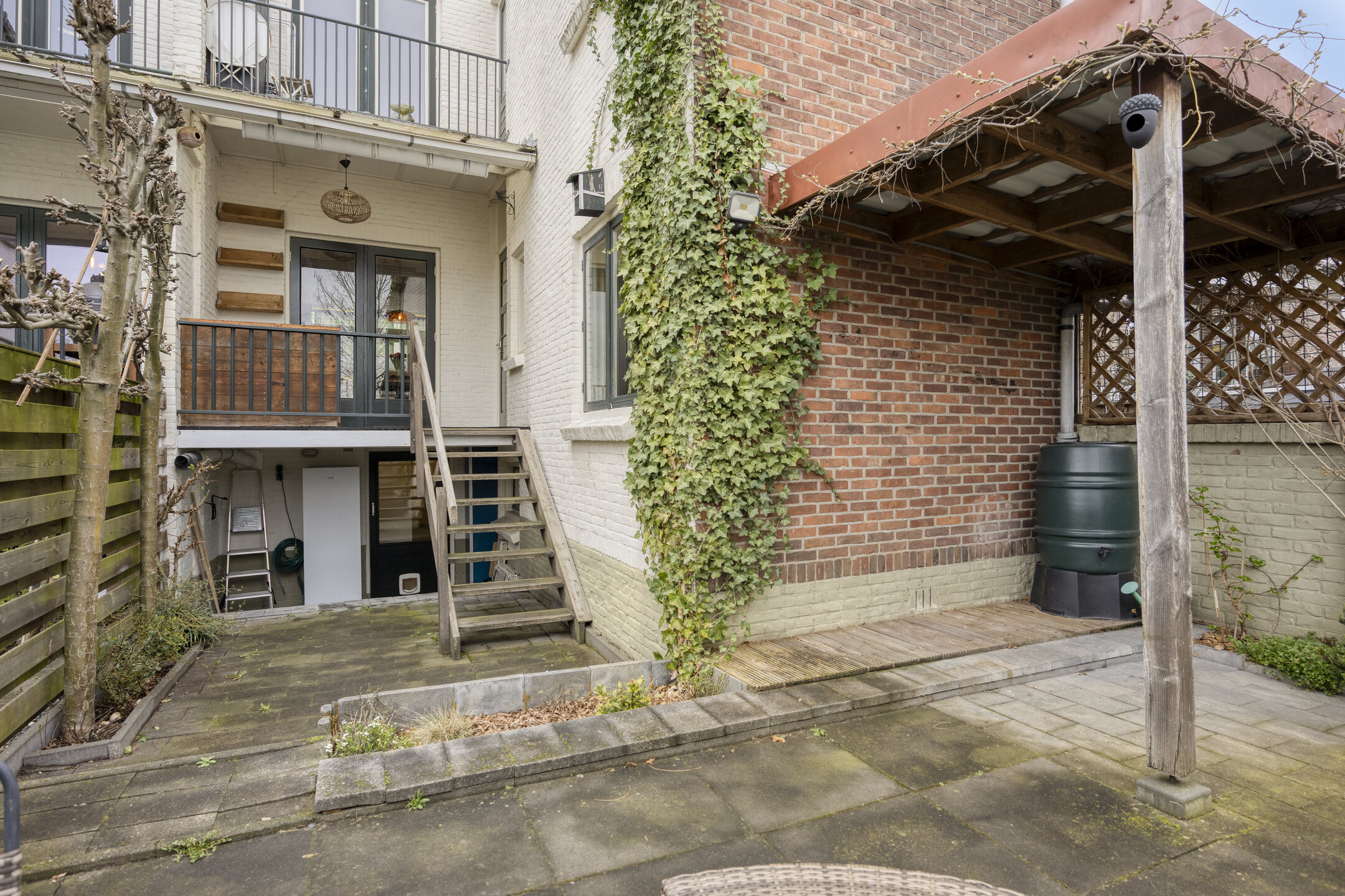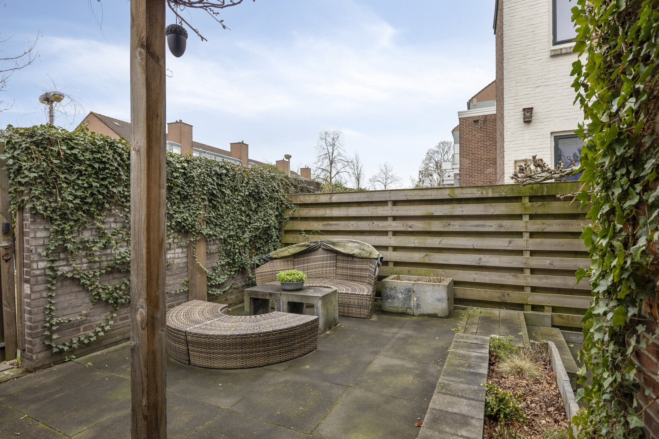 De zonnige tuin met achterom biedt volop privacy en is een fijne plek om te ontspannen of gezellig buiten te zitten.
