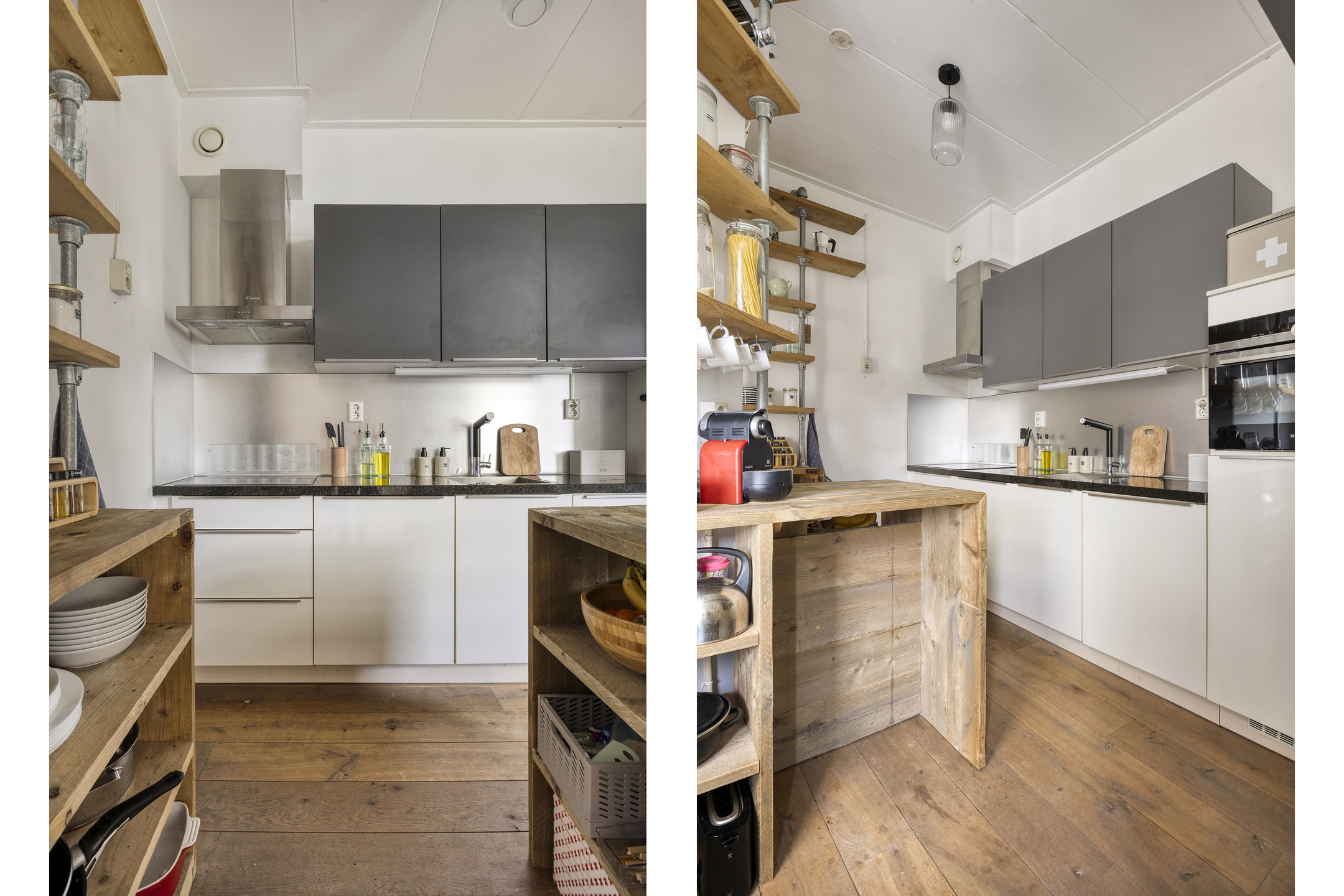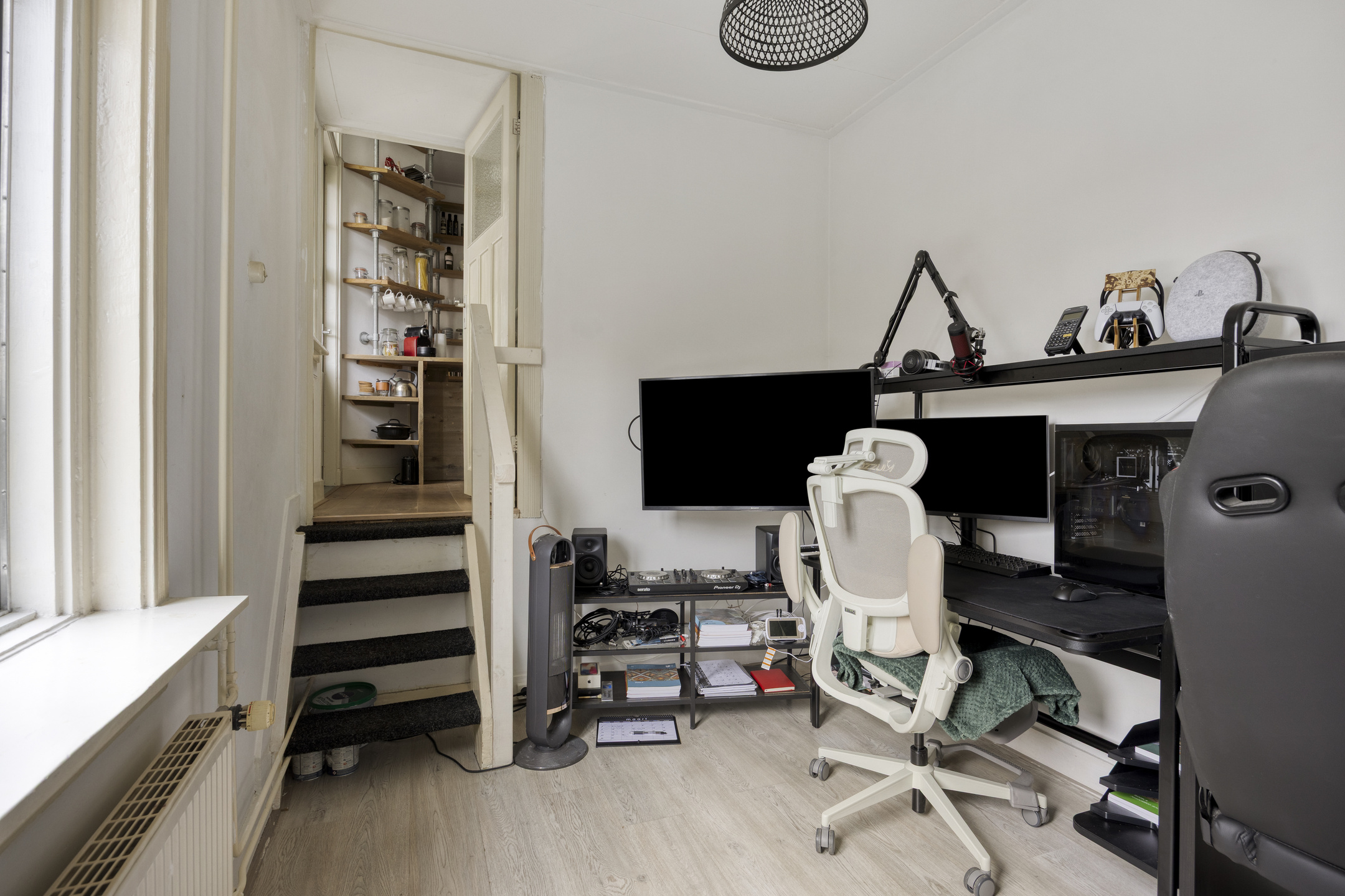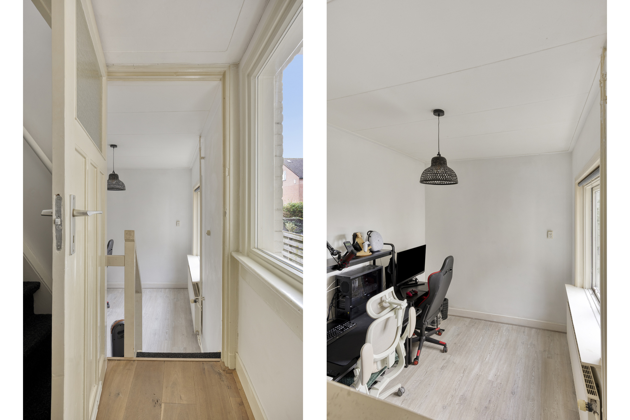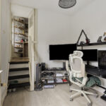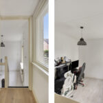 Achter de keuken bevindt zich een speelse split level indeling met twee extra kamers. Eén kamer is momenteel ingericht als slaapkamer en de andere als werkkamer, maar beide ruimtes zijn flexibel in te delen naar wens.
