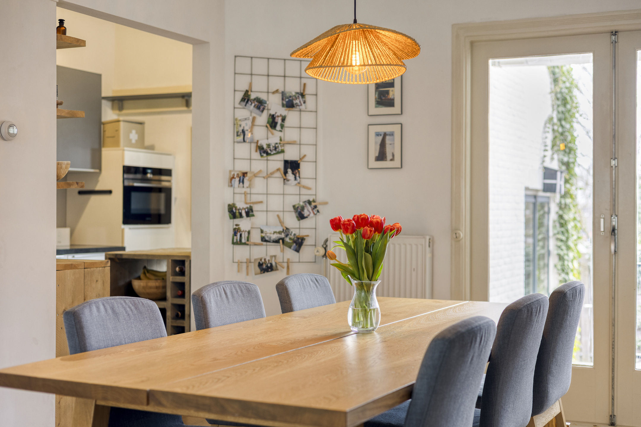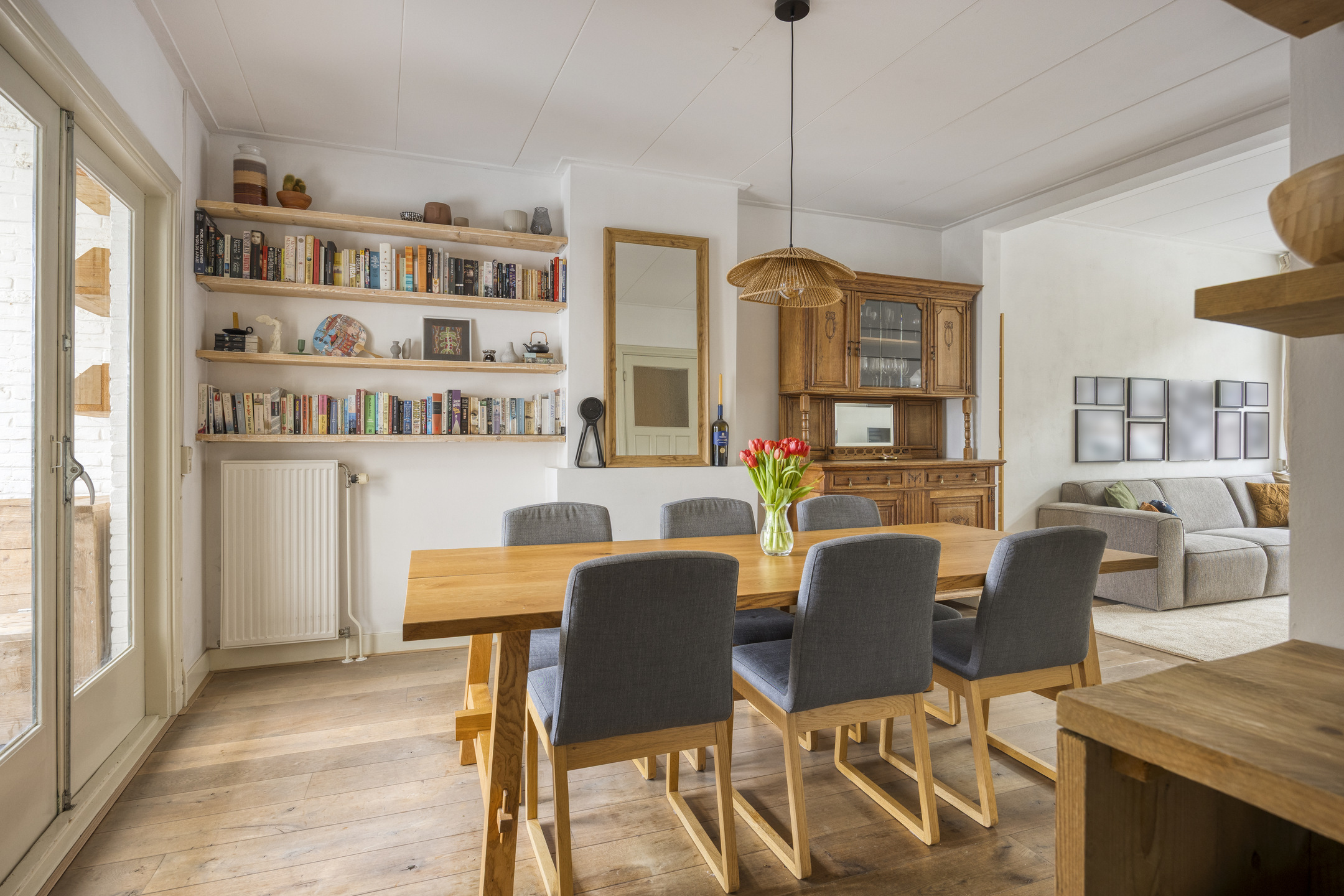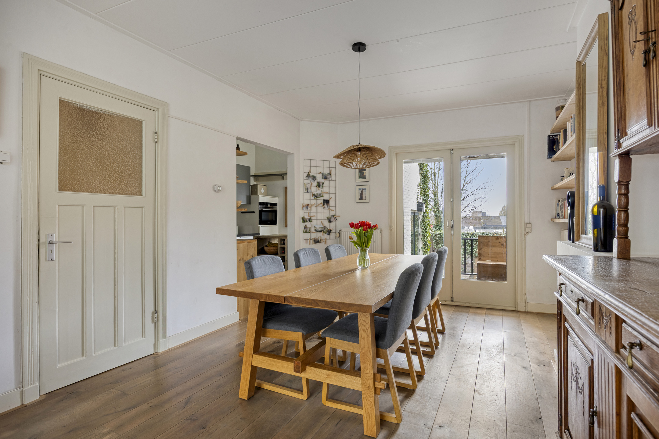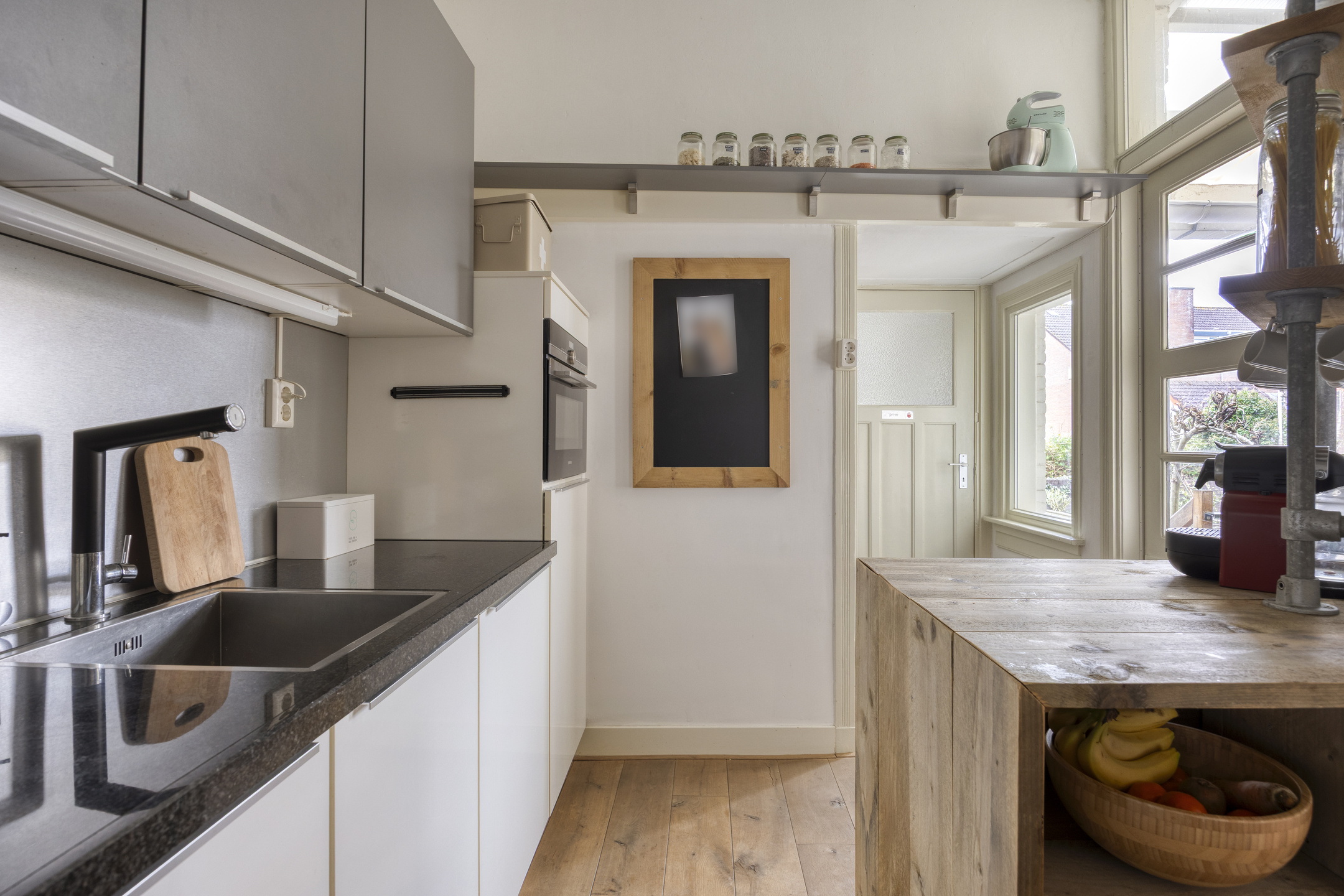 Via de hal met toilet kom je in de lichte woonkamer, waar openslaande deuren zorgen voor een prettige verbinding met het terras en de tuin. De halfopen keuken is geplaatst in 2016 en in 2025 voorzien van een nieuwe inductiekookplaat, granieten werkblad en vaatwasser.