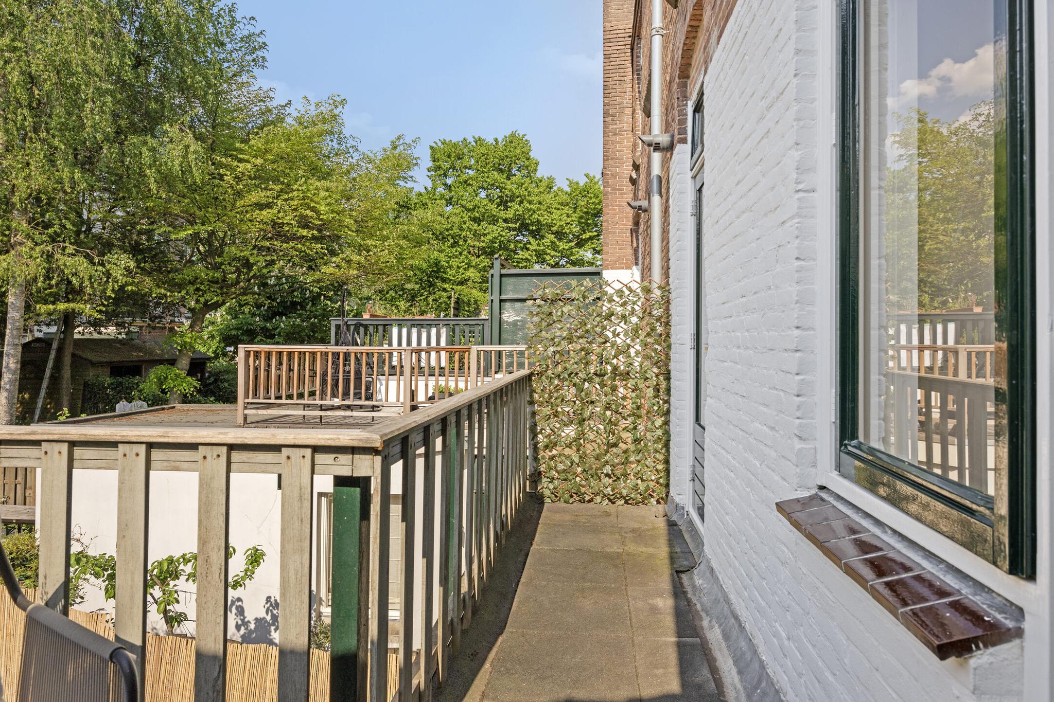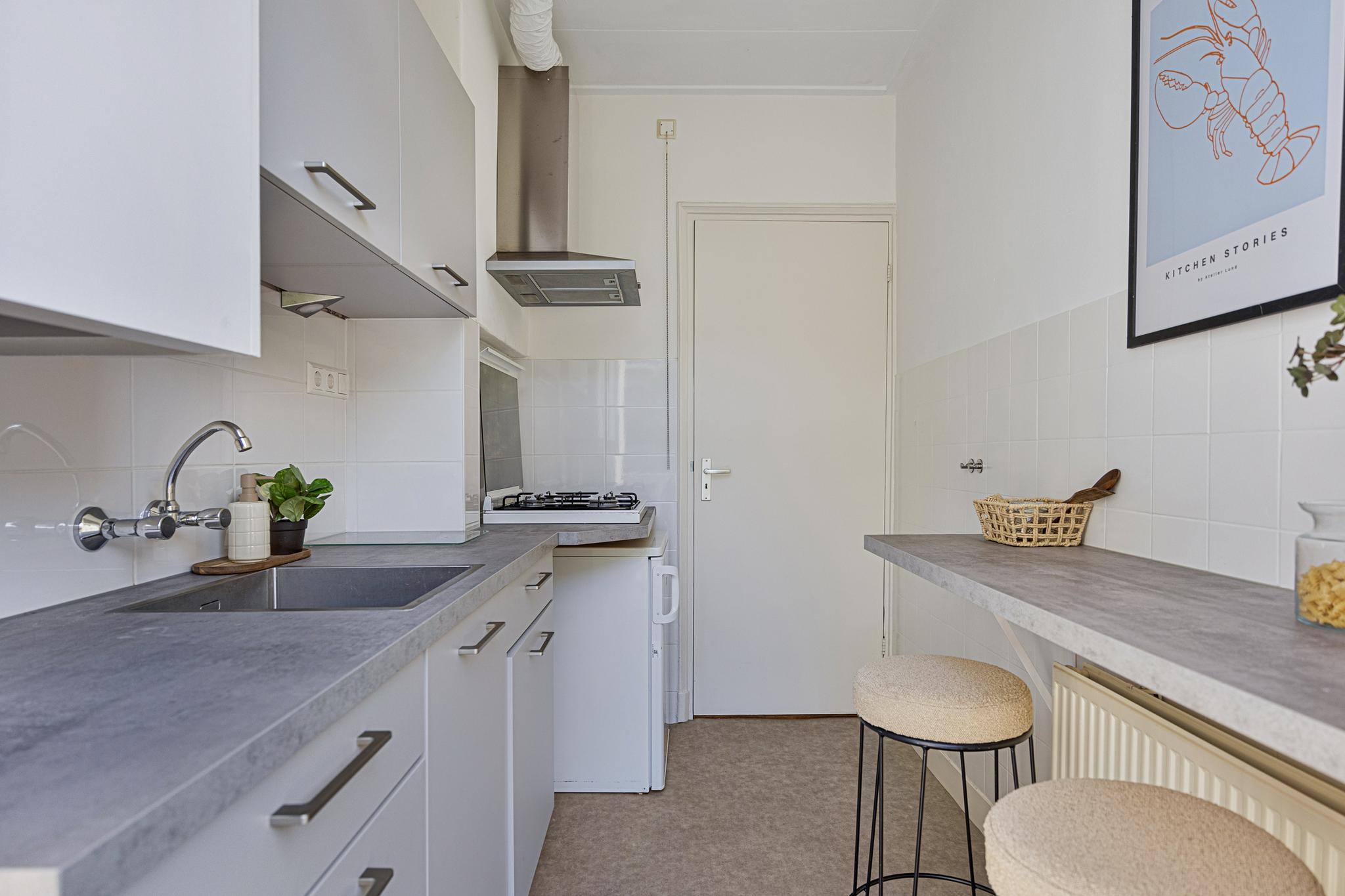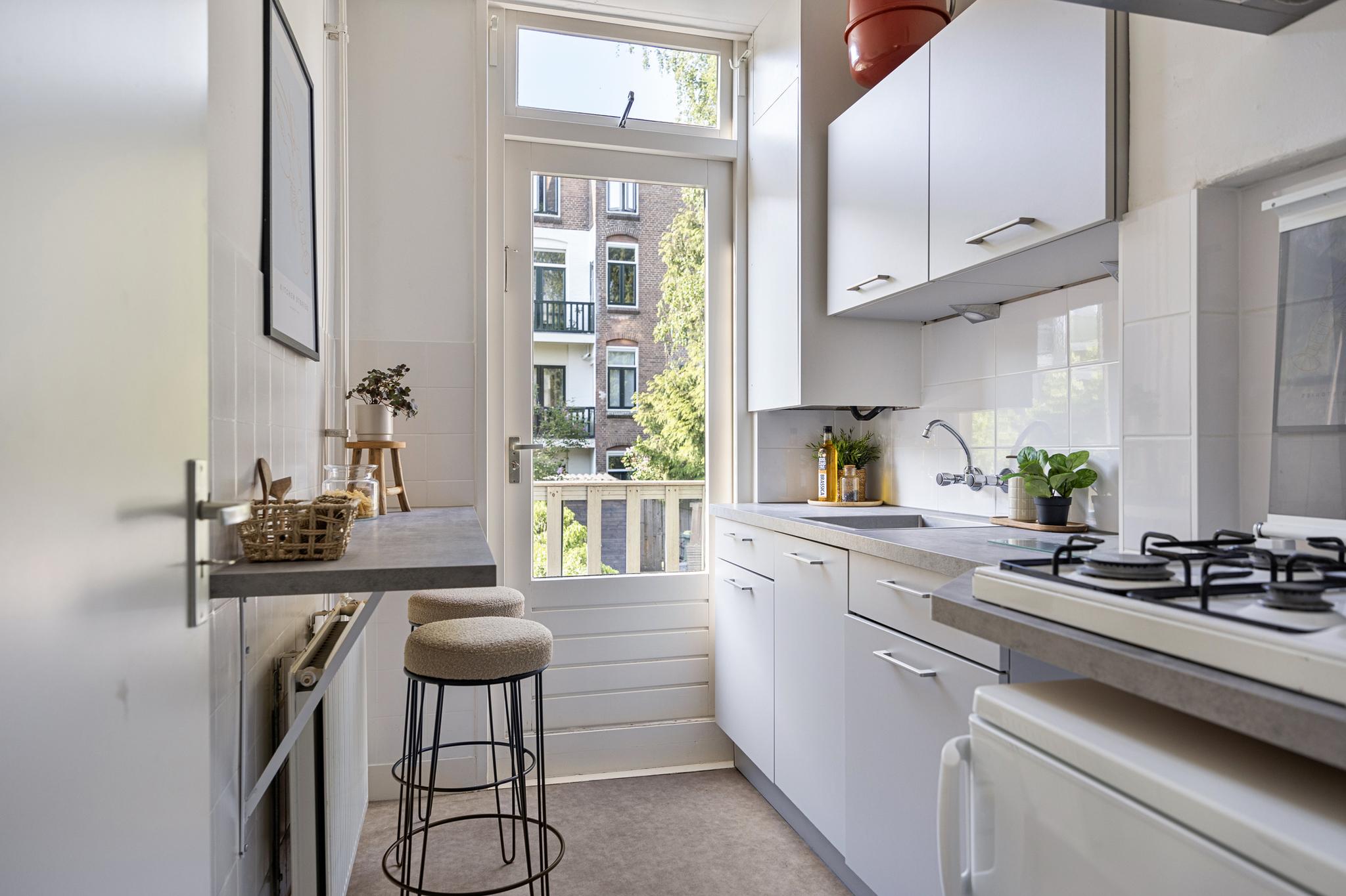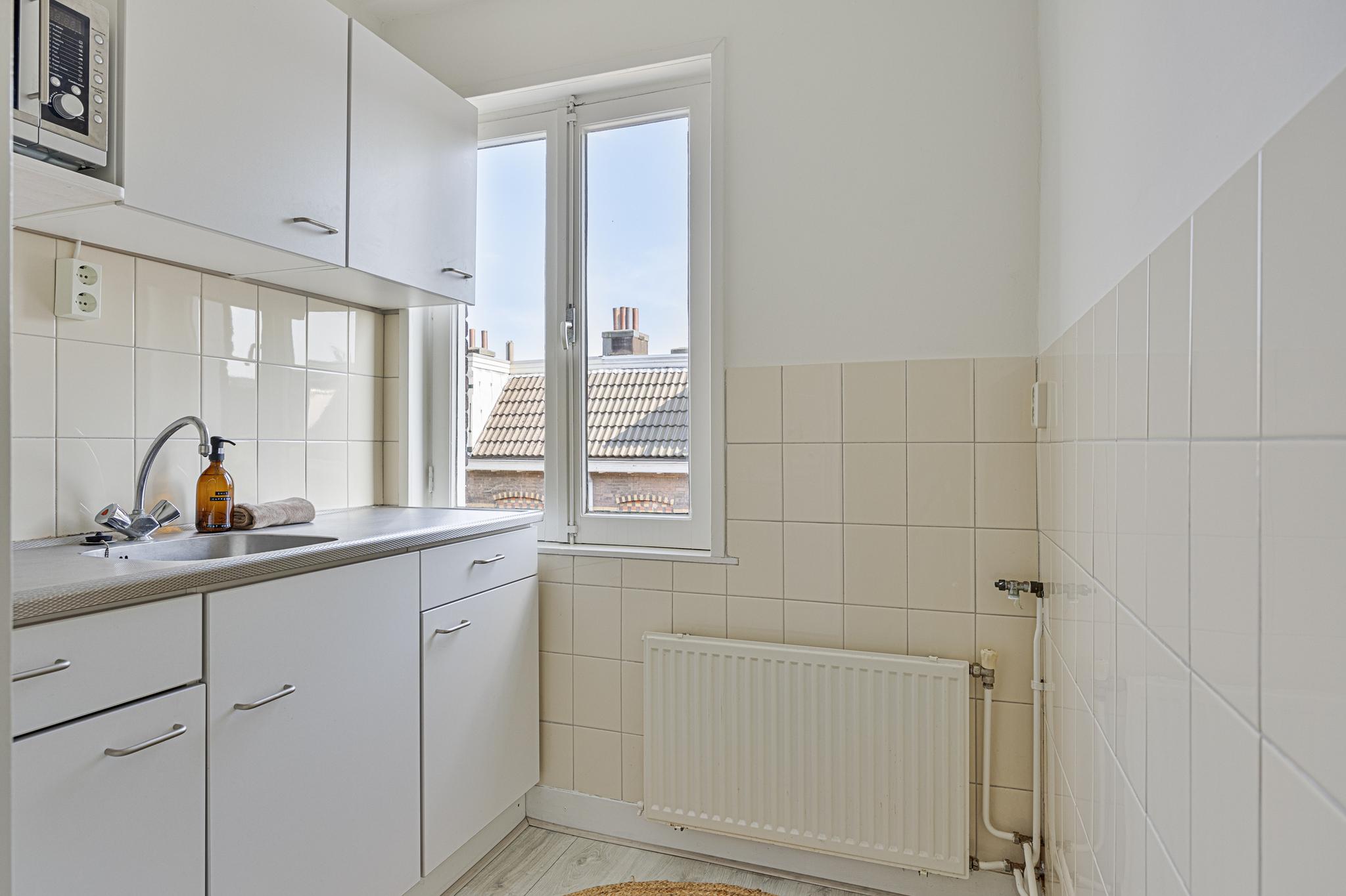 Overloop, toilet, dichte nette keuken uit 2021 met deur naar balkon, woonkamer, badkamer met douche, wastafel en afvoer wasmachine (kan bijv. eenvoudig werkkamer van gemaakt worden). De sfeervolle woonkamer, voormalig kamer-en-suite, kenmerkt zich door de fijne lichtinval en geeft eveneens toegang tot het balkon. Op het balkon word je verrast door de rust en met ‘groen uitzicht’ kun je na een werkdag heerlijk genieten van de avondzon.