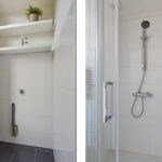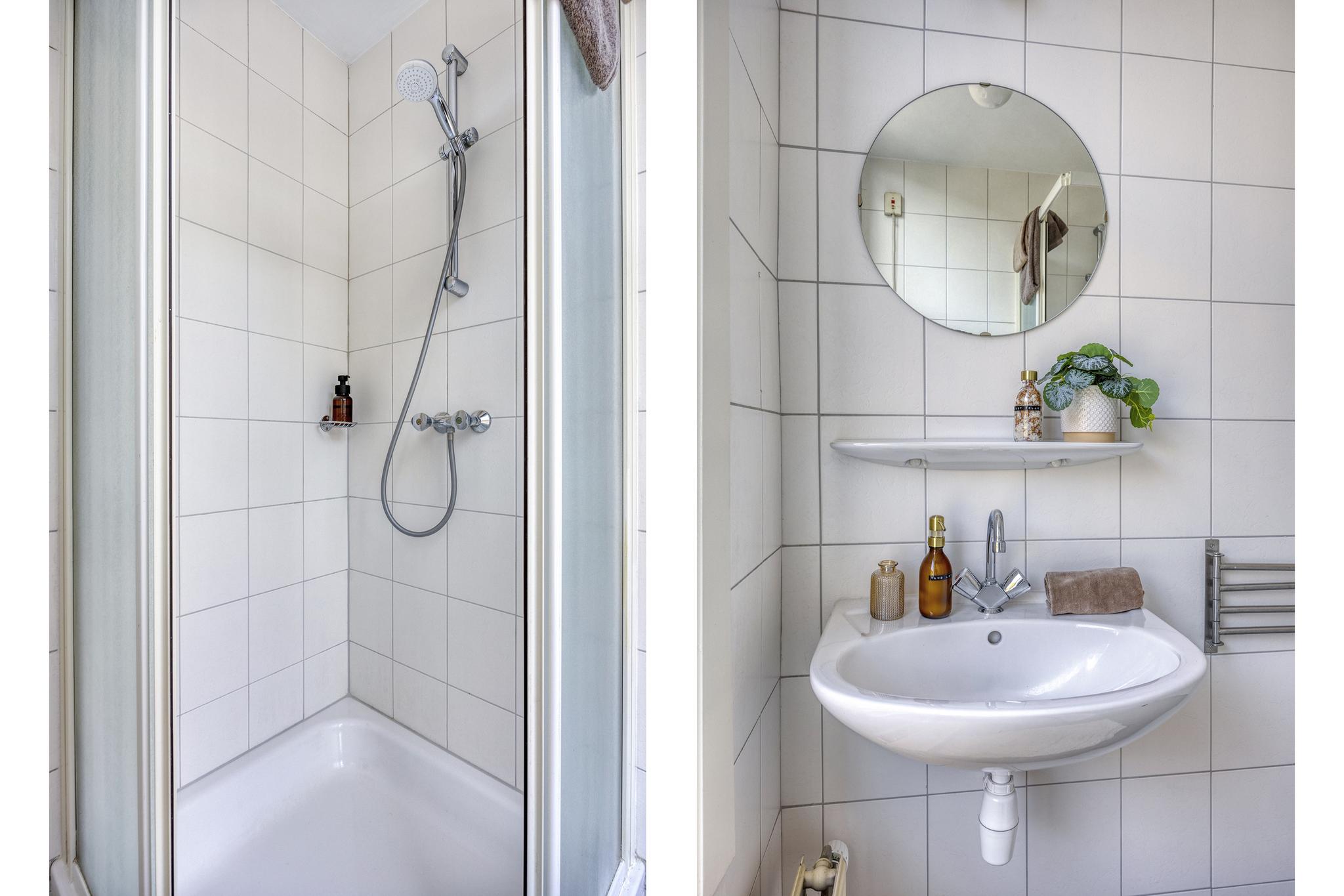 Overloop, ruime badkamer met toilet, douche, wastafel en wasmachine-aansluiting, 2 riante lichte slaapkamers van 13m2 en 9m2 met daarbij nog de mogelijkheid om een extra werkkamer of inloopkast te creëren. (momenteel nu een keuken).