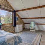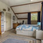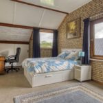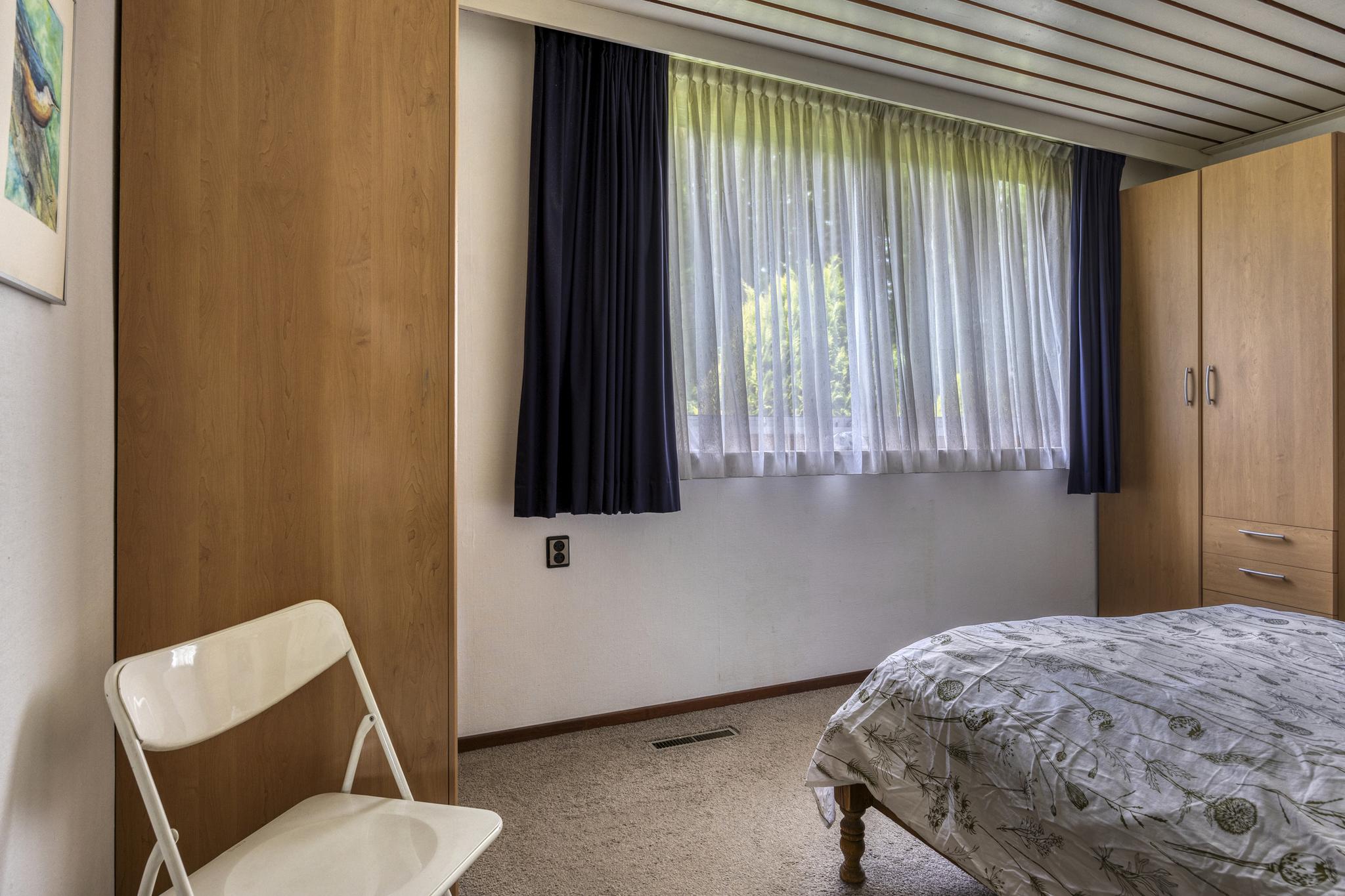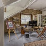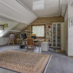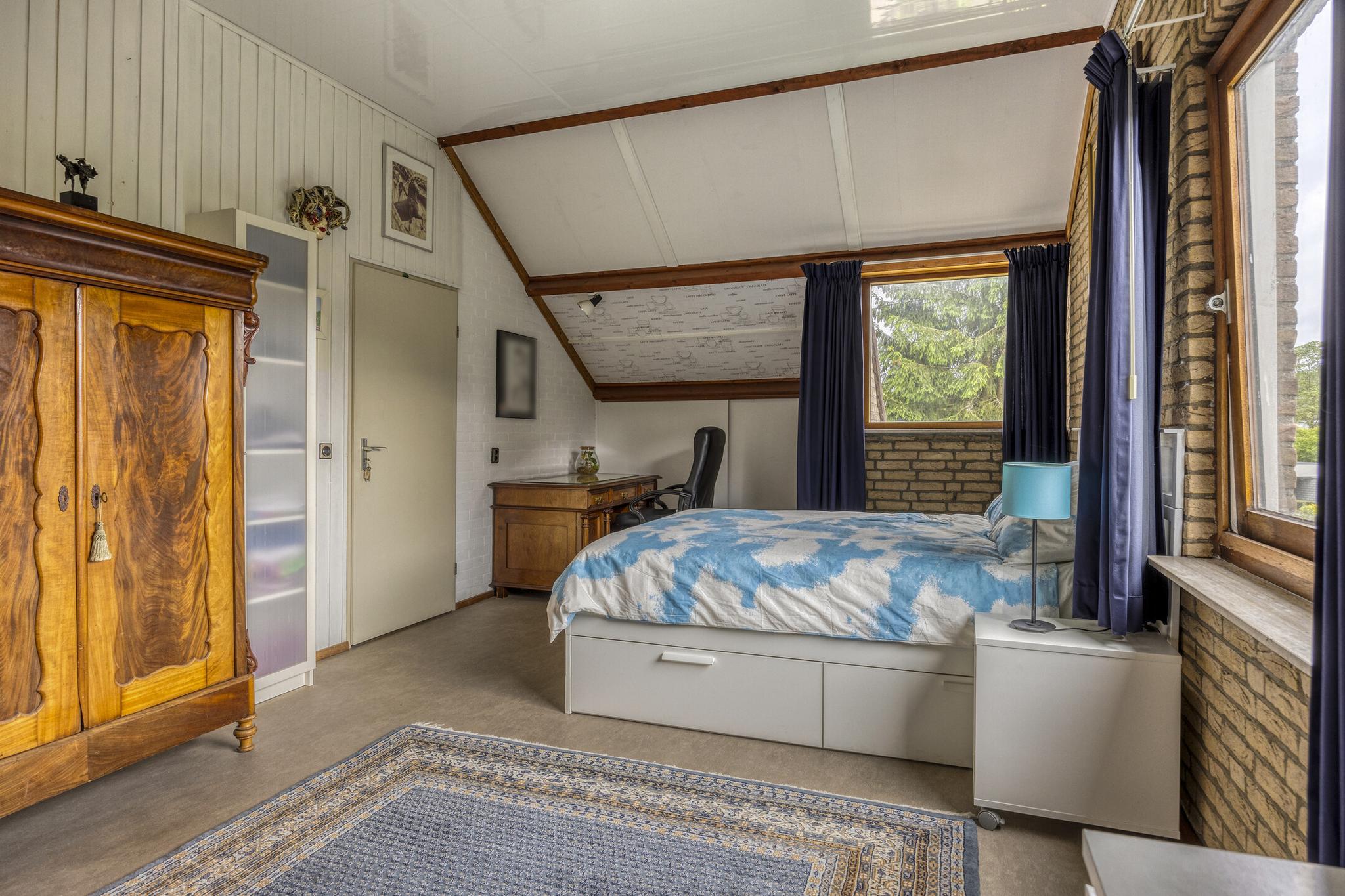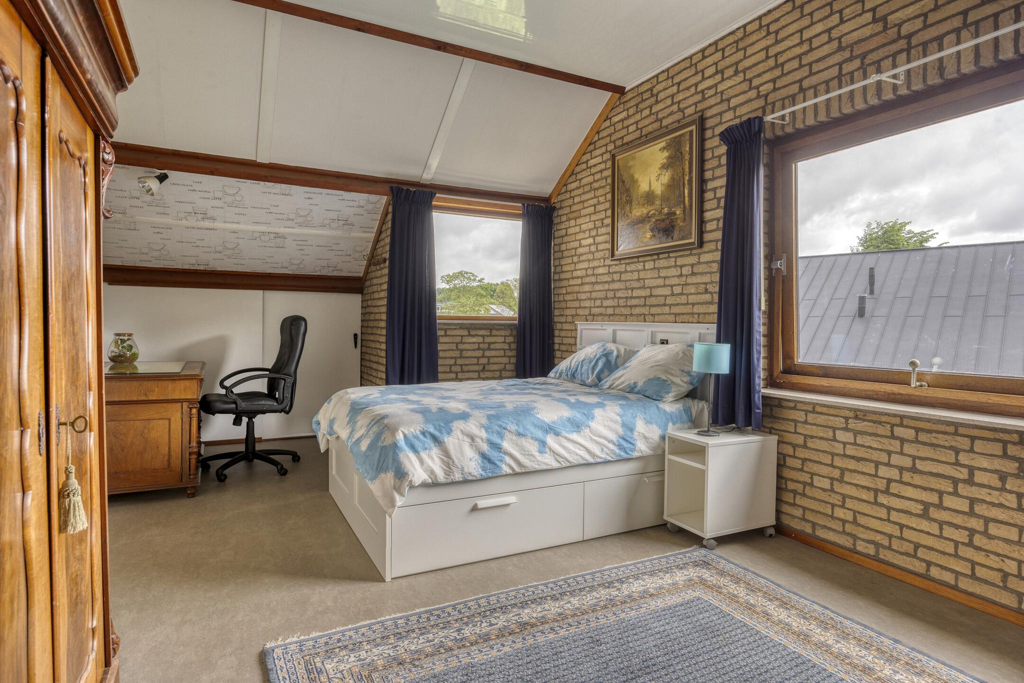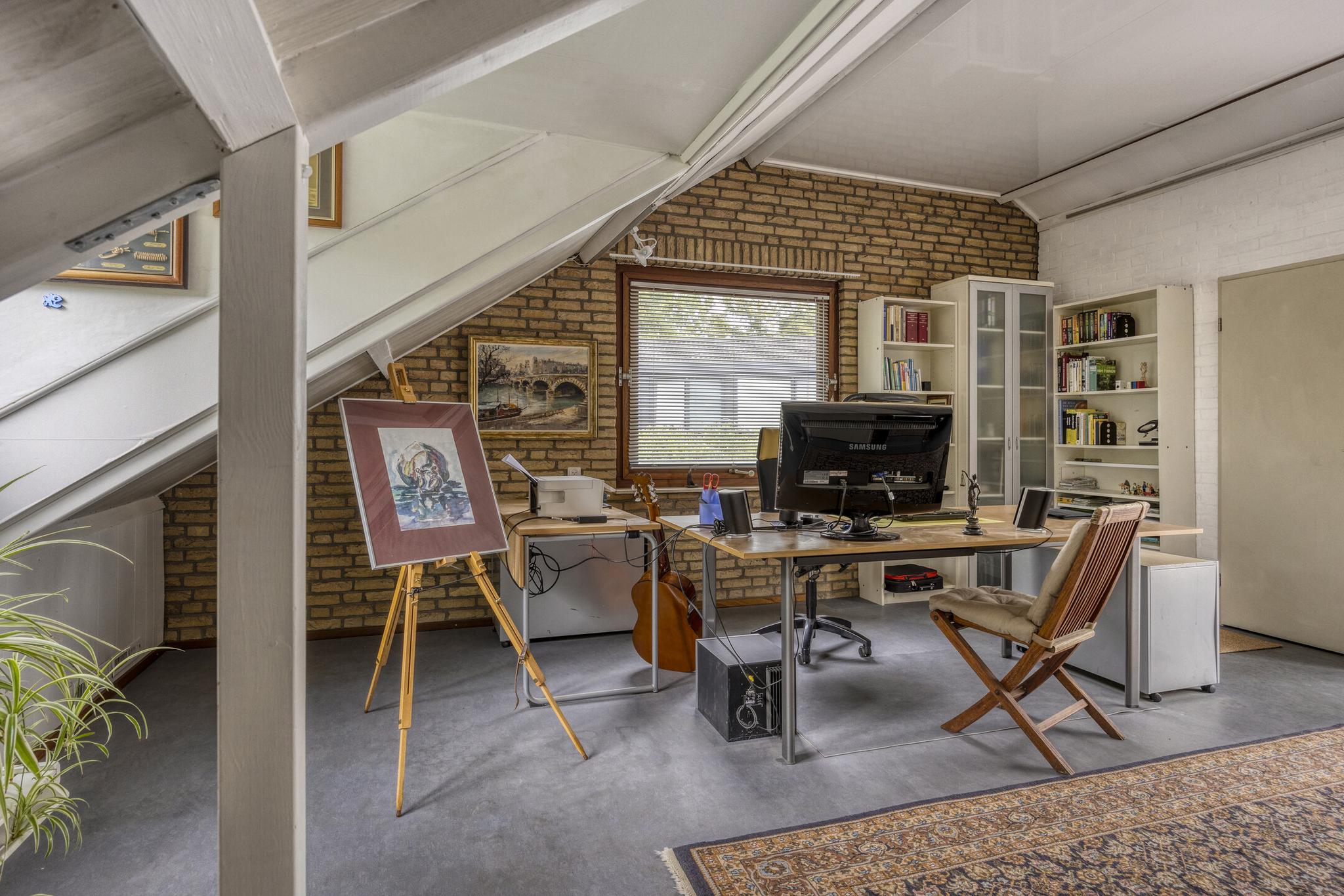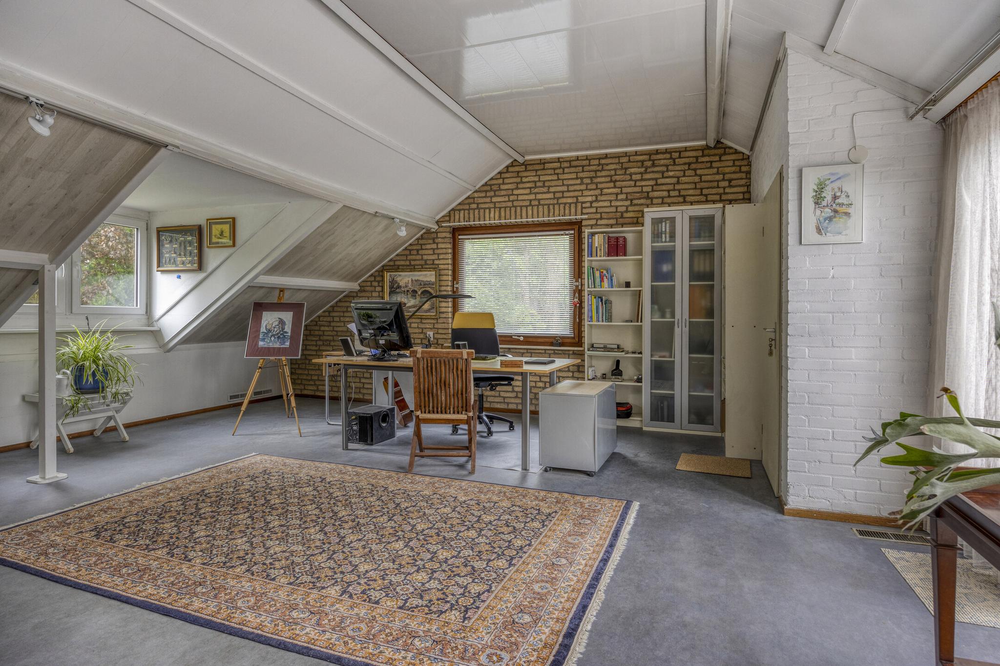 De bovenverdieping biedt een open ruimte die momenteel dienst doet als kantoor of extra slaapkamer. Aansluitend bevinden zich nog een volwaardige slaapkamer, twee ruime bergruimtes en een balkon met uitzicht op het groene perceel.
