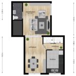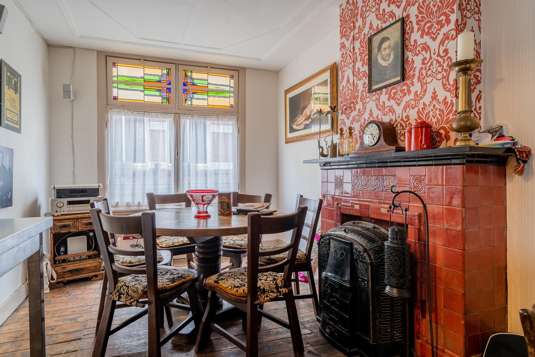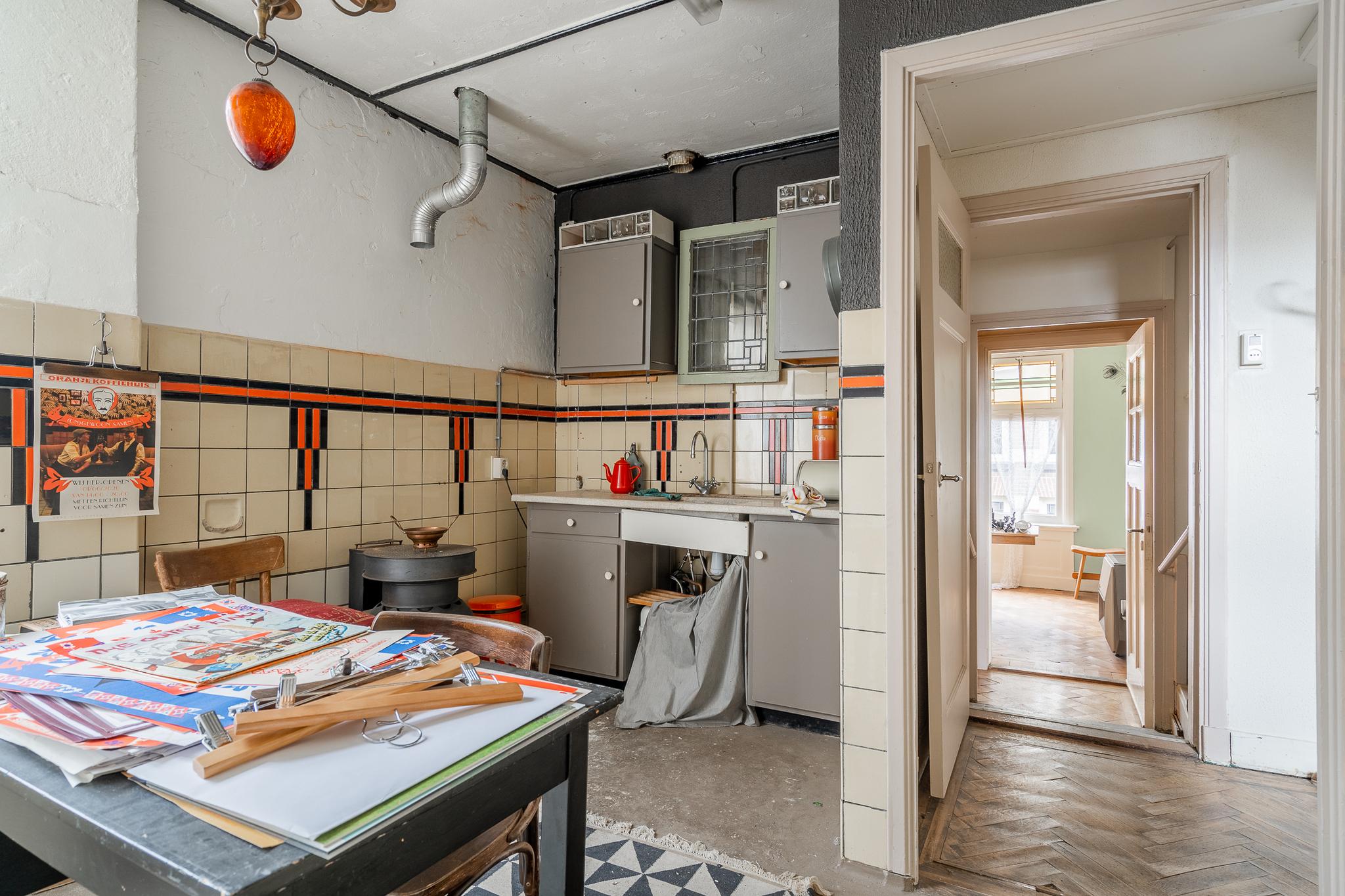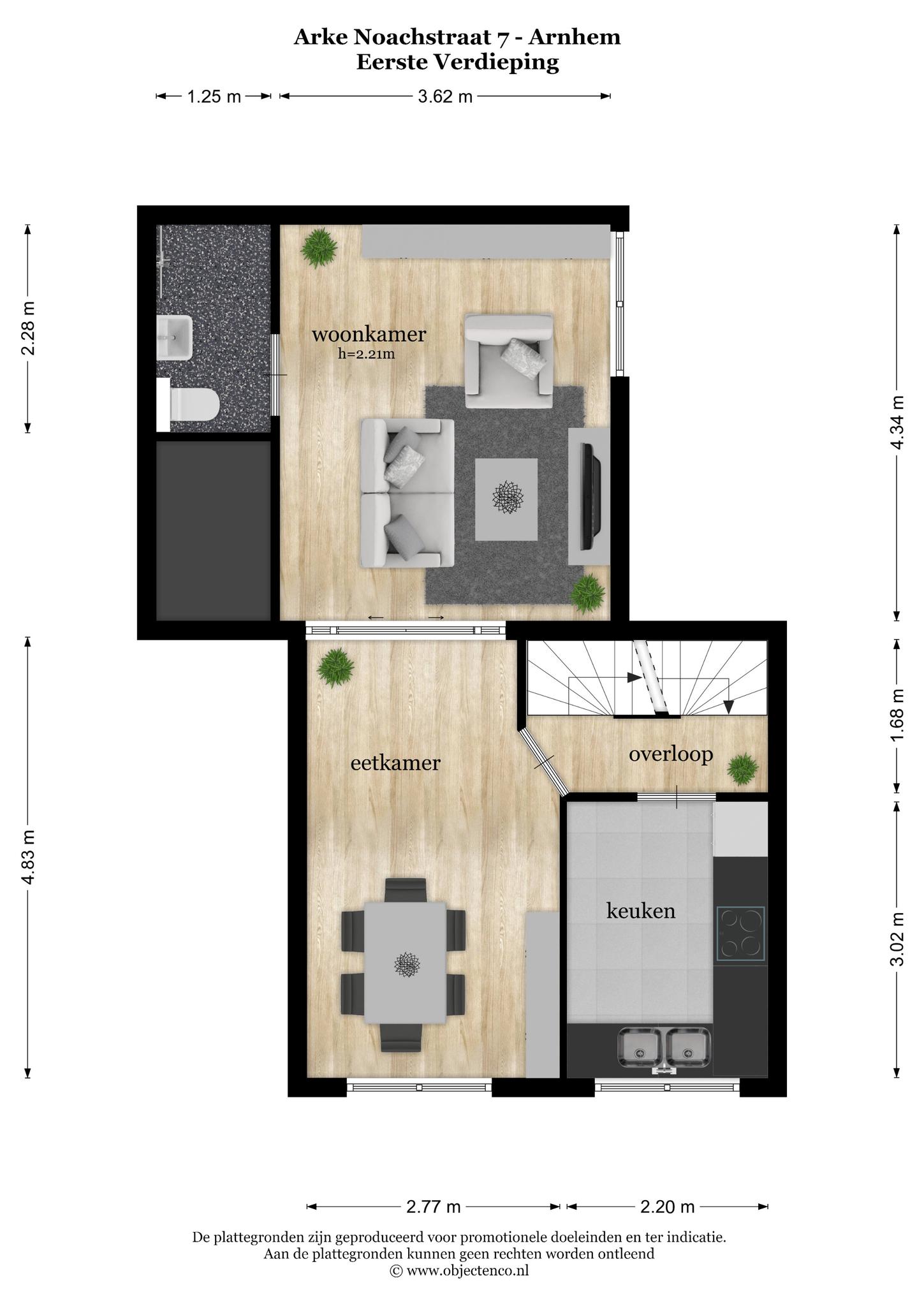 Overloop, keuken, eetkamer, woonkamer, toilet en trapopgang naar de tweede verdieping.