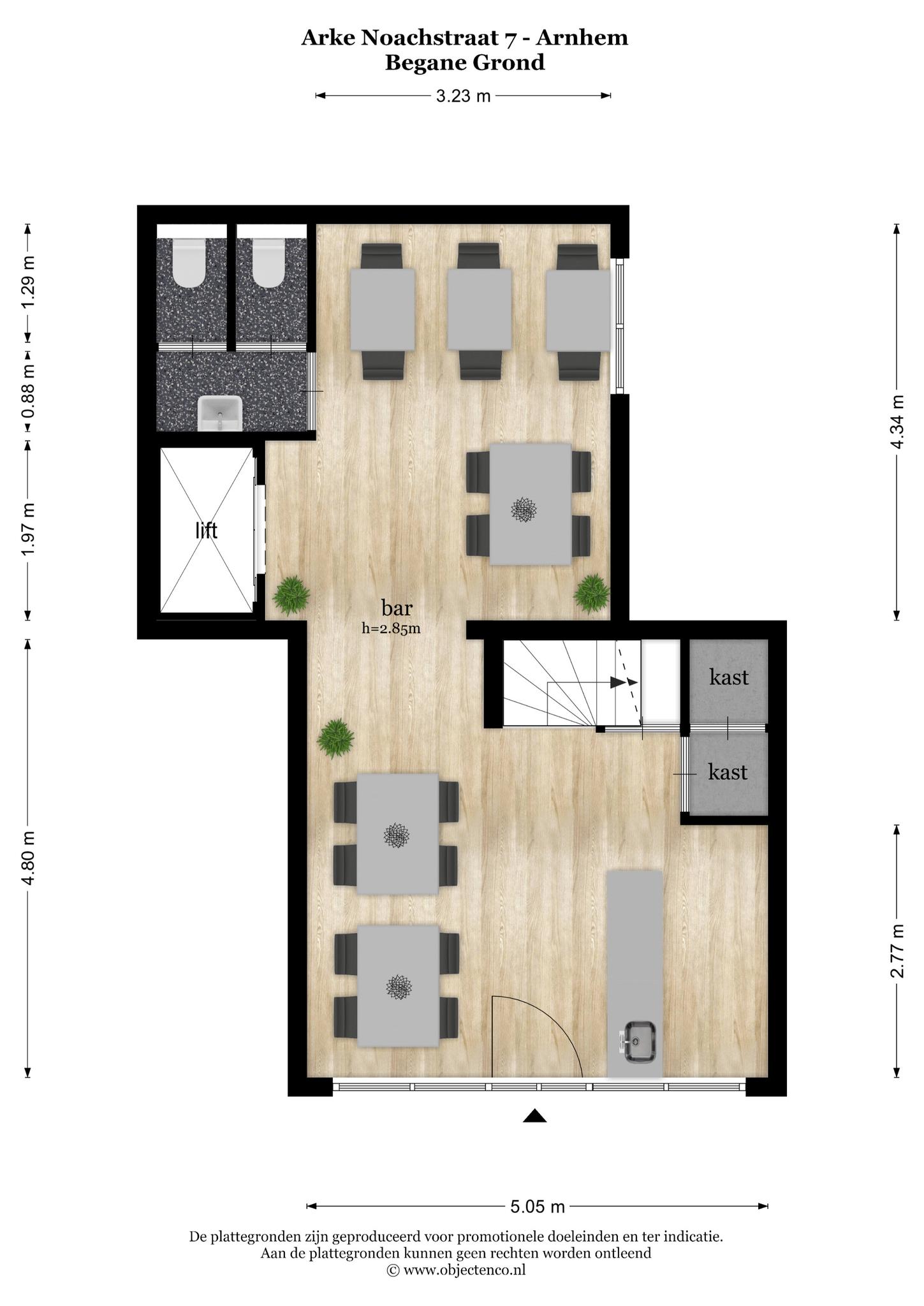 Entree, bar, toegang tot de kelder, trapopgang naar de eerste verdieping, liftschacht, gang en toiletgroep voorzien van twee toiletten.