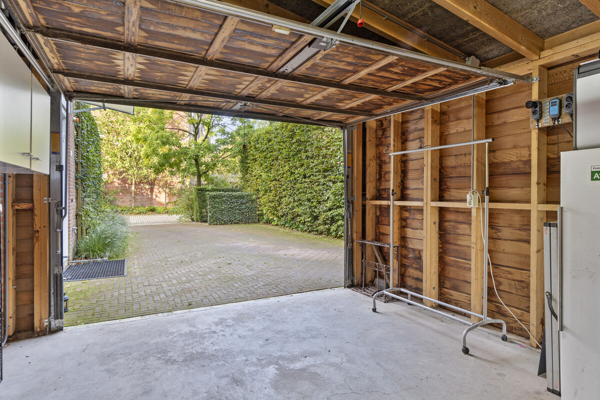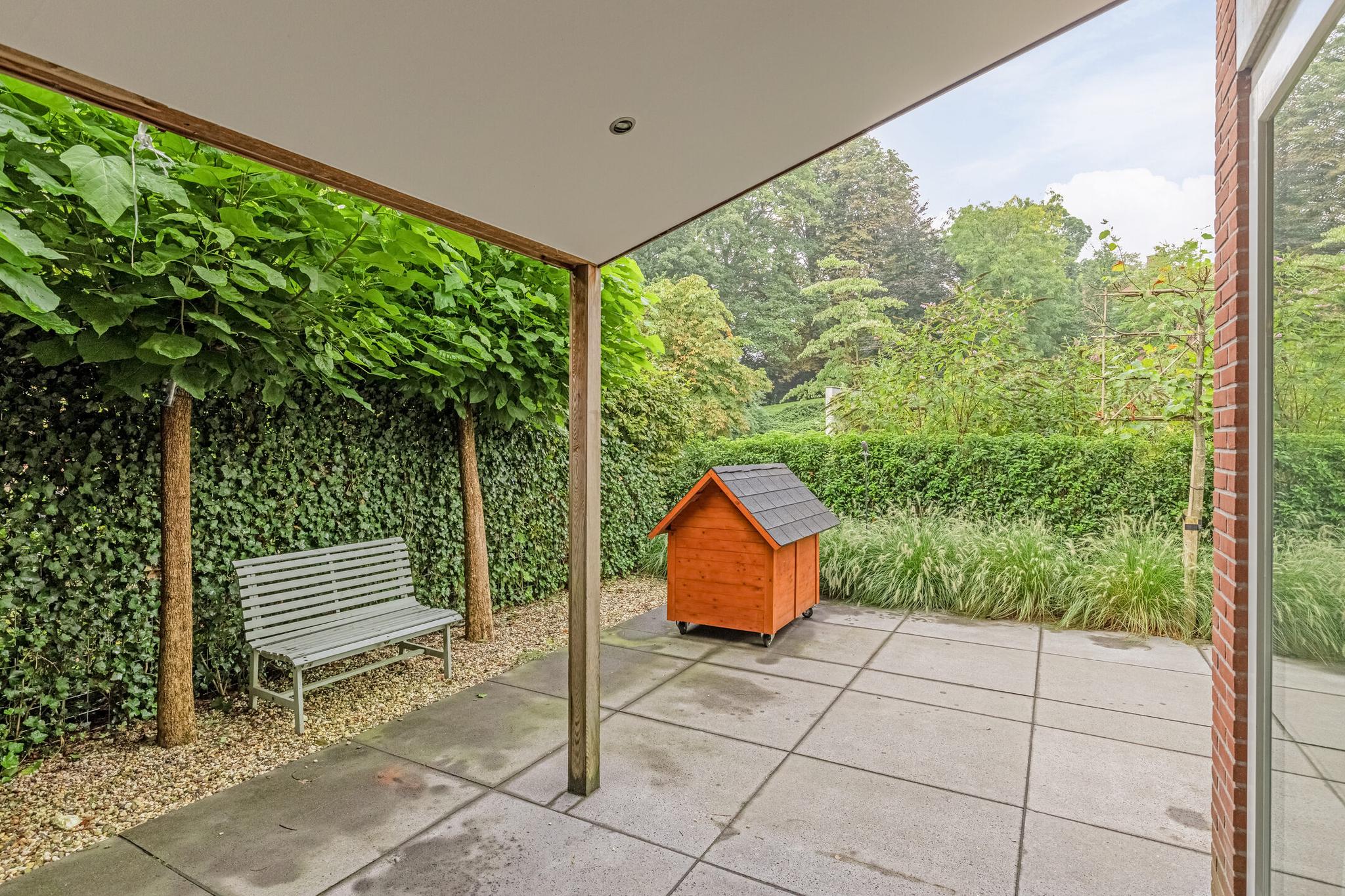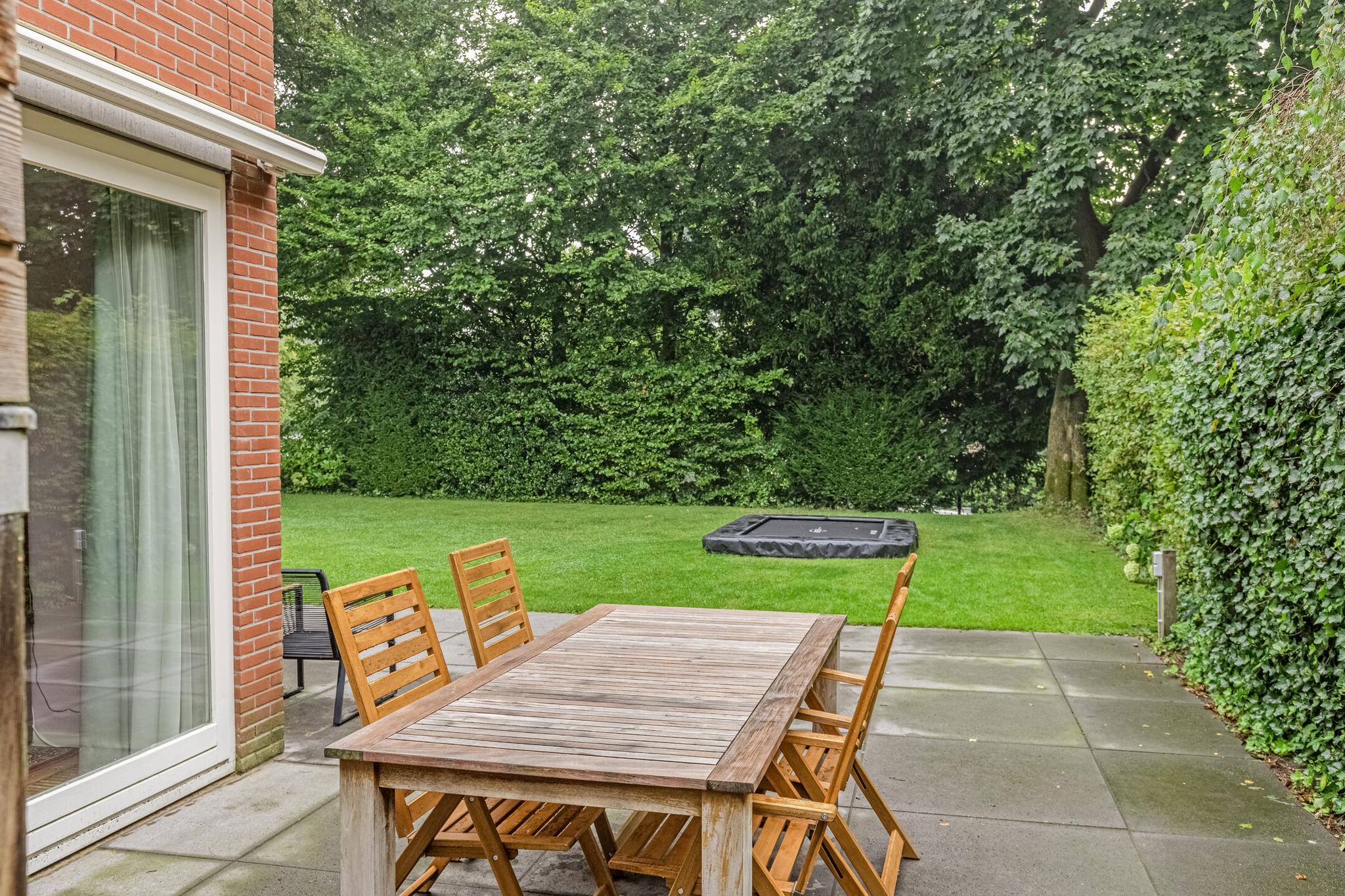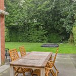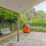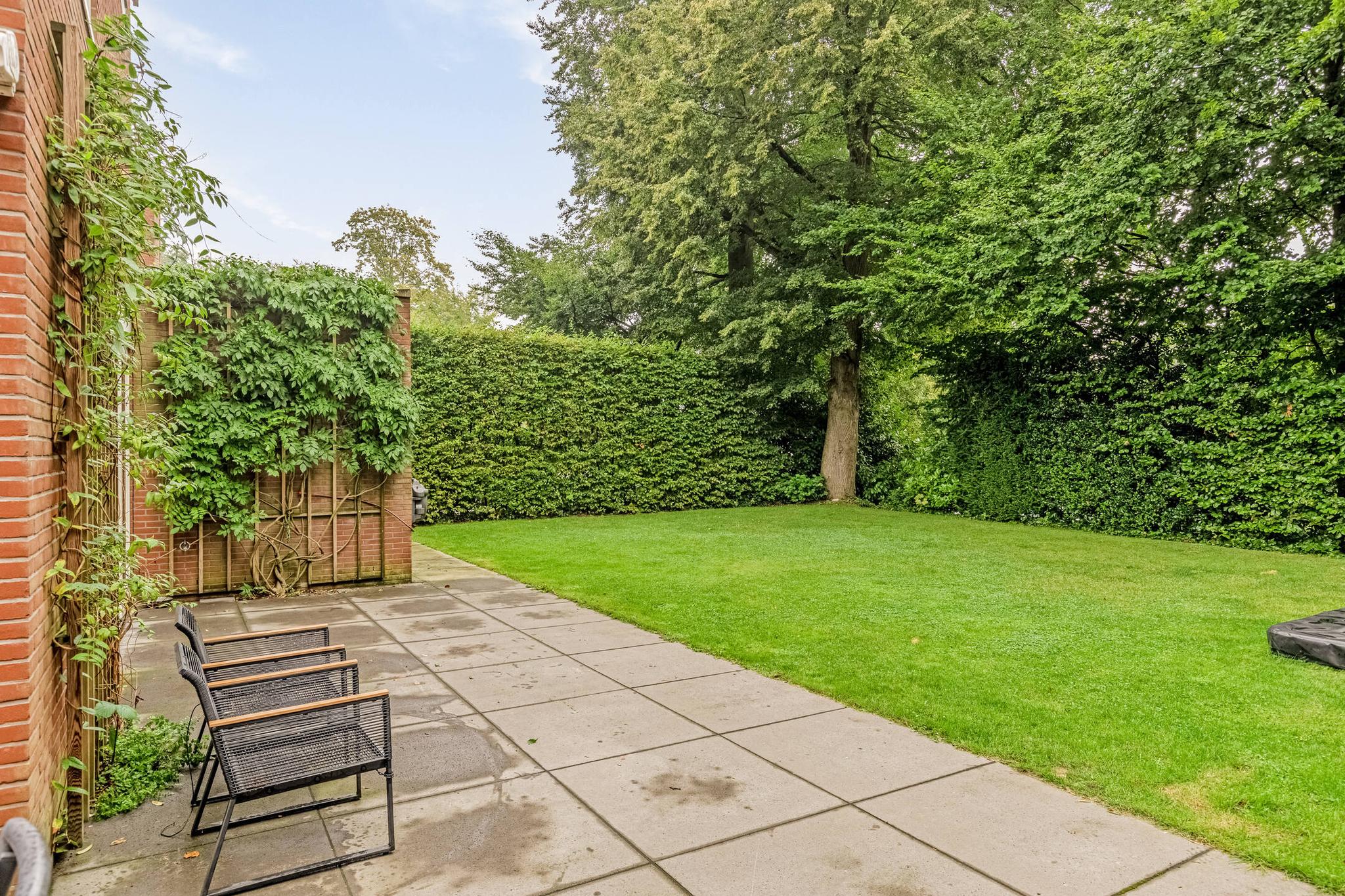 Het eerst terras is overdekte en beschikt over spotjes en een heater. Hier kunt u op elk moment in het jaar buiten zitten en genieten van de groene tuin. De rest van de achtertuin is voorzien van borders, gazon, zitplekjes, berging, overdekte fietsenstalling en een achterom.