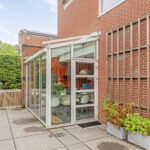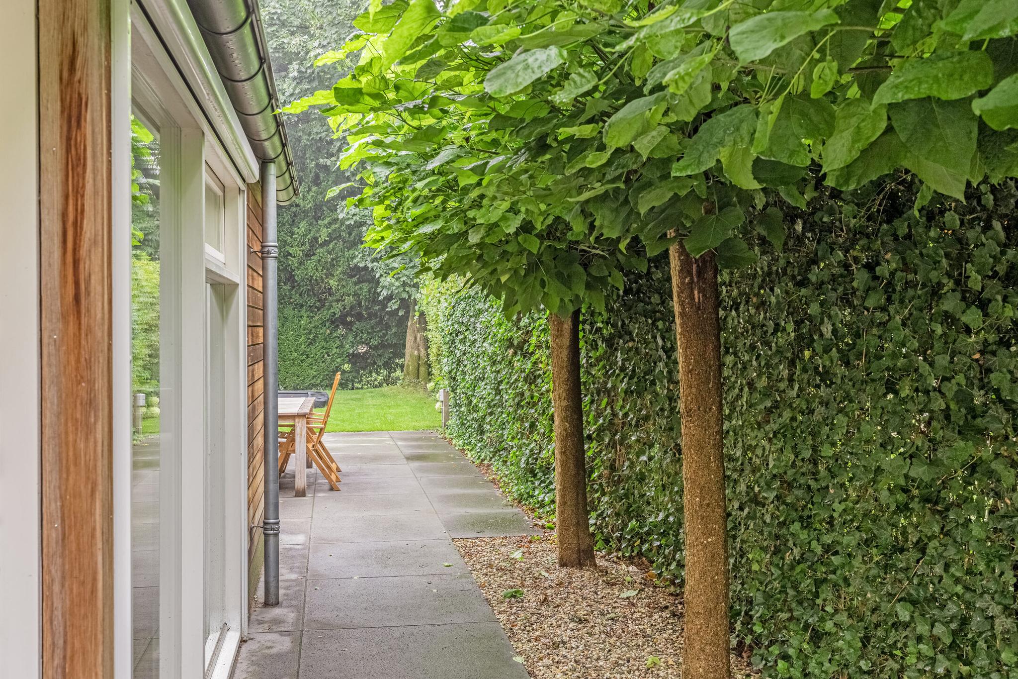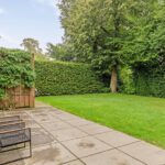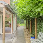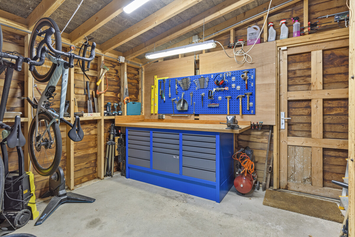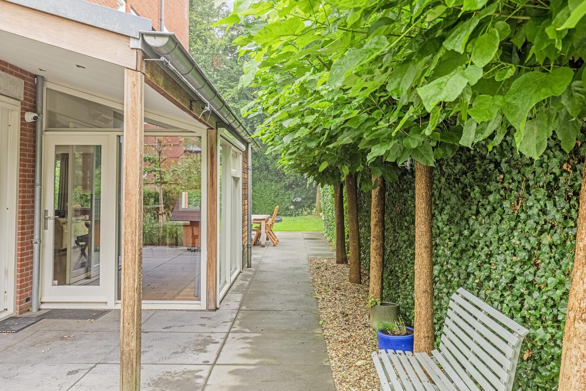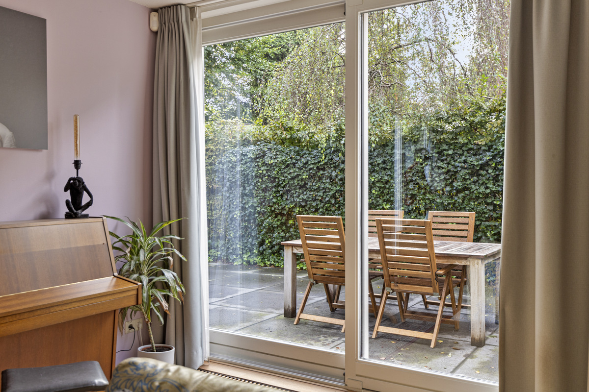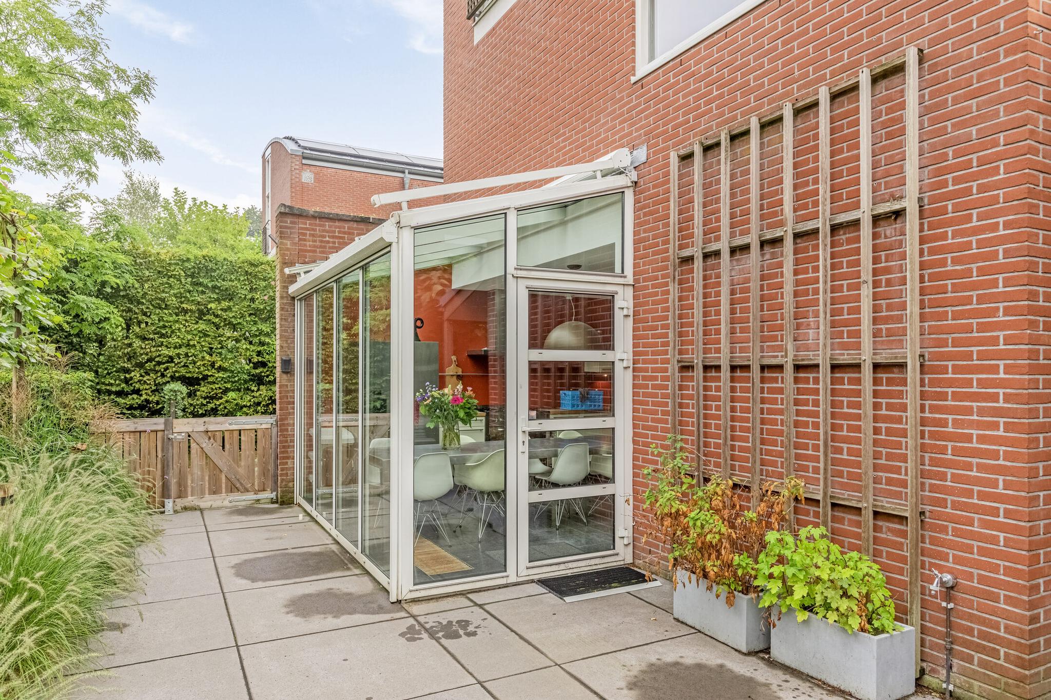 Het eerst terras is overdekte en beschikt over spotjes en een heater. Hier kunt u op elk moment in het jaar buiten zitten en genieten van de groene tuin. De rest van de achtertuin is voorzien van borders, gazon, zitplekjes, berging, overdekte fietsenstalling en een achterom.