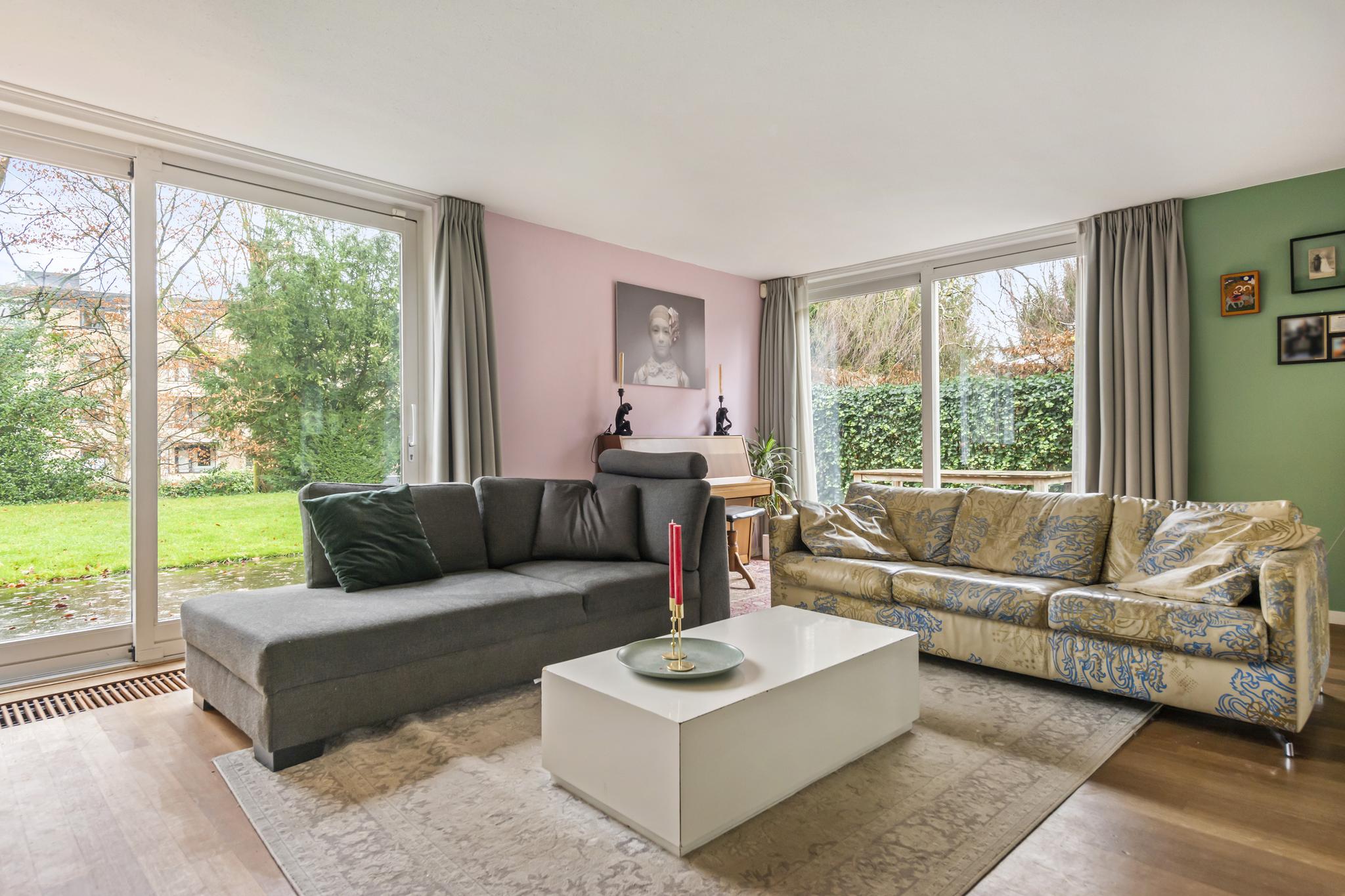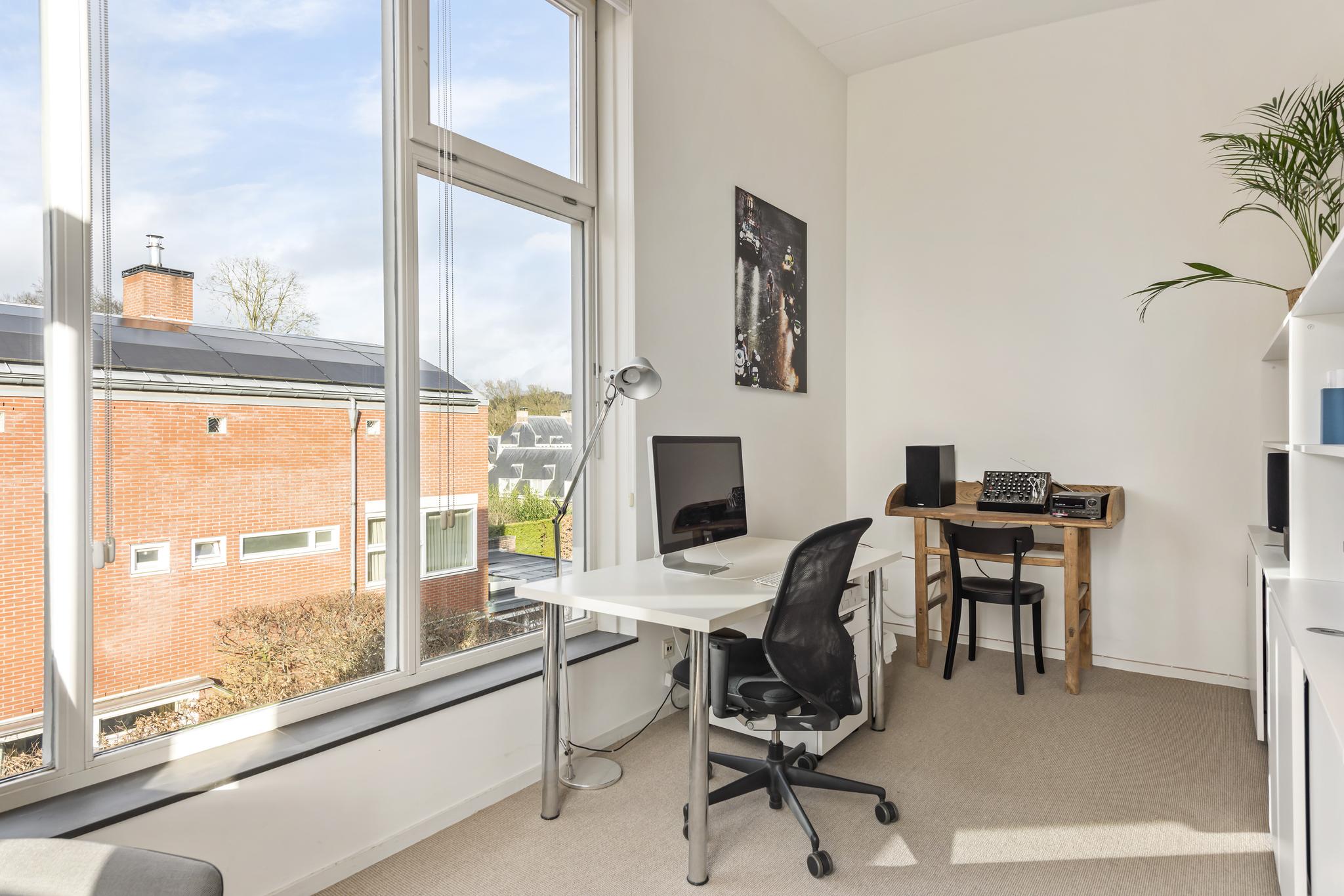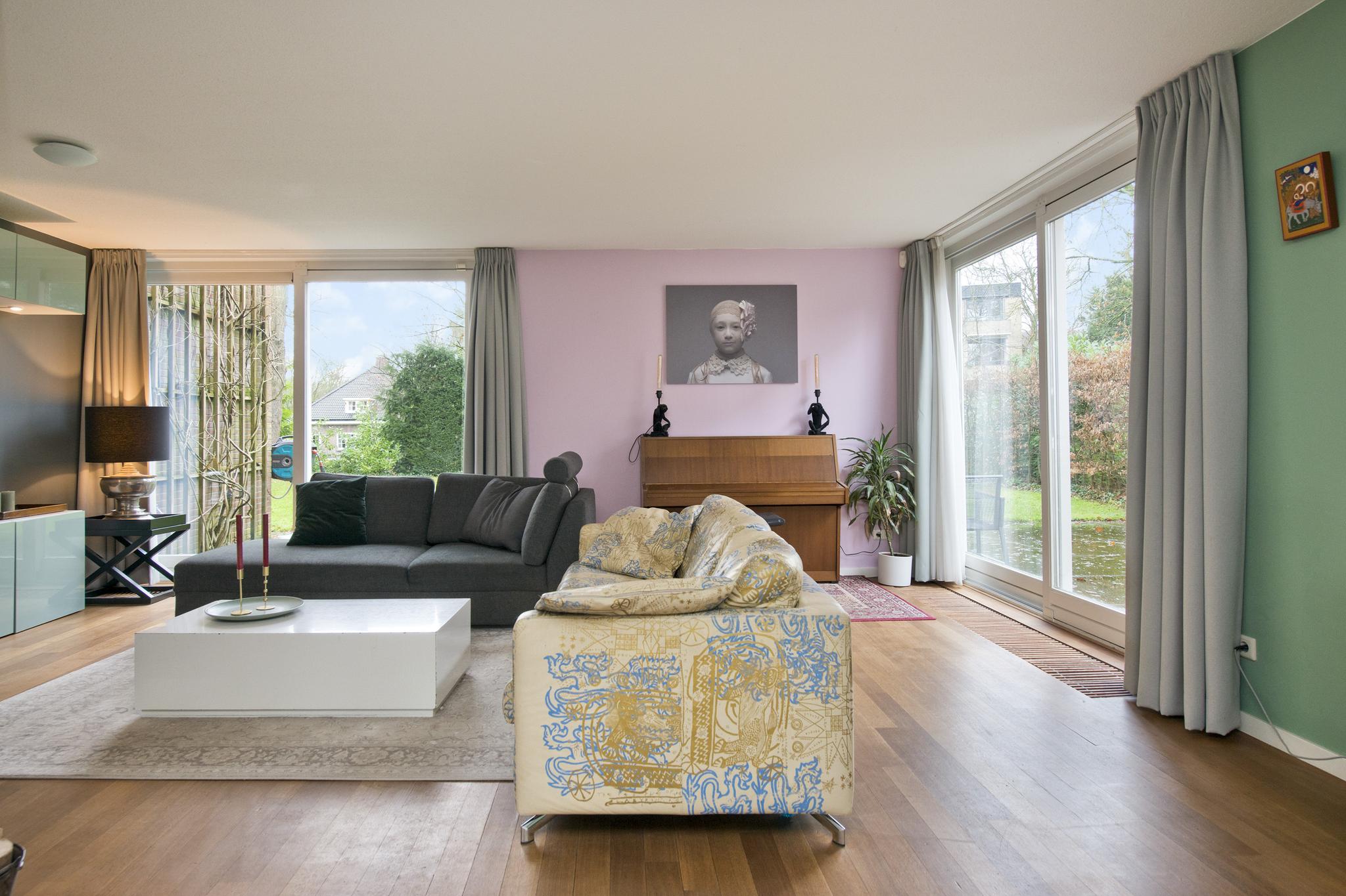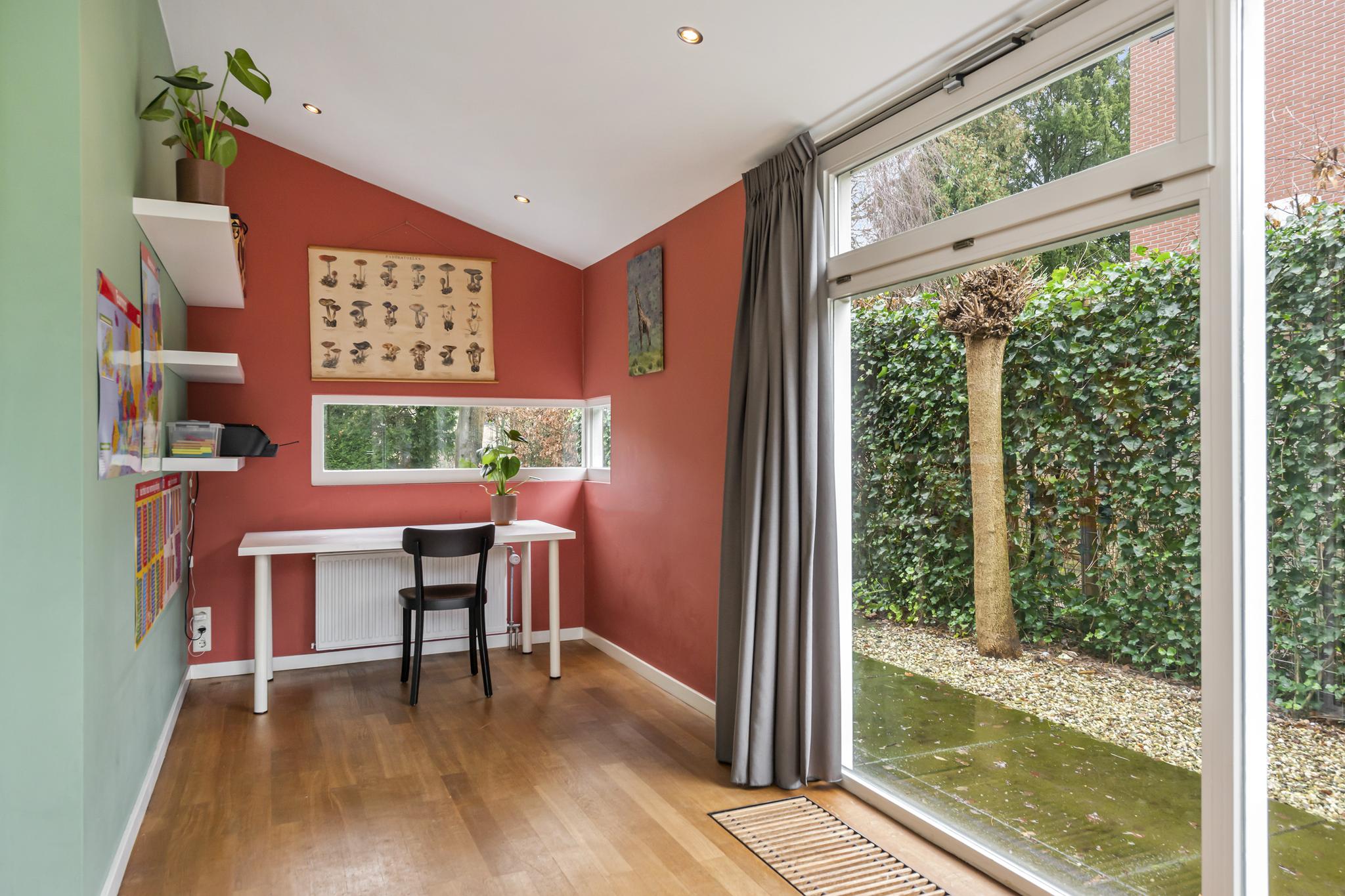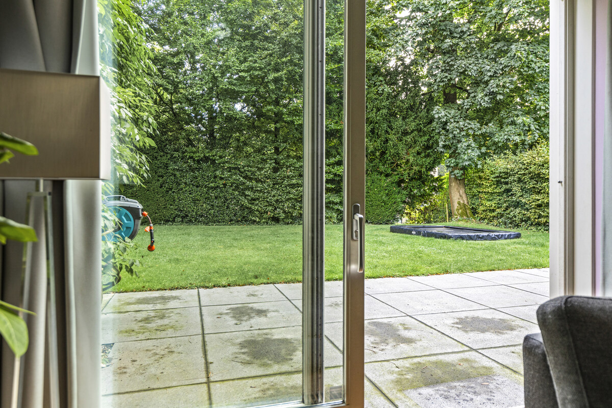 Niet alleen in de keuken ervaart u de natuurlijke lichtinval, ook in de woonkamer krijgt u dit gevoel. De woonkamer is omringd door grote ramen, waardoor er een geweldig zicht is op de achtertuin. In de woonkamer is er een aparte ruimte (werkruimte) welke te bereiken is door middel van 2 glazen deuren. In deze fantastische leefruimte zijn 2 schuifpuien welke toegang bieden tot de heerlijke achtertuin.