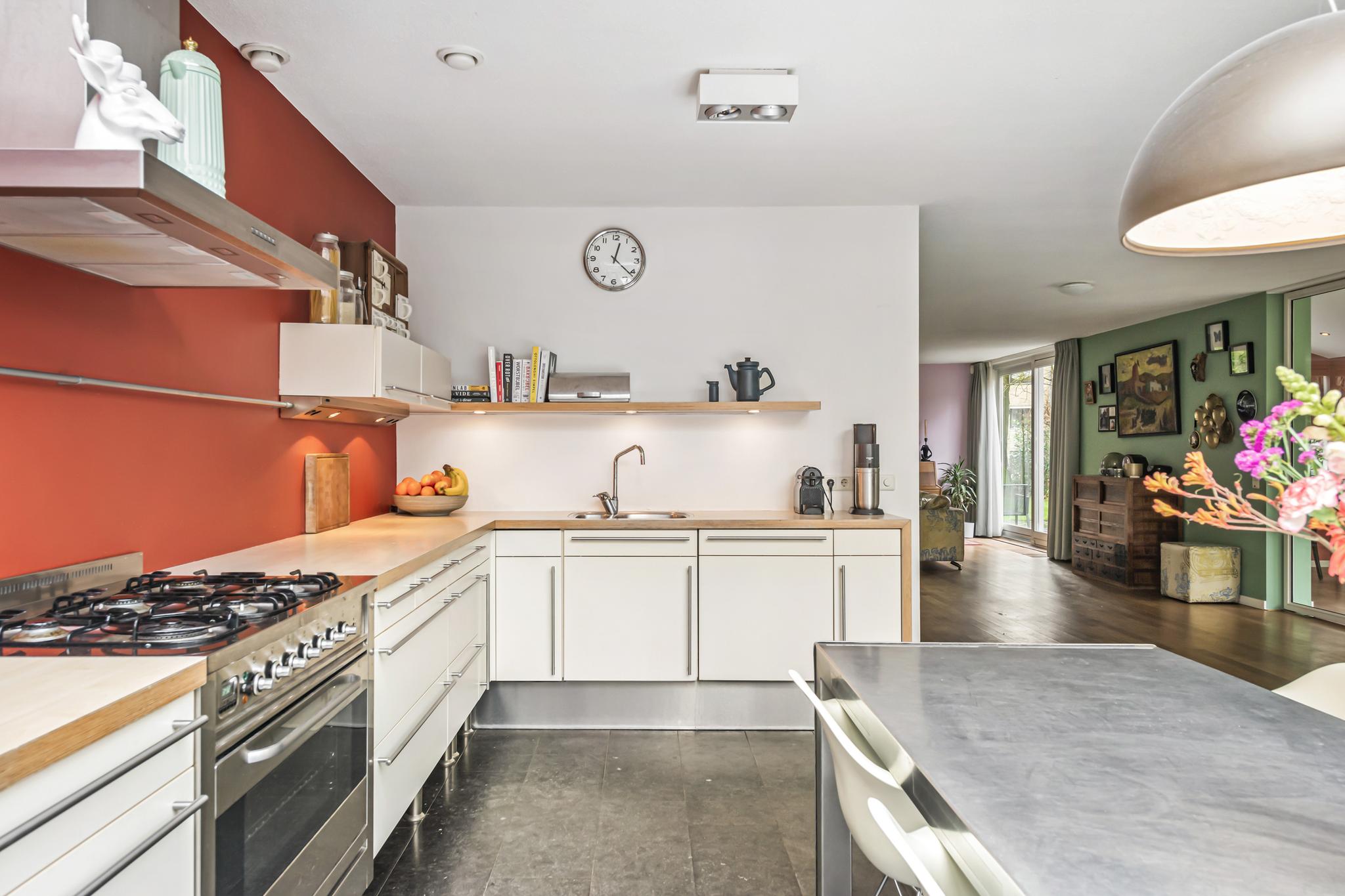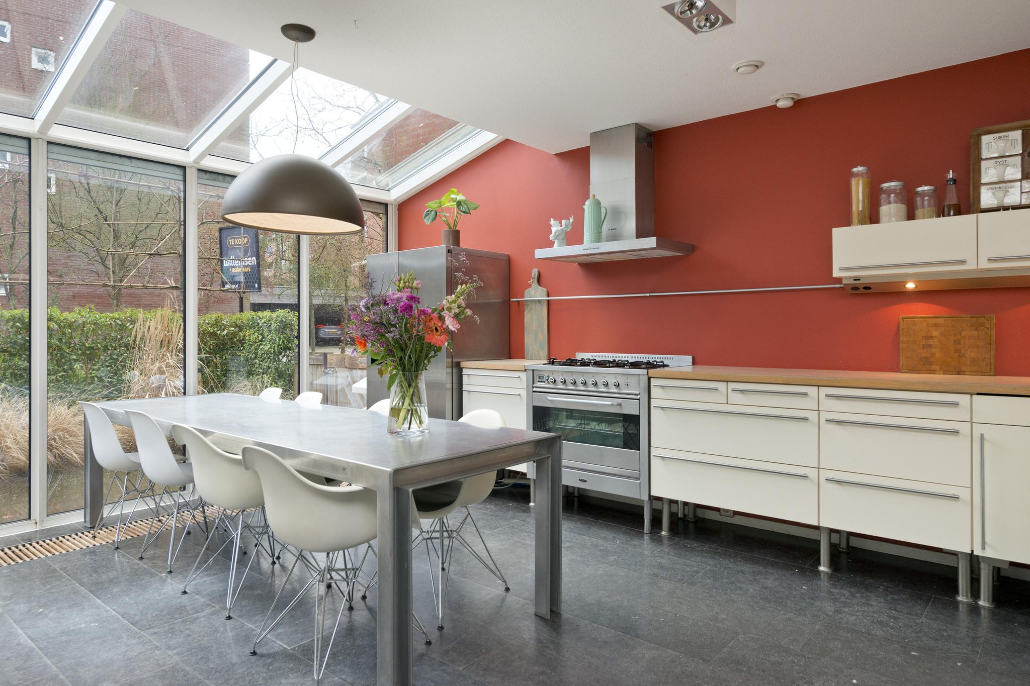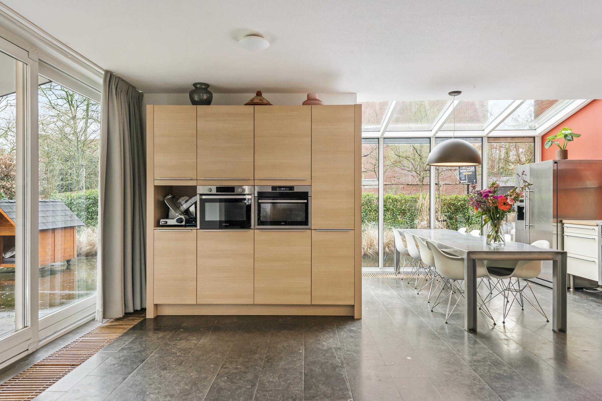 Deze open keuken ligt aan de voorzijde gesitueerd en beschikt over een 6 pits gasfornuis, koelkast met vriezer, vaatwasser en genoeg bergruimte. Daarnaast is er nog een extra aparte kastenwand met daarin de magnetron en de oven. Door de glazen serre ervaart u een natuurlijke lichtinval in de keuken, zoals u die ook buiten ervaart.
