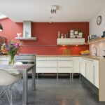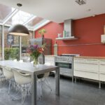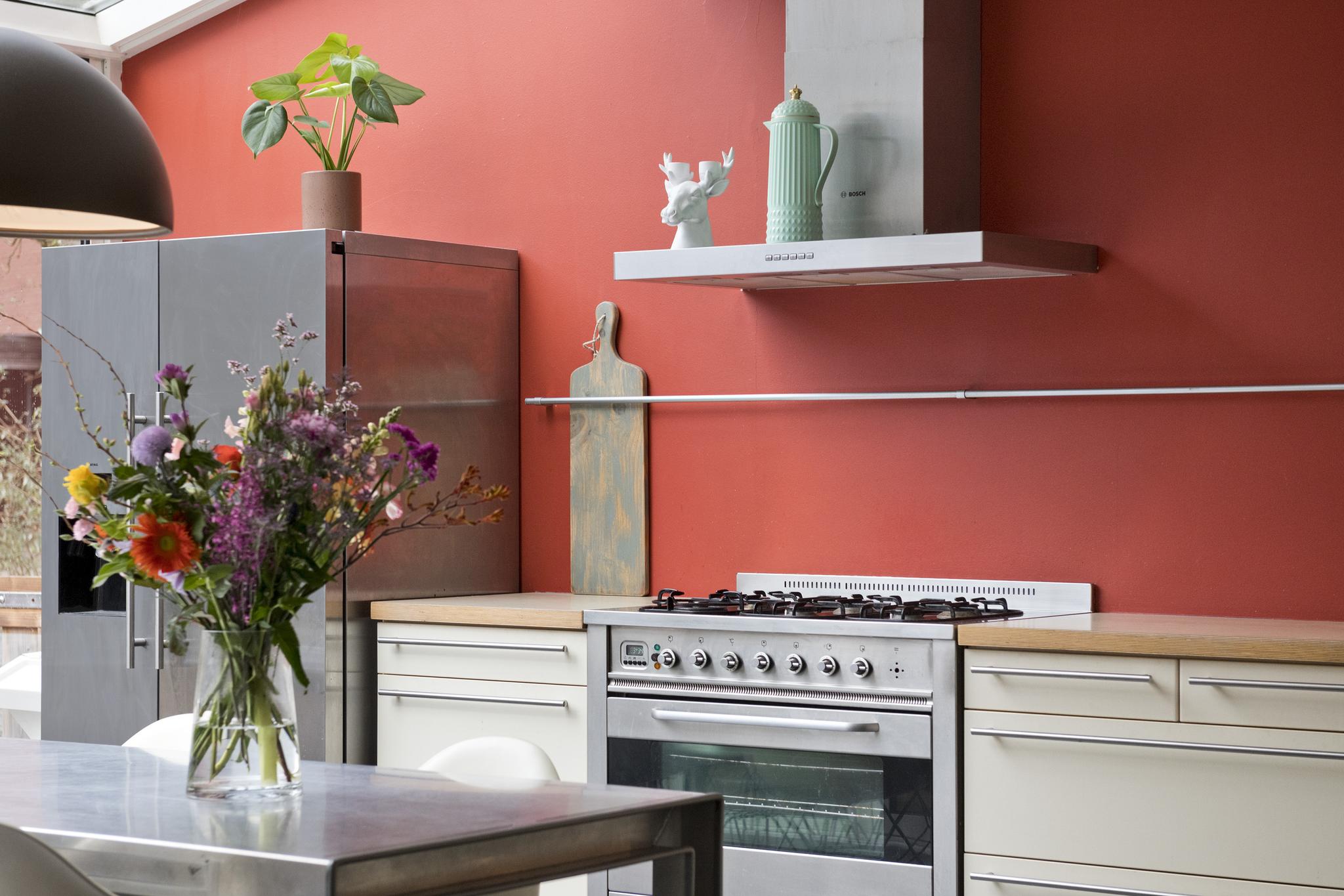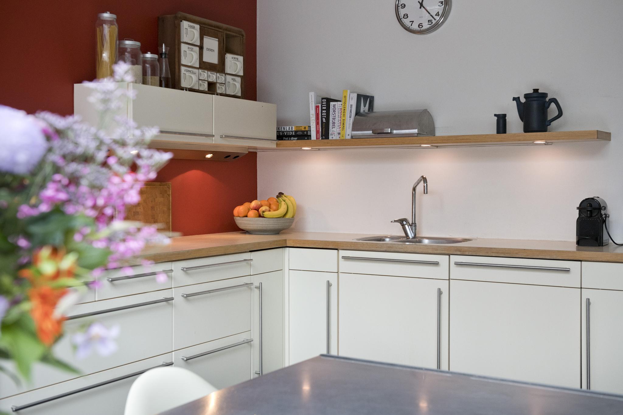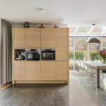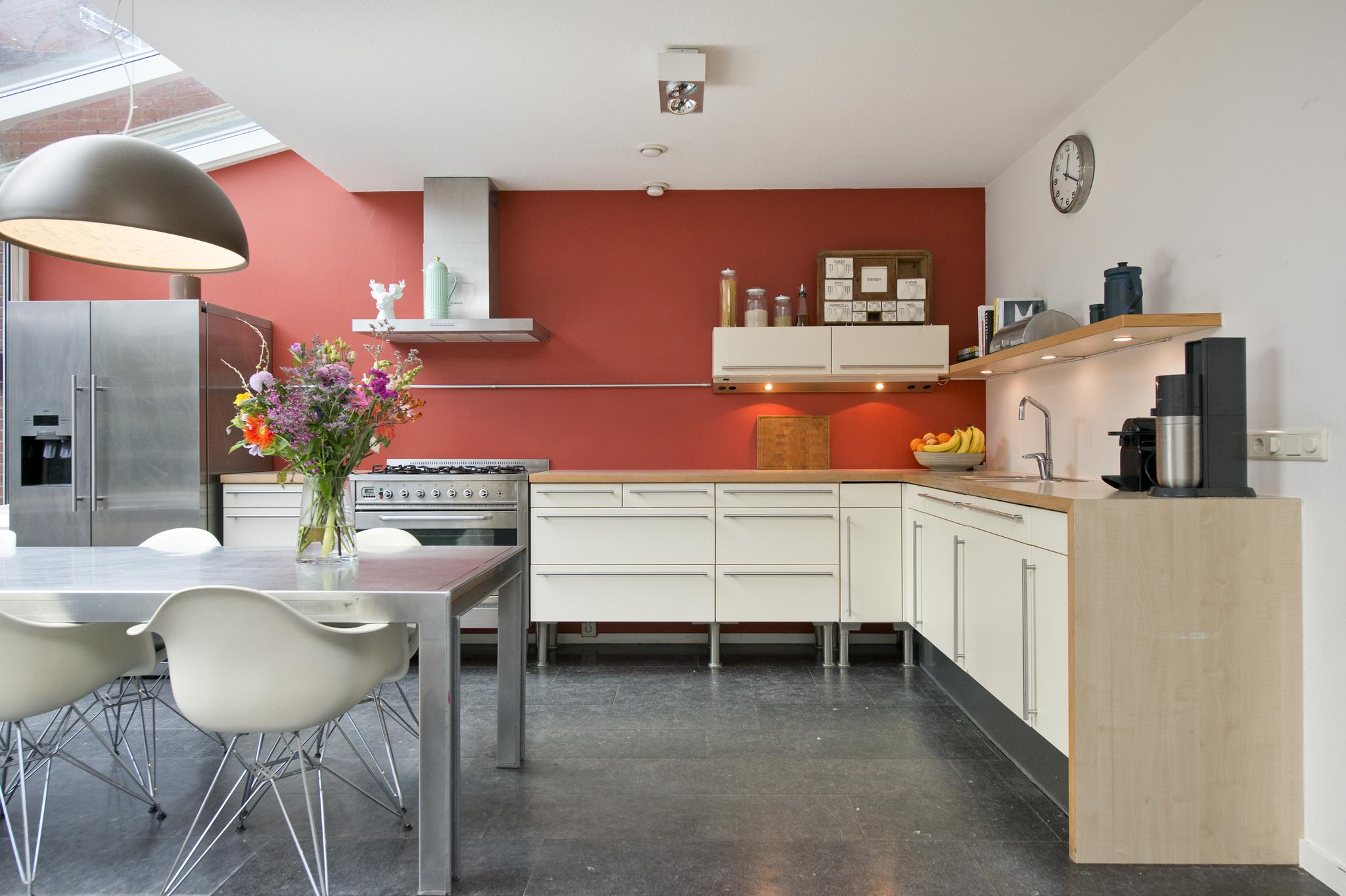 Deze open keuken ligt aan de voorzijde gesitueerd en beschikt over een 6 pits gasfornuis, koelkast met vriezer, vaatwasser en genoeg bergruimte. Daarnaast is er nog een extra aparte kastenwand met daarin de magnetron en de oven. Door de glazen serre ervaart u een natuurlijke lichtinval in de keuken, zoals u die ook buiten ervaart.
