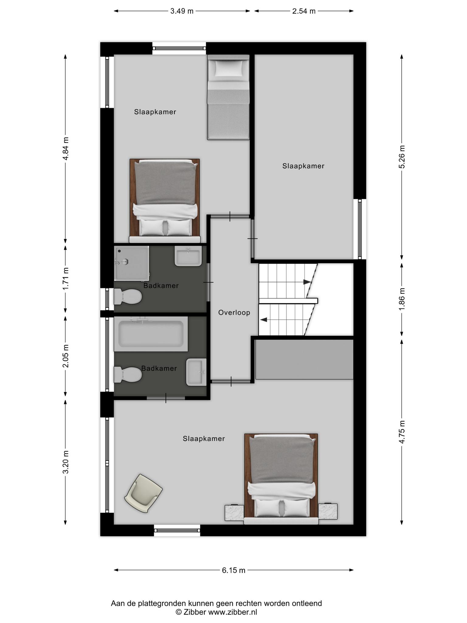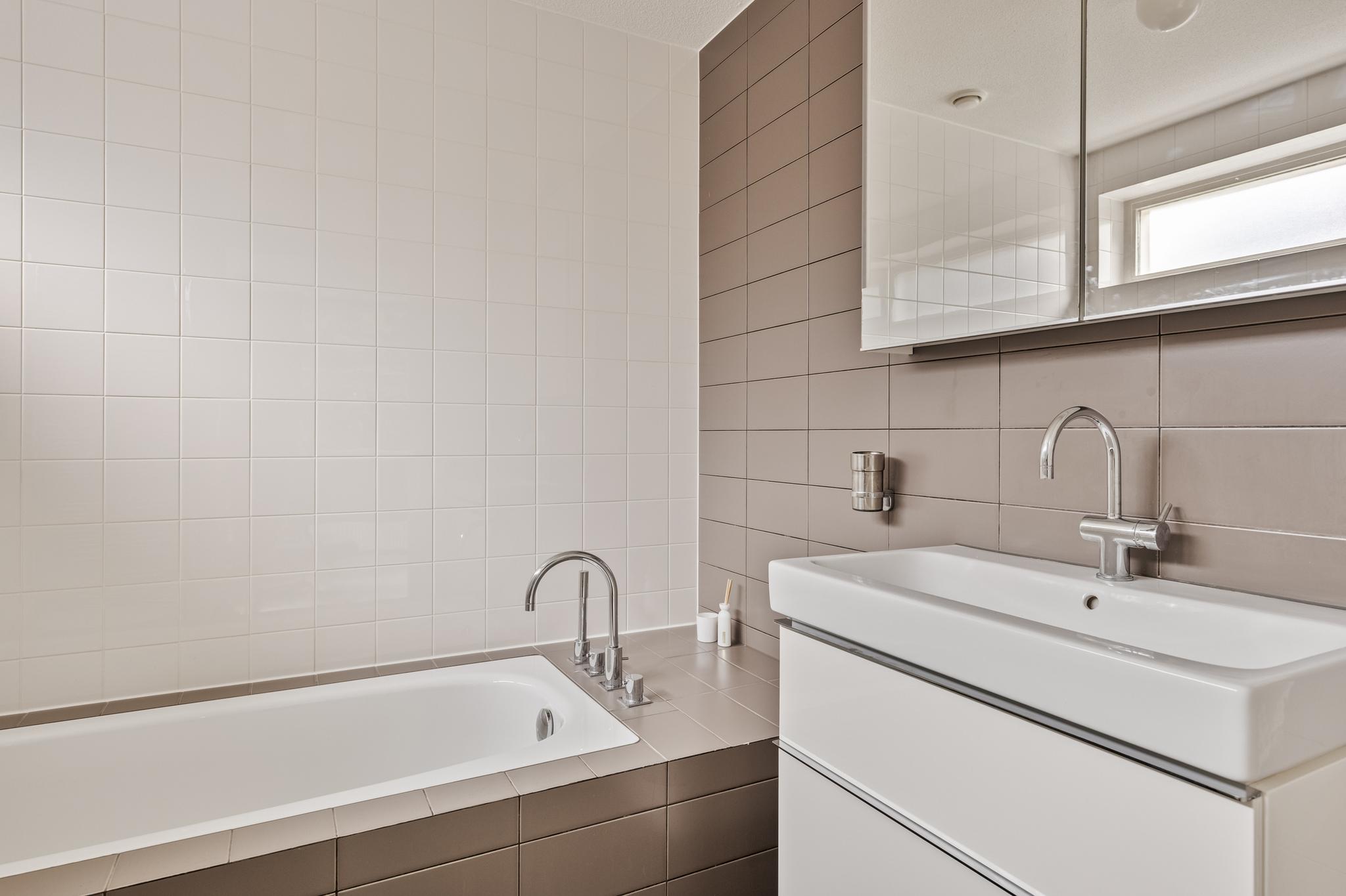 Overloop, welke toegang geeft tot de 3 slaapkamers en de badkamer. De royale slaapkamer is voorzien van eigen badkamer met ligbad, wastafel en toilet. De 2e badkamer is voorzien van een inloopdouche, wastafel, toilet en radiator.