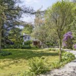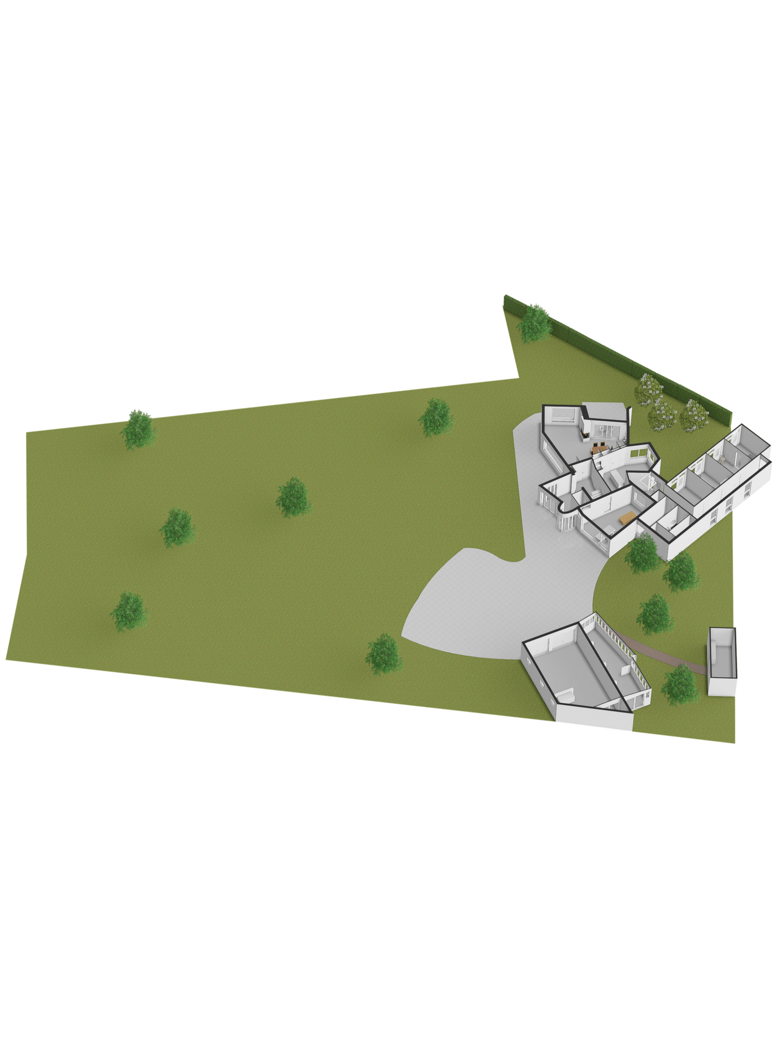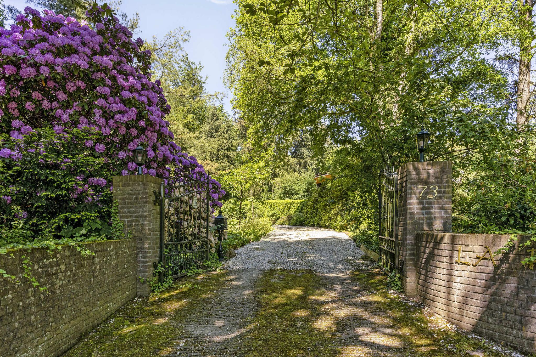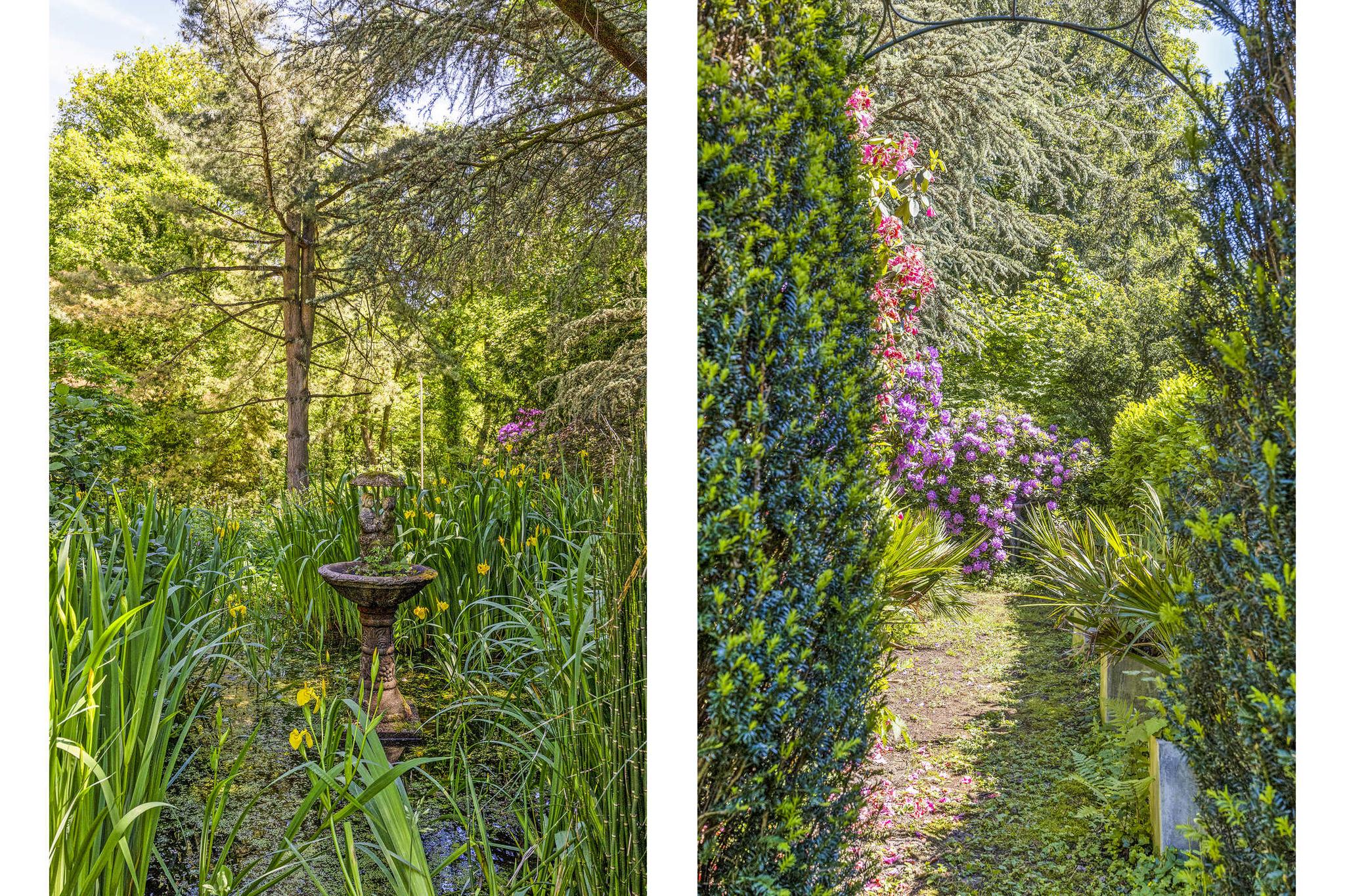 Dit object beschikt over een variatie aan terrassen, borders en gazonnen, uitkijkend over een glooiende tuin. De omringende tuin, die volop privacy garandeert, heeft een glooiend gazon met volgroeide erfafscheidingen opgevuld met heesters en bomen. De statige oprit maakt het geheel af.