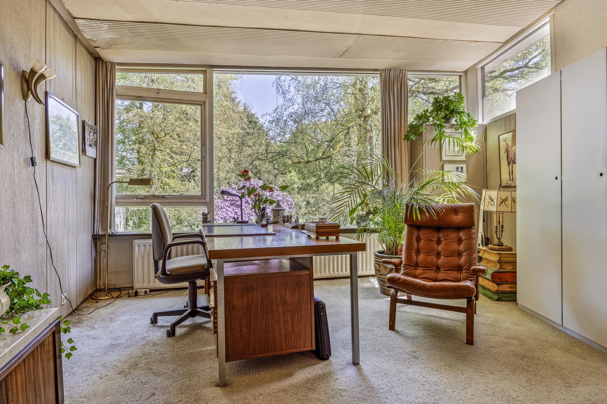 Via een statige trap naar de entree, ruime hal met trappenhuis en toegang tot de alle vertrekken via diverse kleine trappen, Woonkamer met schuifpui naar het terras, ter hoogte van het maaiveld is een ruimte die nu als bar fungeert maar ook prima als slaap- of studeerkamer gebruikt kan worden, een etage hoger is een kantoor met prachtig uitzicht over de tuin en vijverpartij, in de kelder is ruimte voor proviand en treffen we een van de cv-ketels aan.