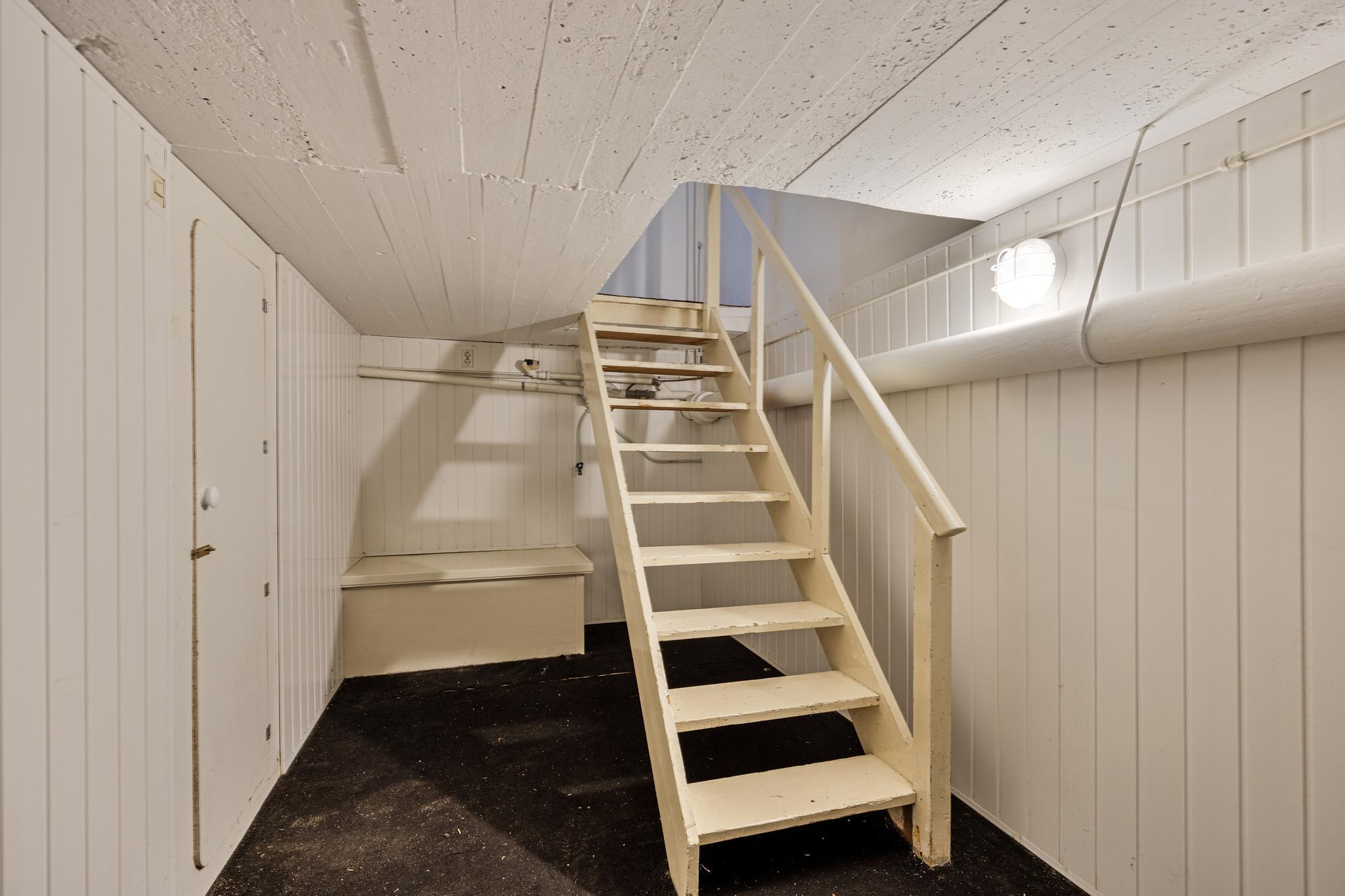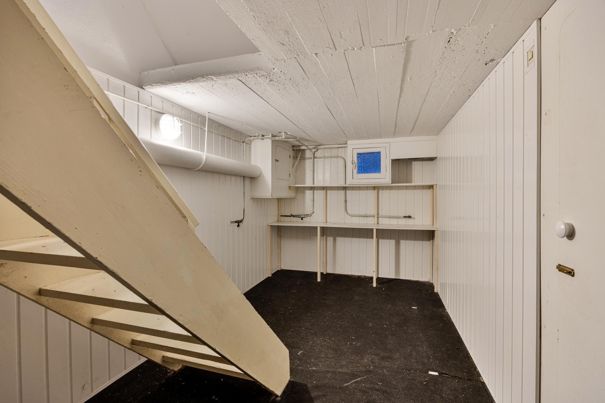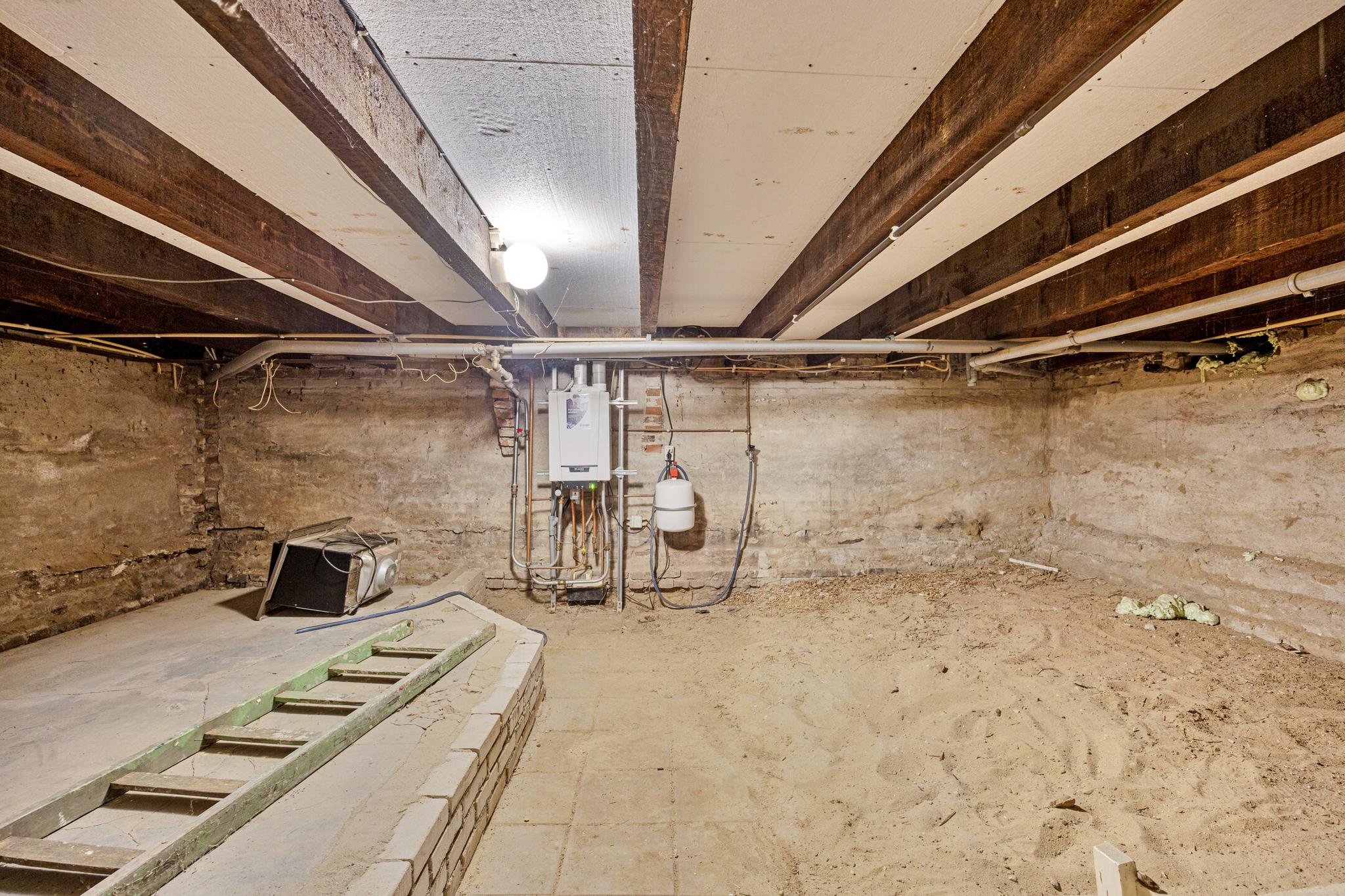 Ruime kelder met opstelling voor de wasapparatuur en de cv-ketel. Deze ruimte is ideaal voor het creëren van een extra kamer of hobbyruimte.
