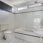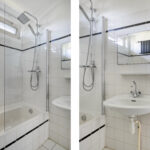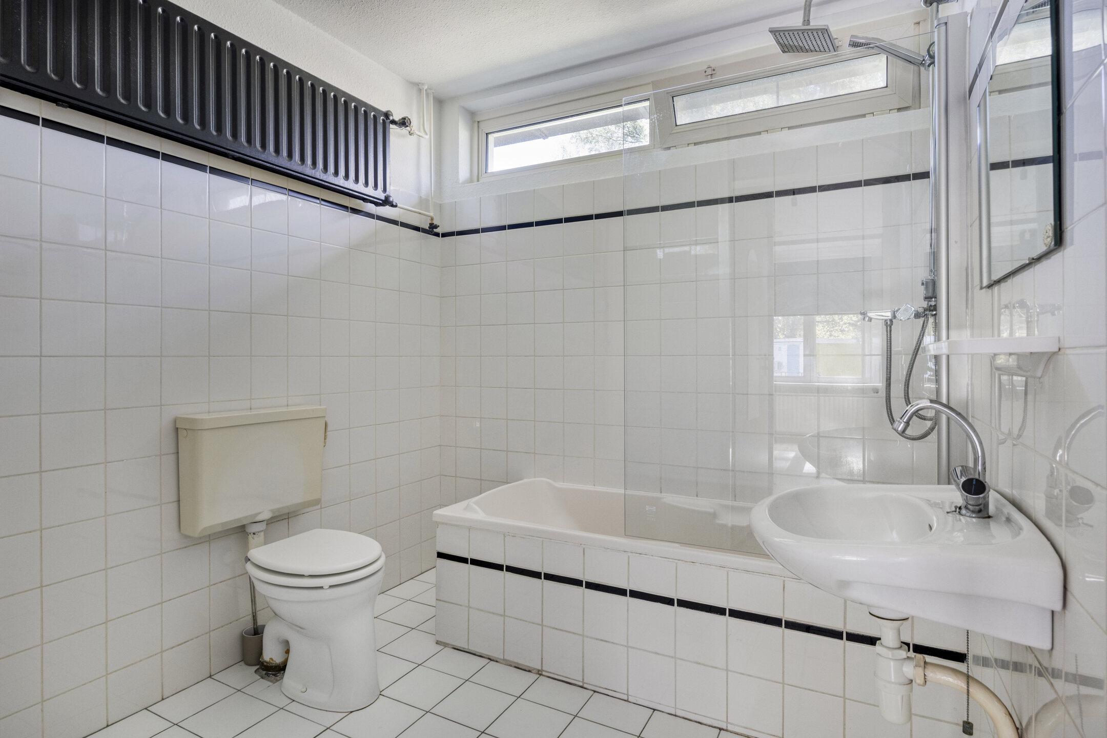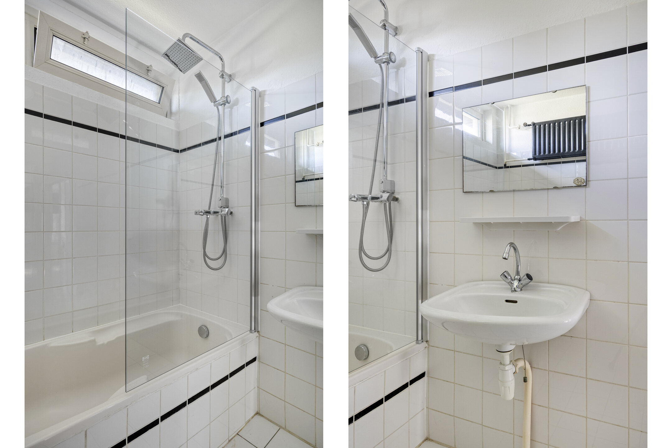 Overloop met toegang tot drie ruime slaapkamers en de badkamer. De badkamer is neutraal uitgevoerd en voorzien van ligbad met douche, wastafelmeubel en toilet. Deze verdieping is volledig afgewerkt met een laminaatvloer.
