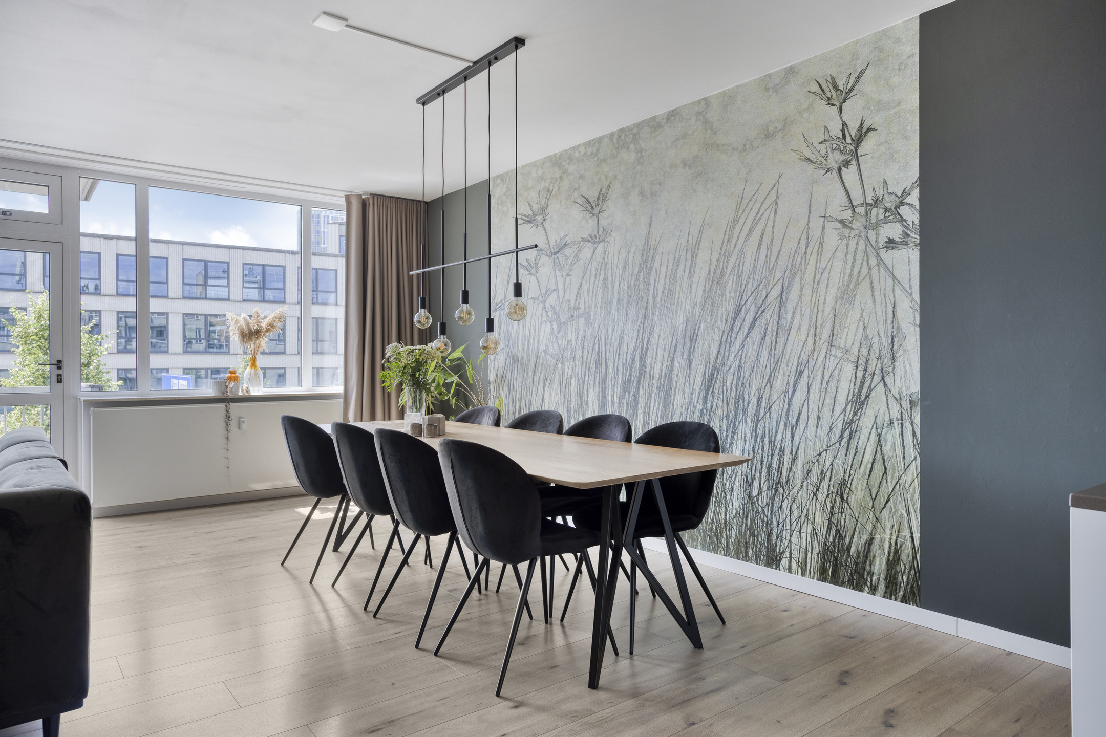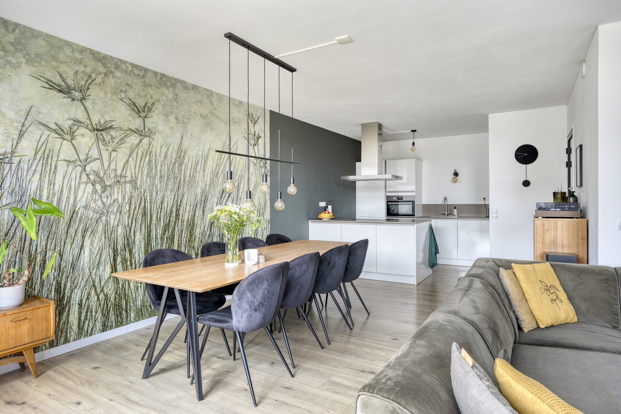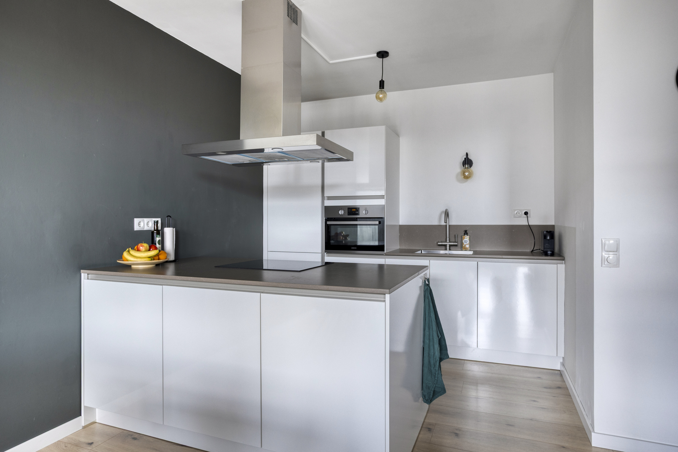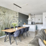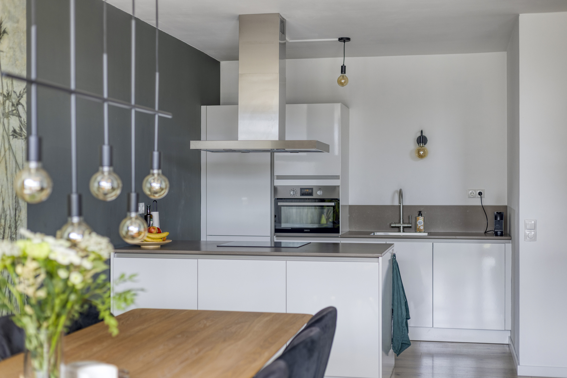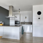 Aan het eind van de hal opent zich het hart van de woning: een lichte en uitnodigende woonkamer met toegang tot een zonnig balkon op het zuiden. De open keuken met modern kookeiland, inductiekookplaat, vaatwasser, koel- en vrieskast, kokend waterkraan en veel werkruimte maakt dit tot een ideale plek om te koken, te eten en te ontspannen.