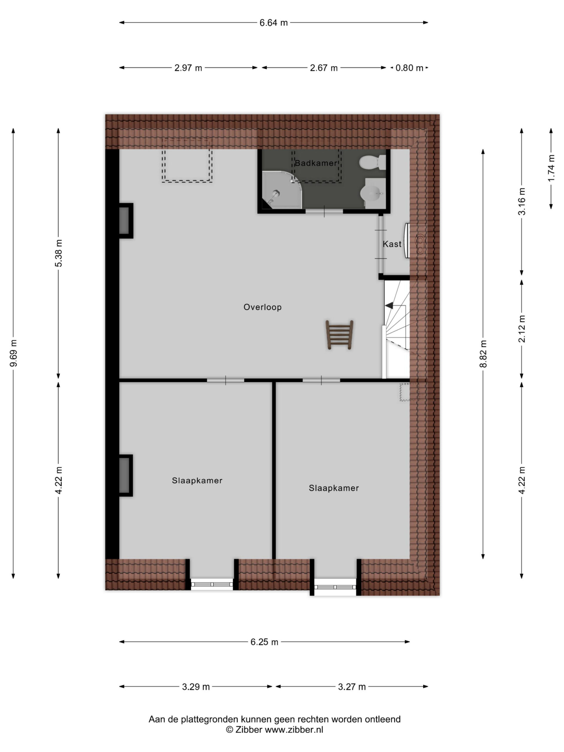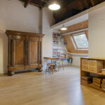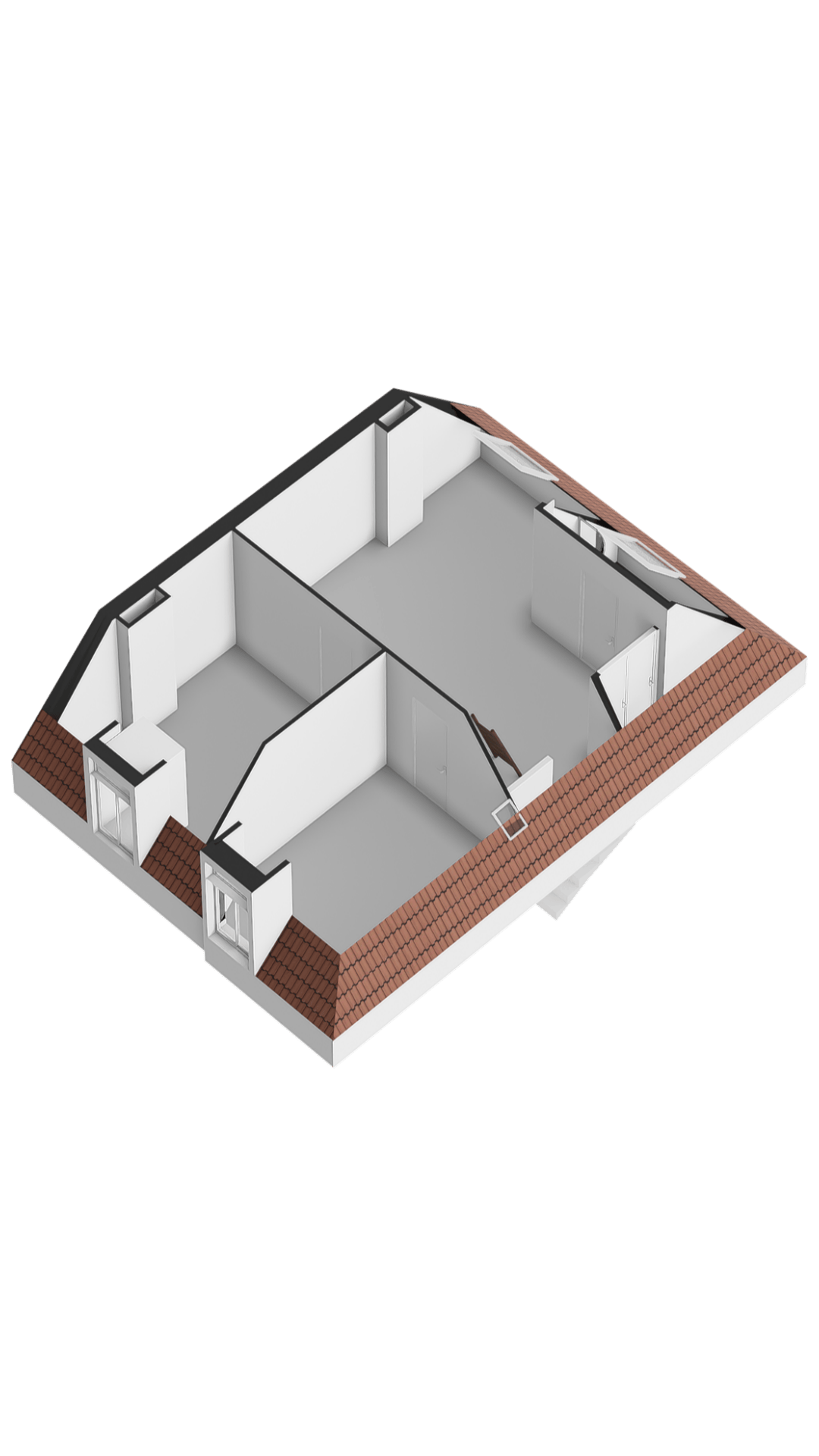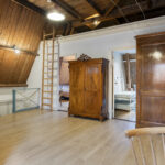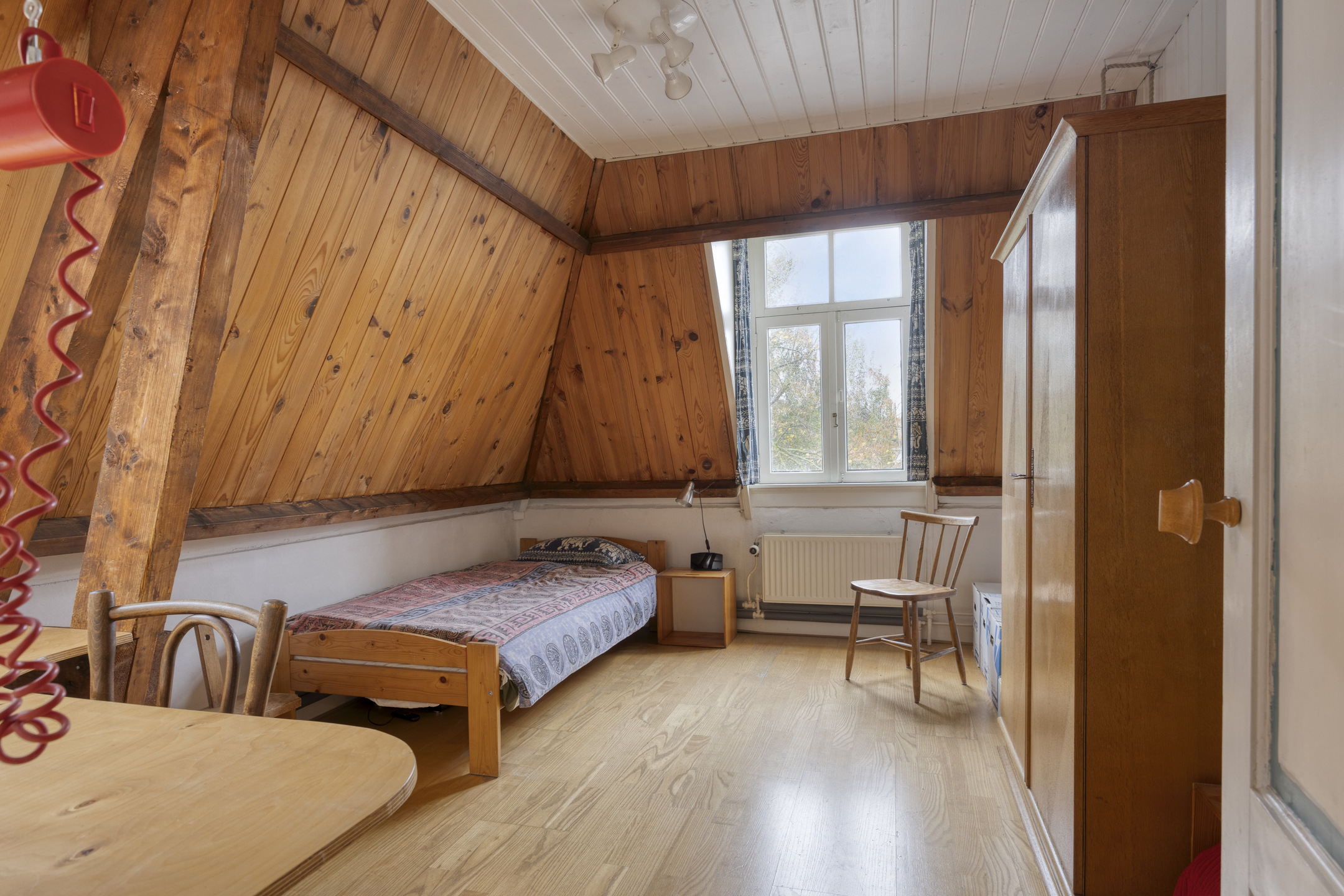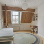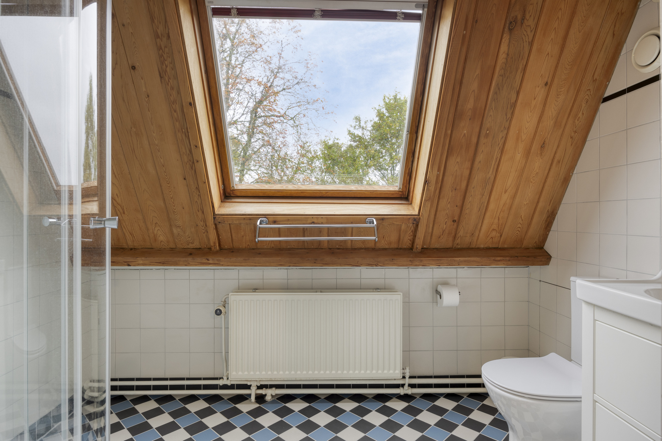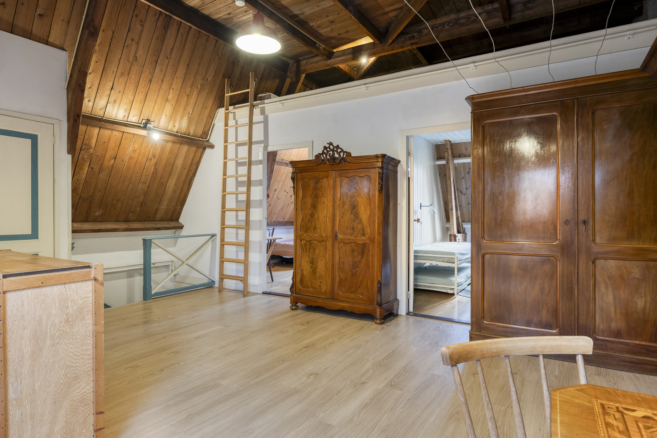 Grote open ruimte met zichtbare kapconstructie, twee slaapkamers, tweede badkamer met douche en toilet, en vaste kast met cv-installatie. Boven de slaapkamers bevindt zich een praktische vliering.