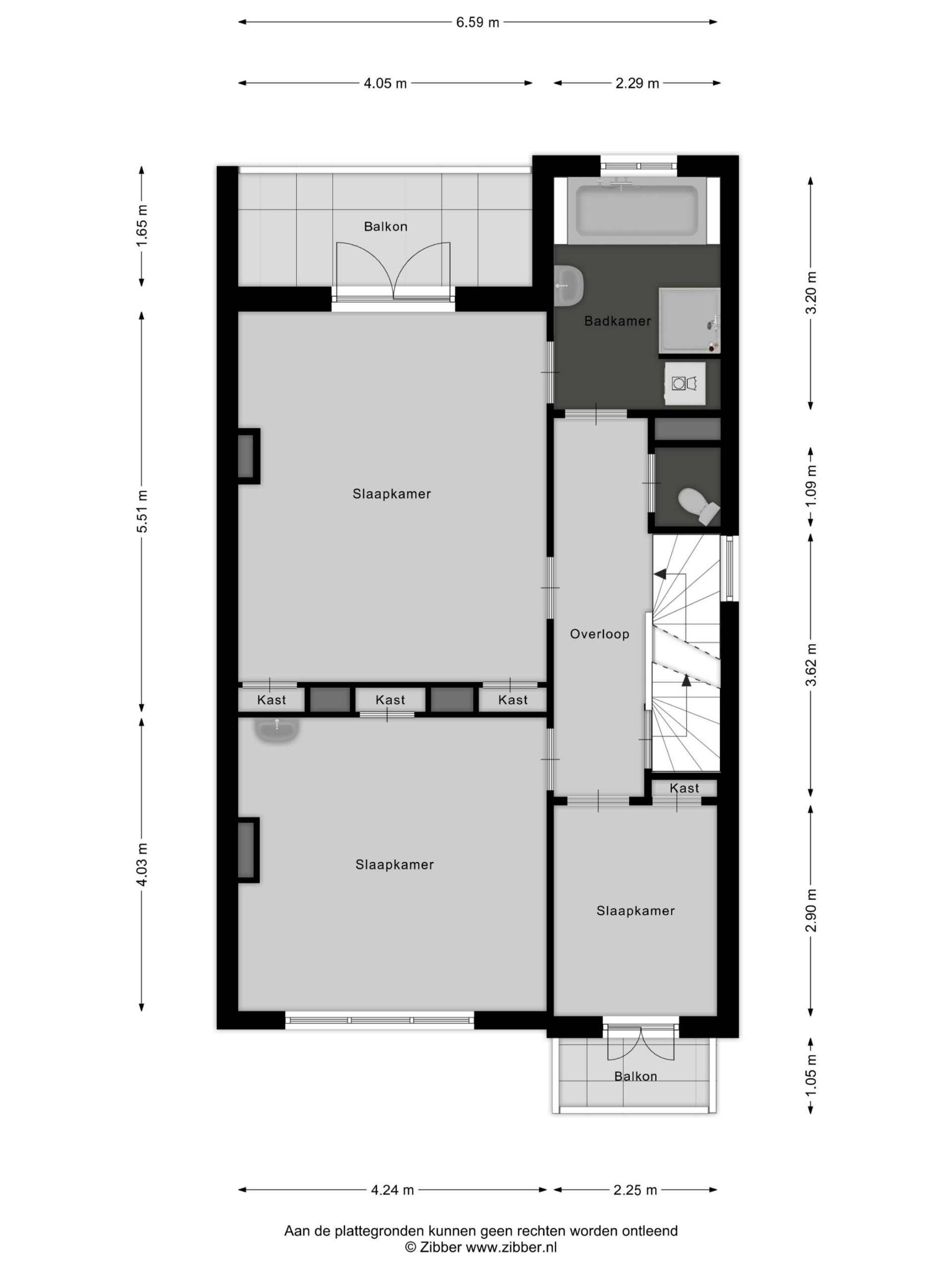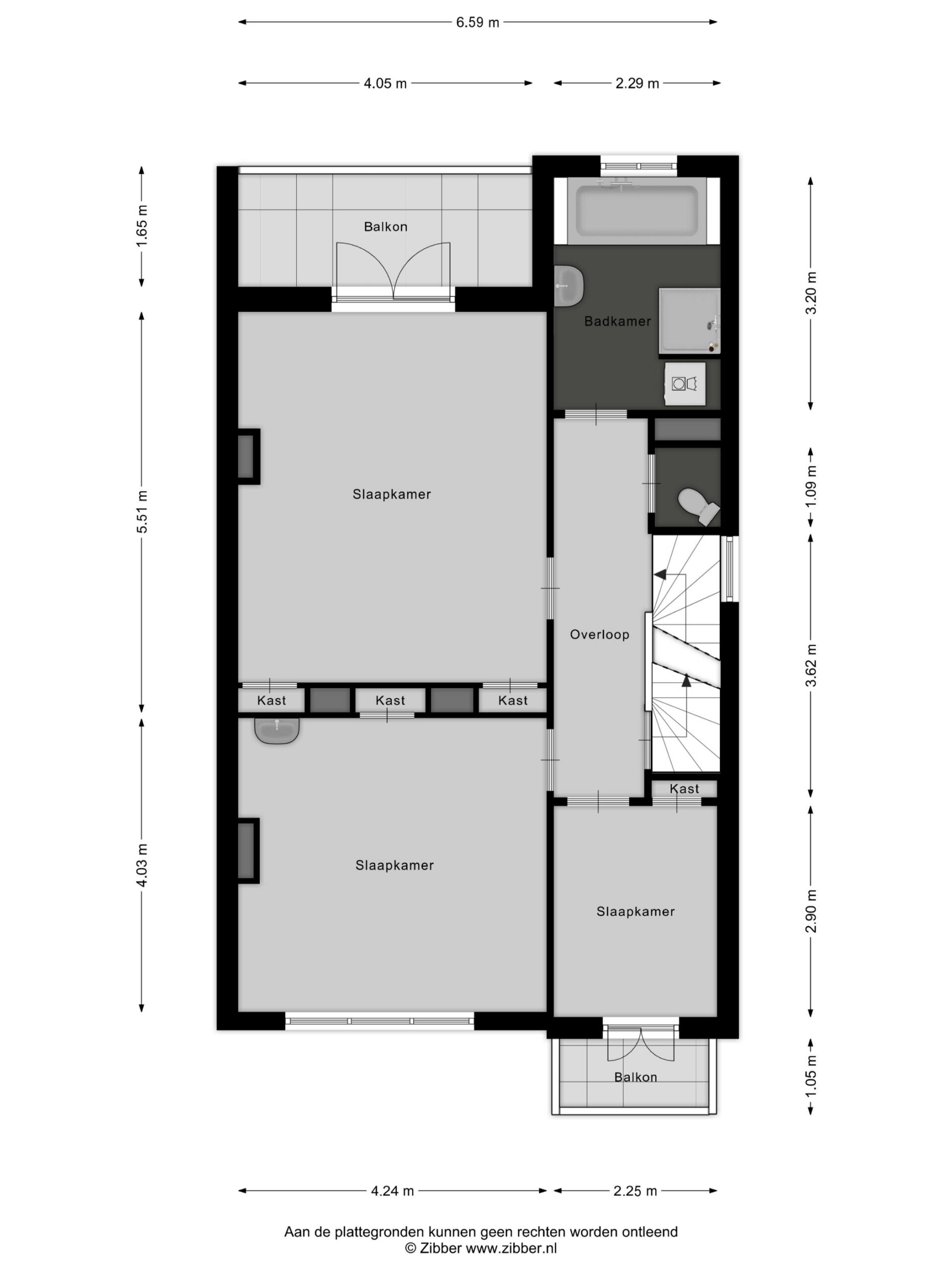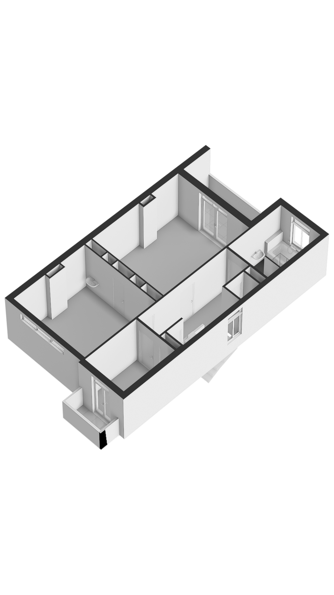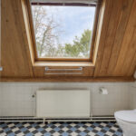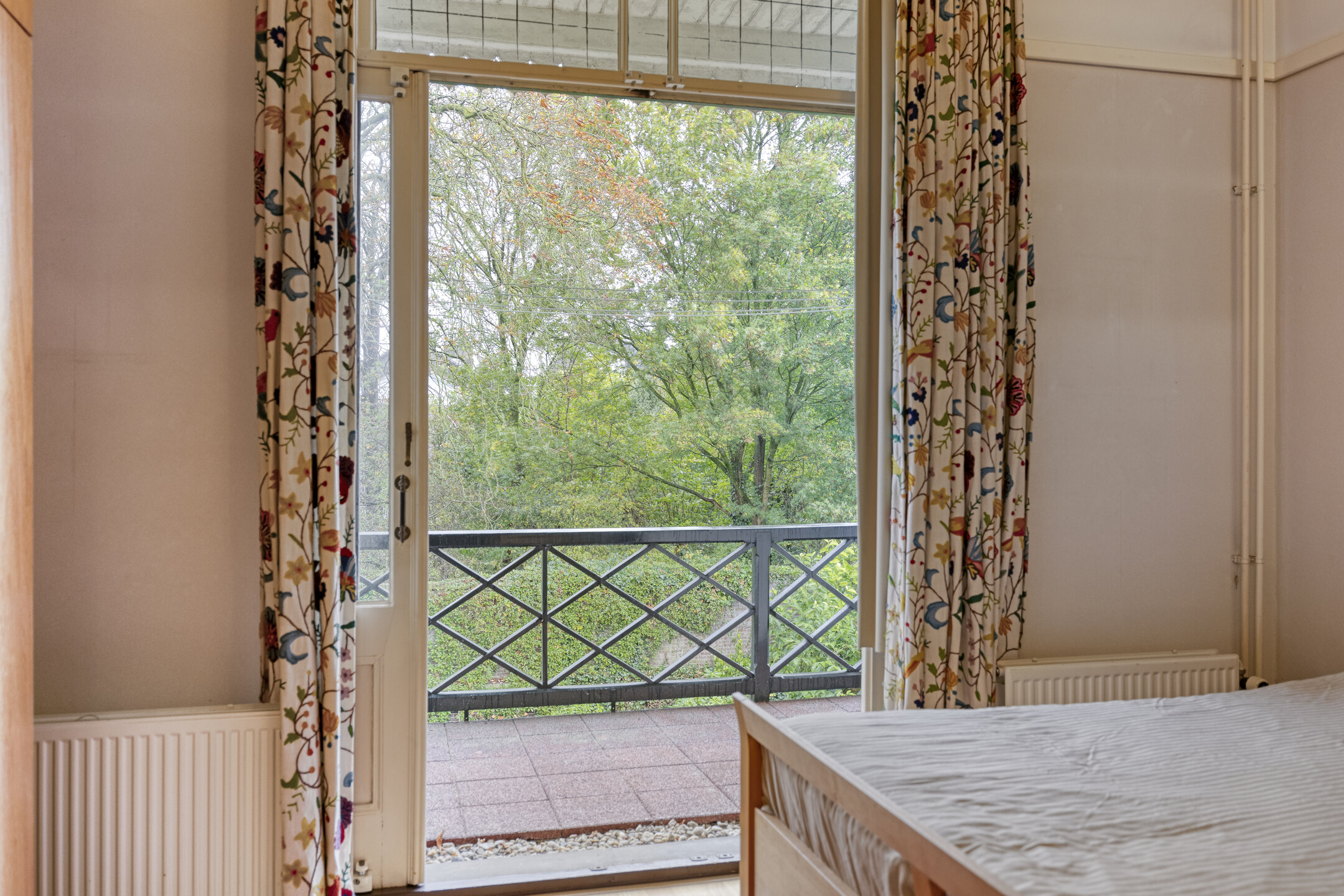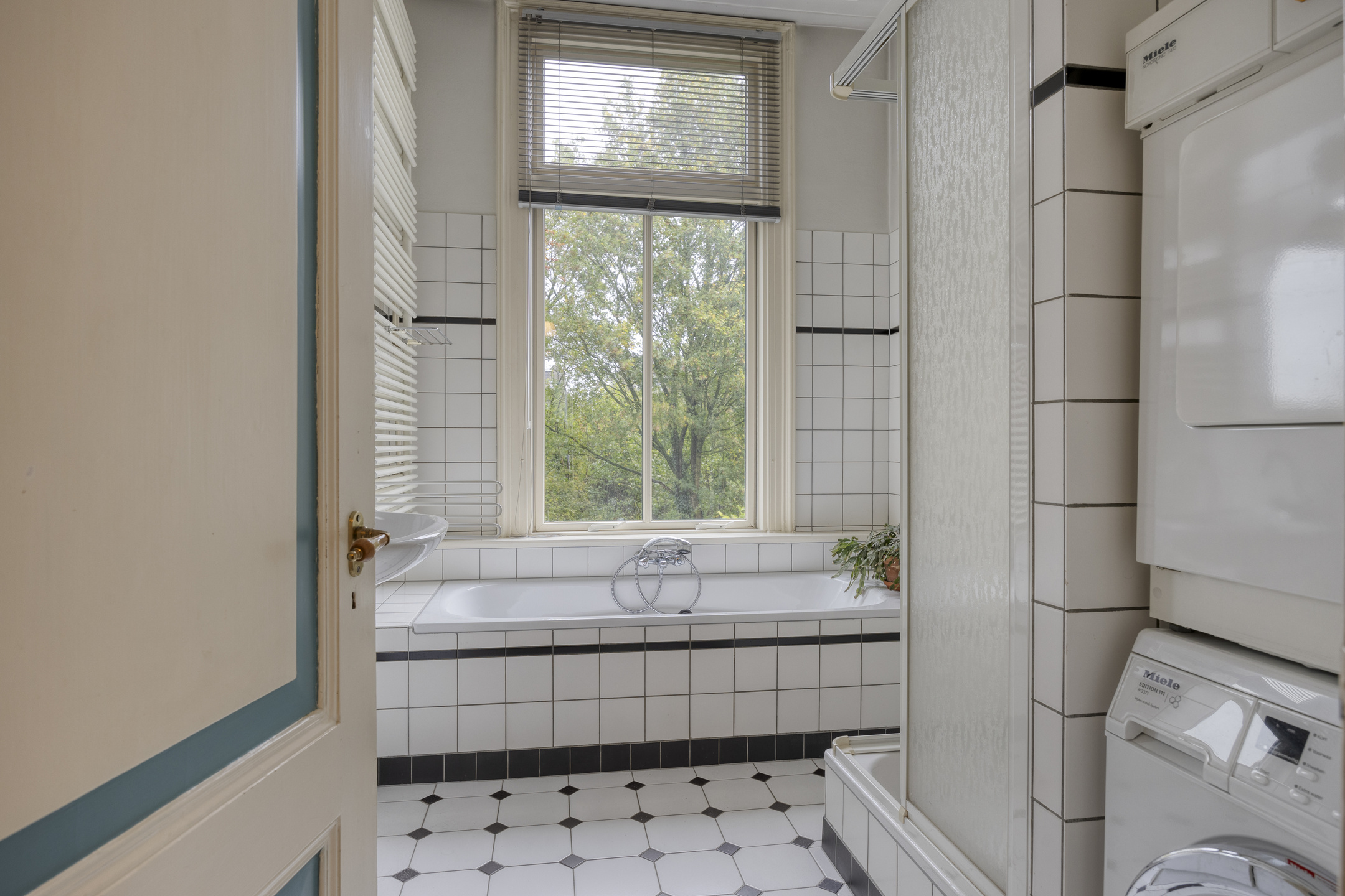 Overloop, separaat toilet en badkamer in zwart-witte stijl met ligbad, wastafel en douche. Aan de voorzijde twee slaapkamers (waarvan één met balkon), en aan de achterzijde een ruime slaapkamer met veranda en uitzicht op de tuin en watertuin.