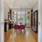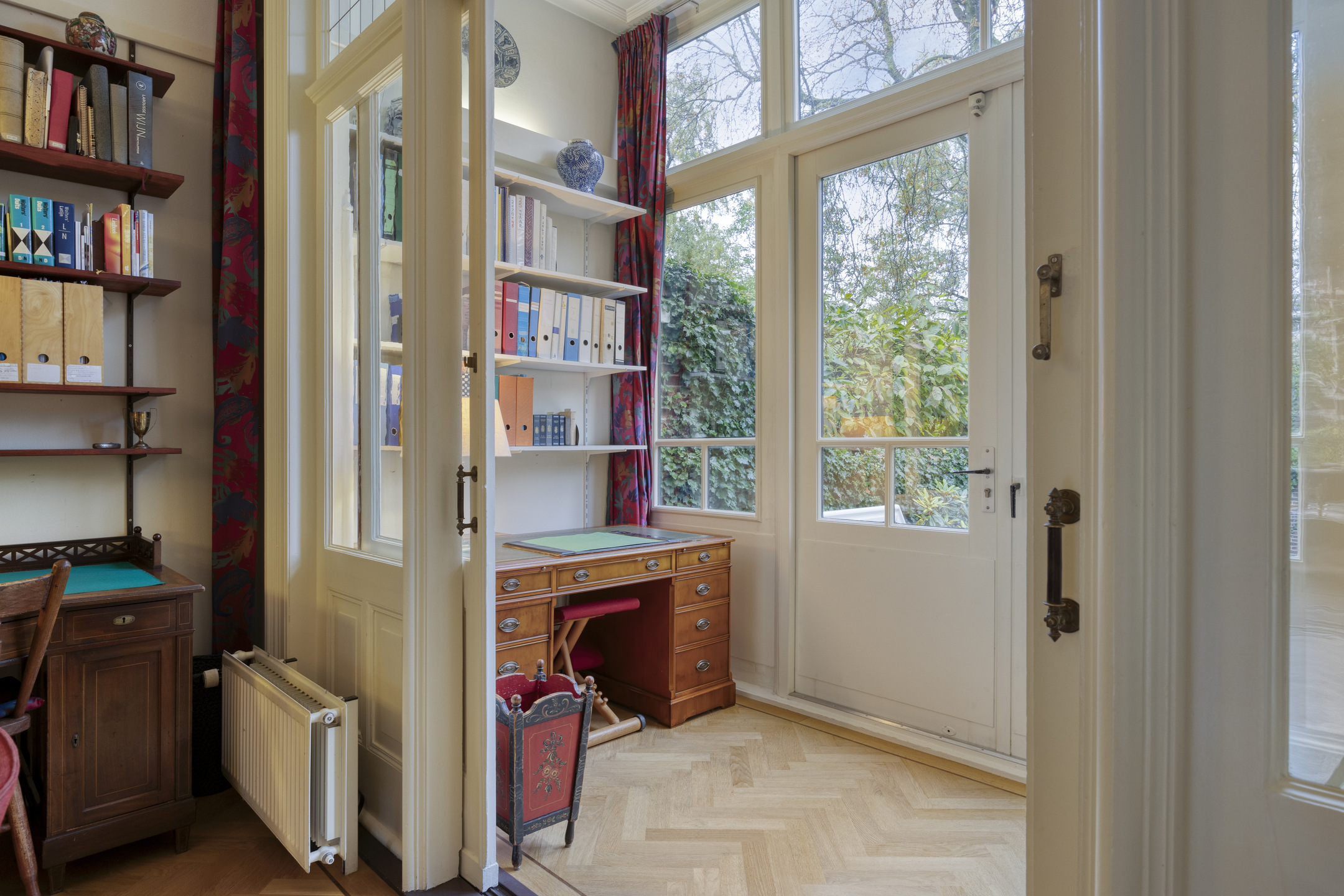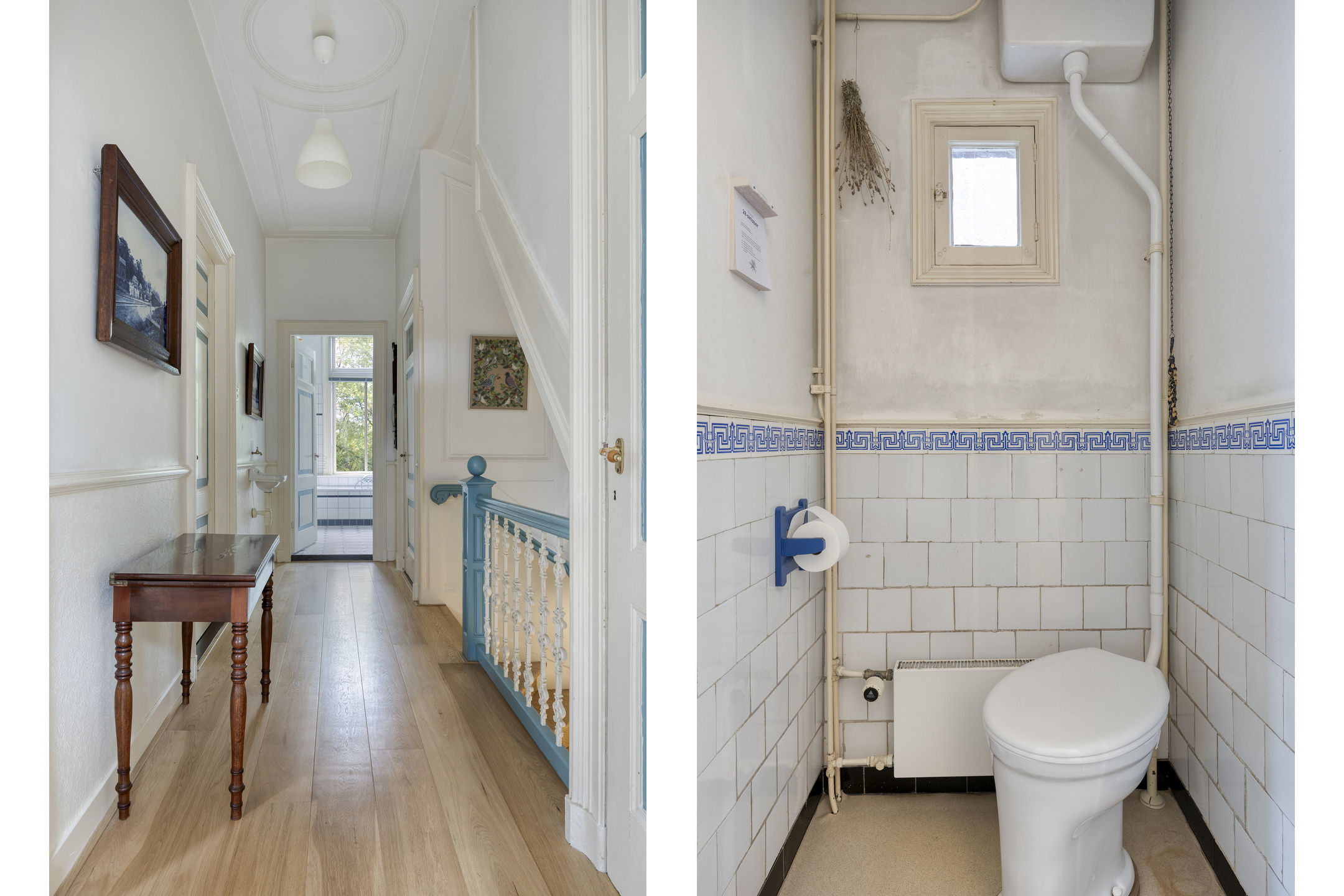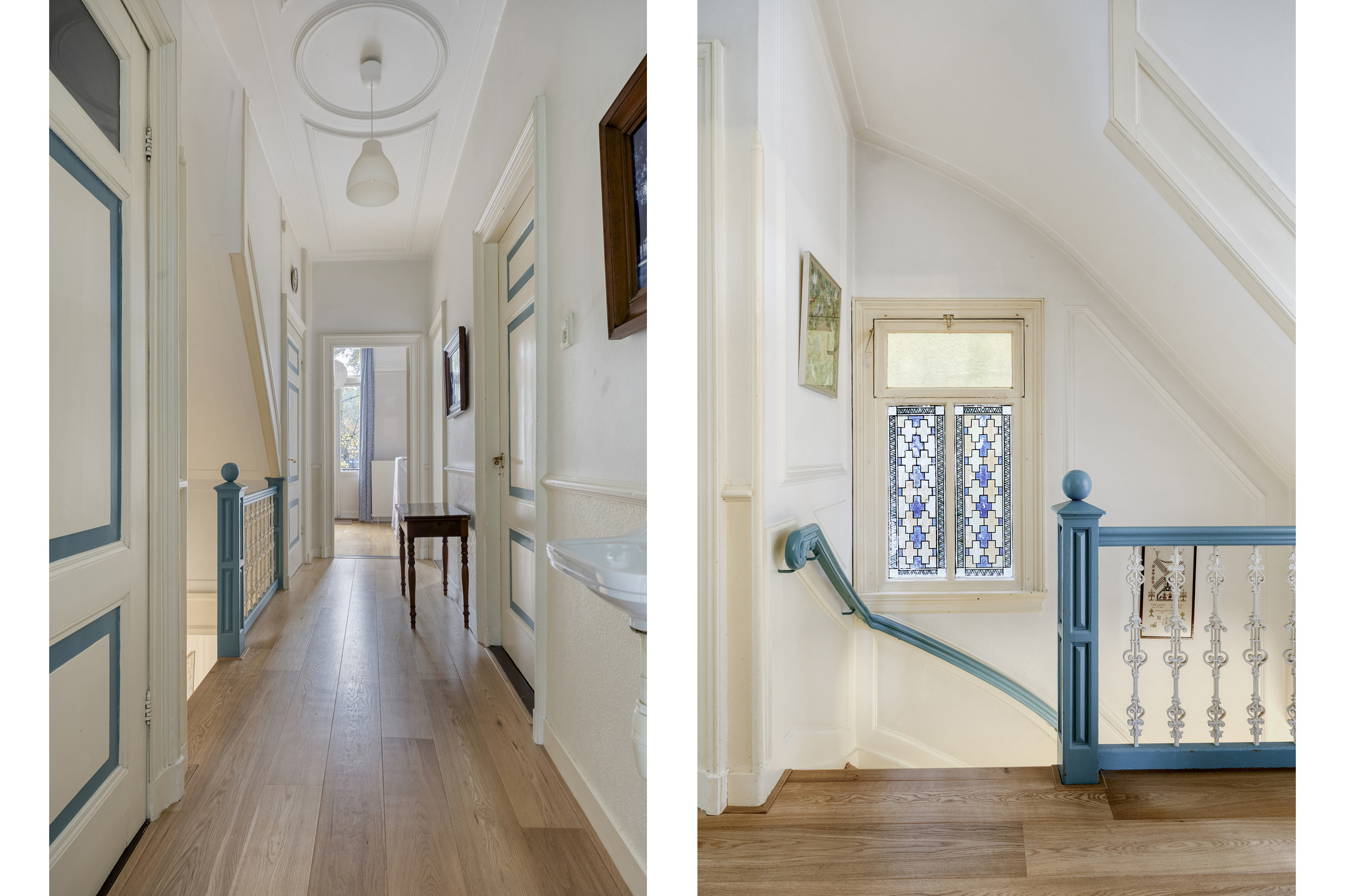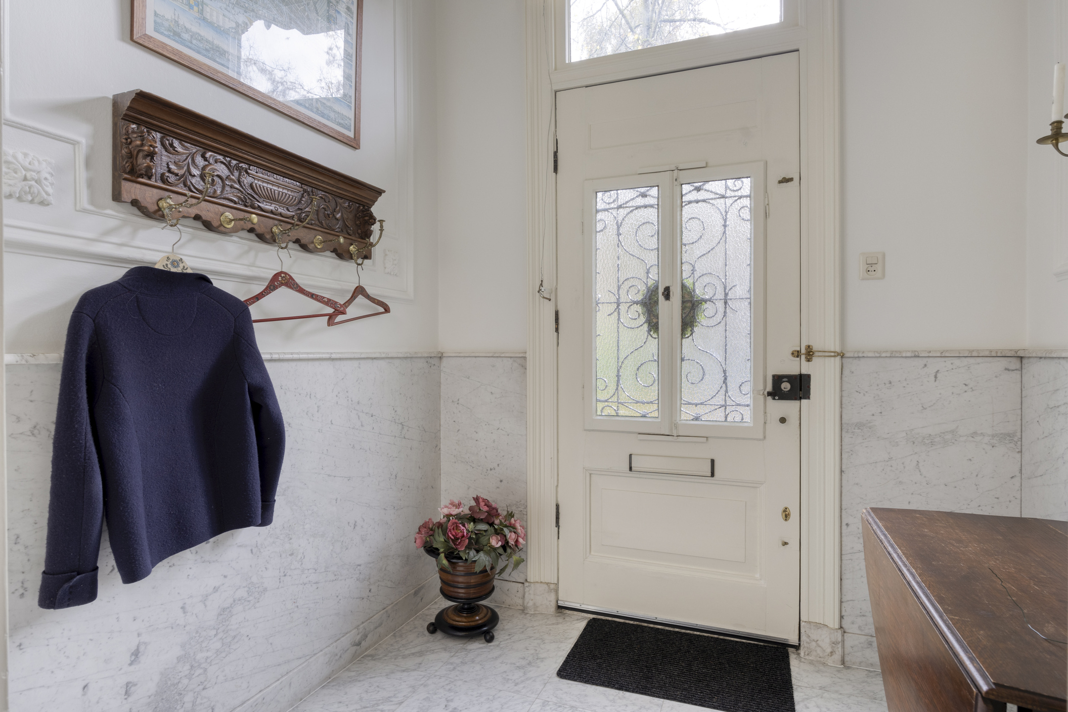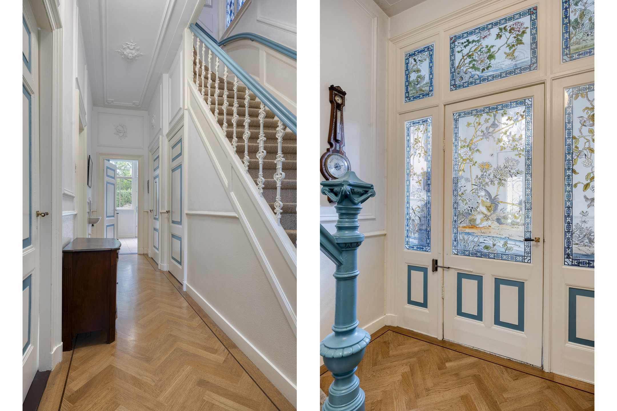 De entree maakt direct indruk: een vestibule met beschilderde ramen van kunstenaar W. Reijenga, originele marmeren lambrisering en sierlijk stucwerk. Binnen vind je nog talloze oorspronkelijke details zoals hoge plafonds met ornamenten, drie zwart marmeren schouwen, fraai houtwerk en klassieke paneeldeuren. De combinatie van authenticiteit en royale ruimtes geeft de villa een unieke uitstraling.