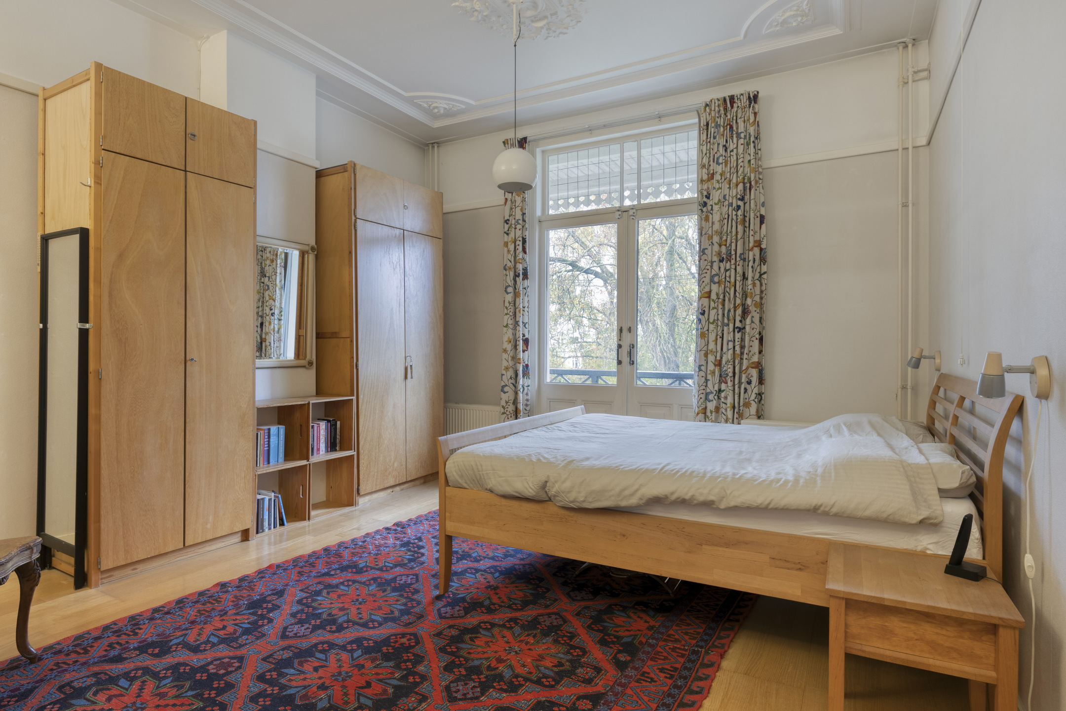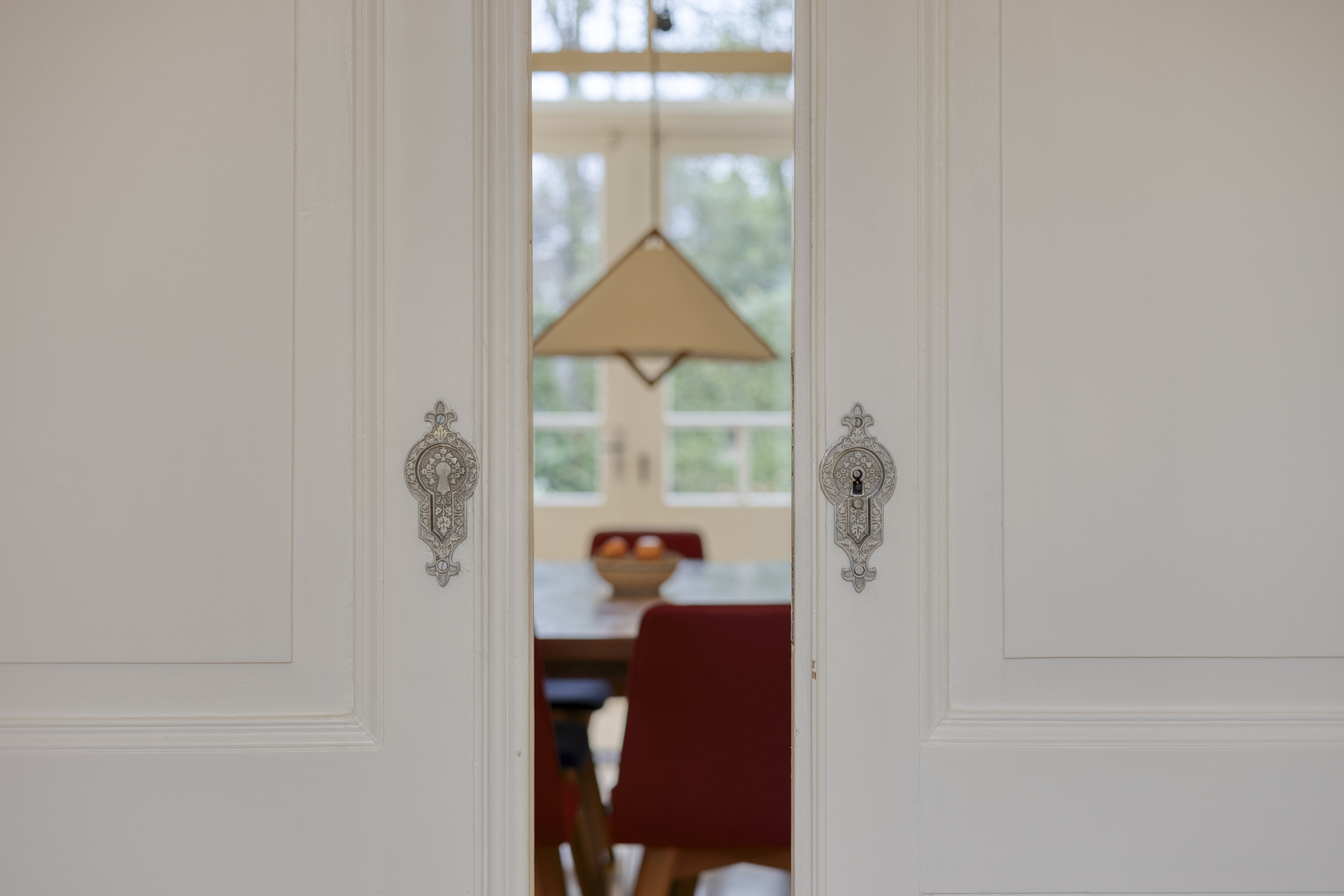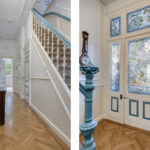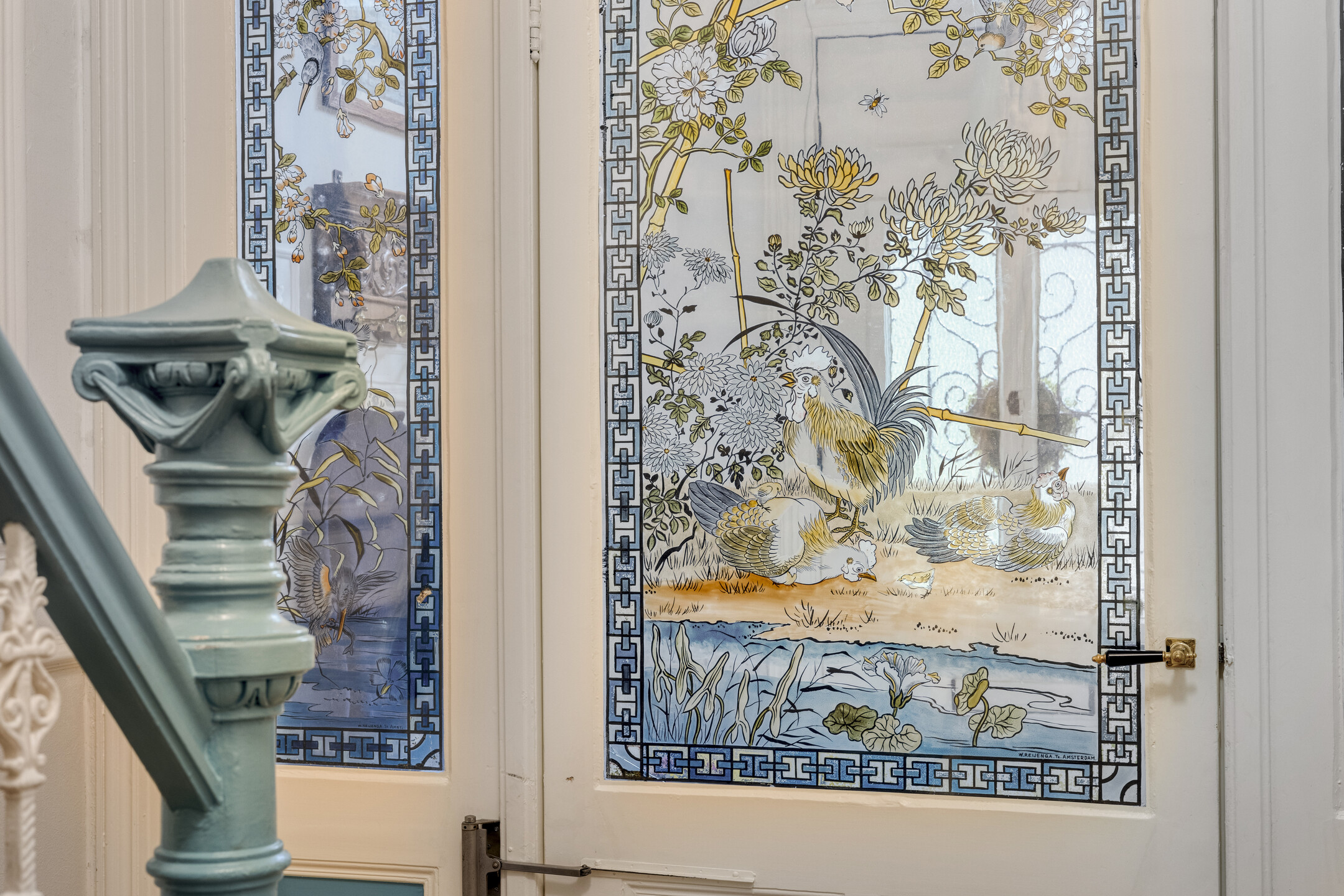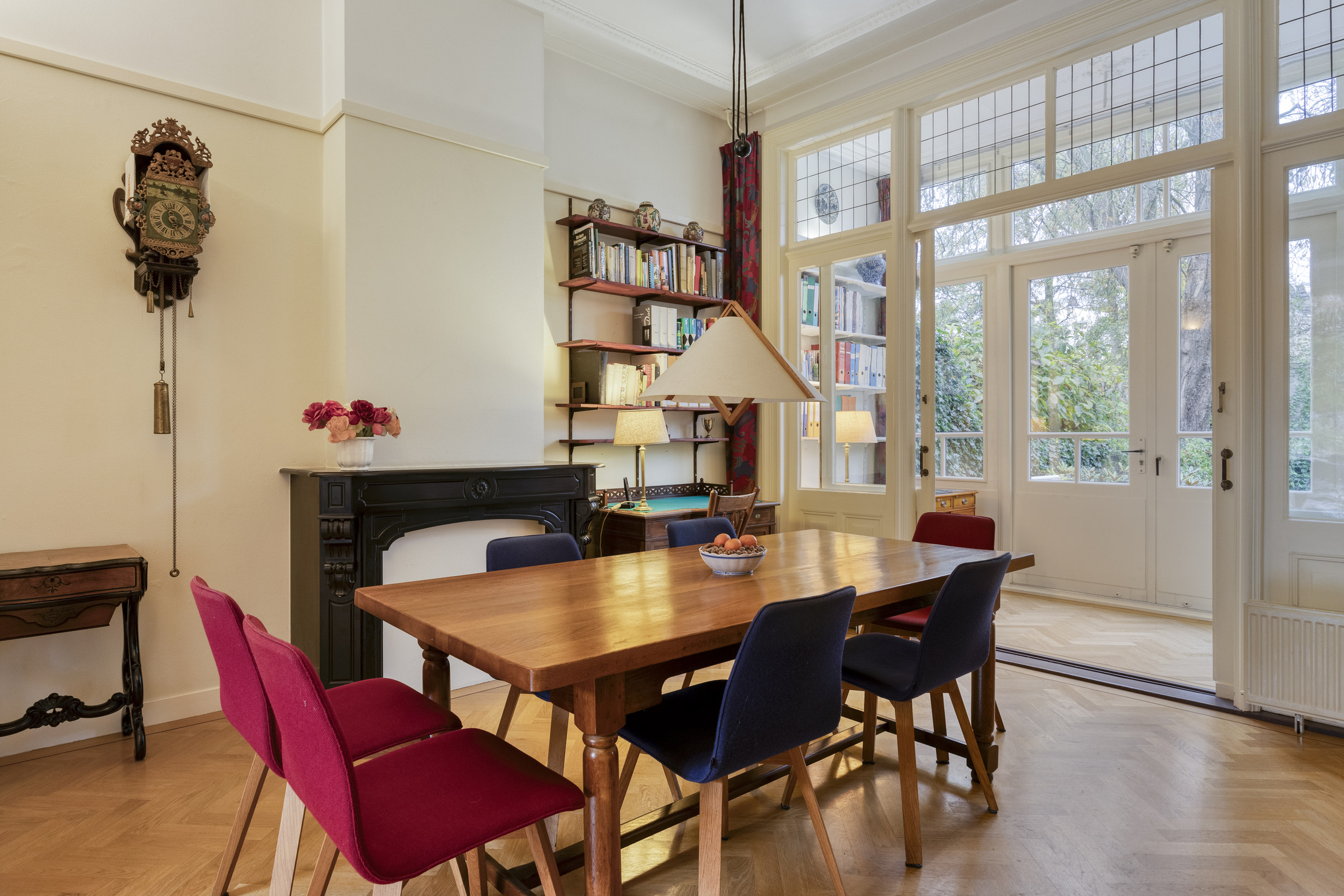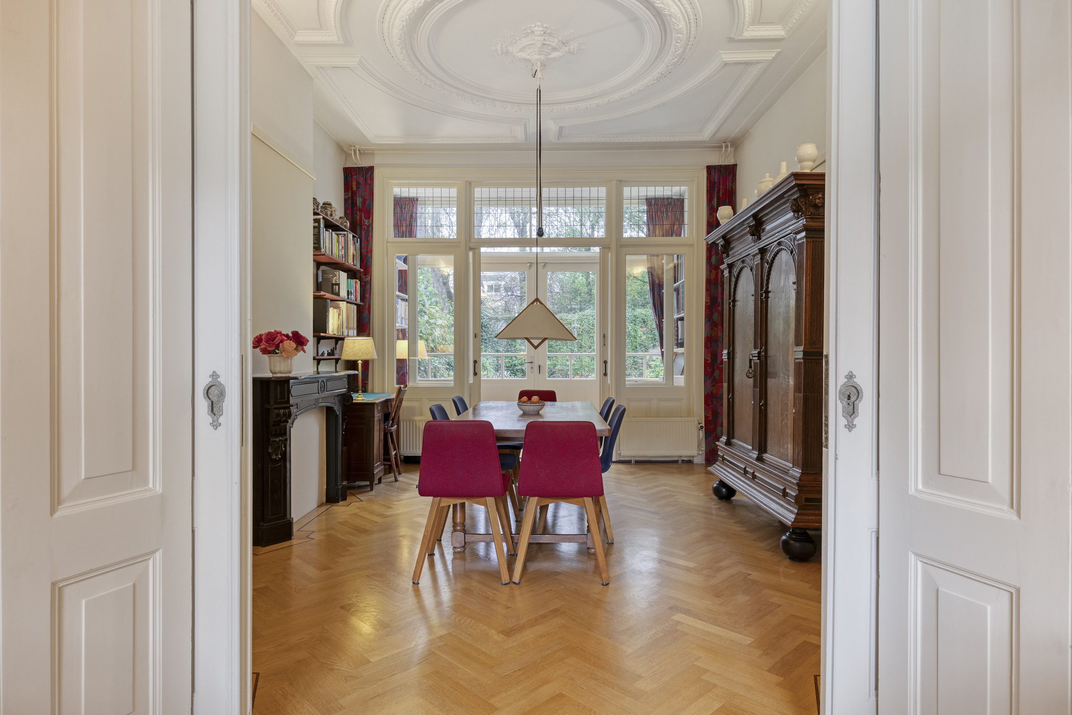 De entree maakt direct indruk: een vestibule met beschilderde ramen van kunstenaar W. Reijenga, originele marmeren lambrisering en sierlijk stucwerk. Binnen vind je nog talloze oorspronkelijke details zoals hoge plafonds met ornamenten, drie zwart marmeren schouwen, fraai houtwerk en klassieke paneeldeuren. De combinatie van authenticiteit en royale ruimtes geeft de villa een unieke uitstraling.