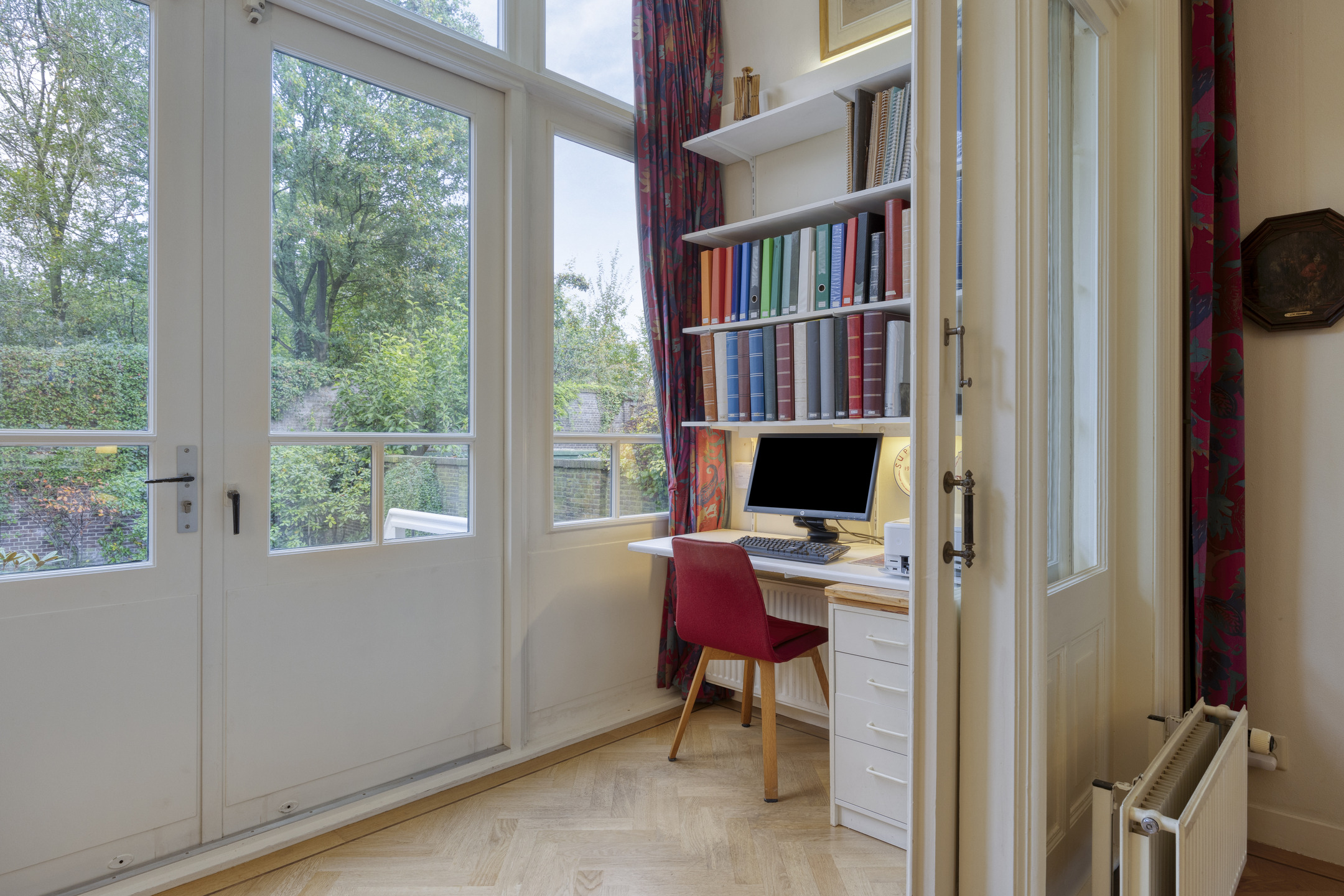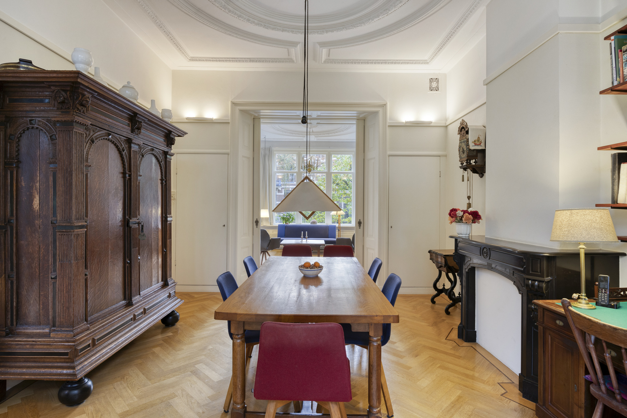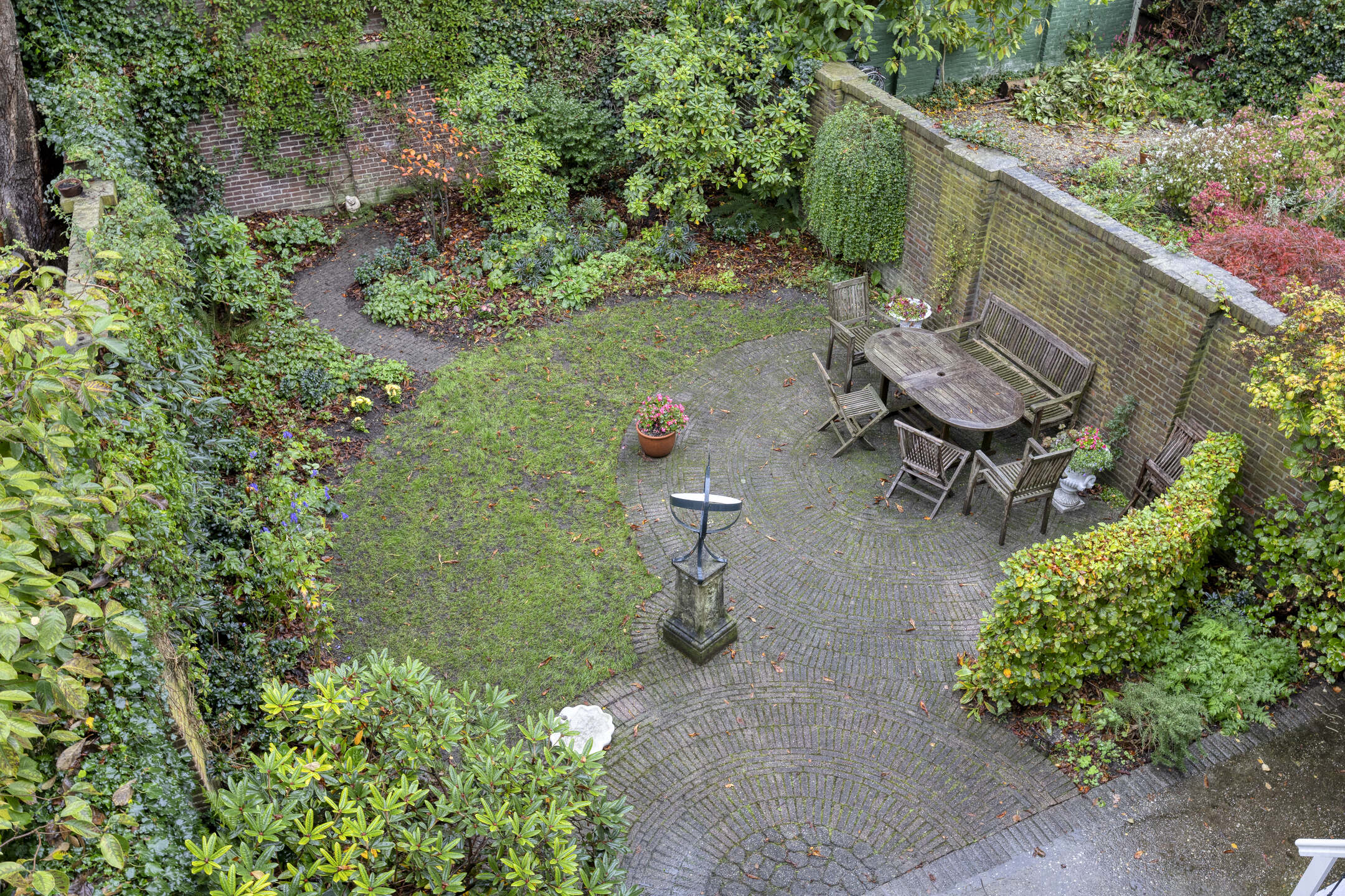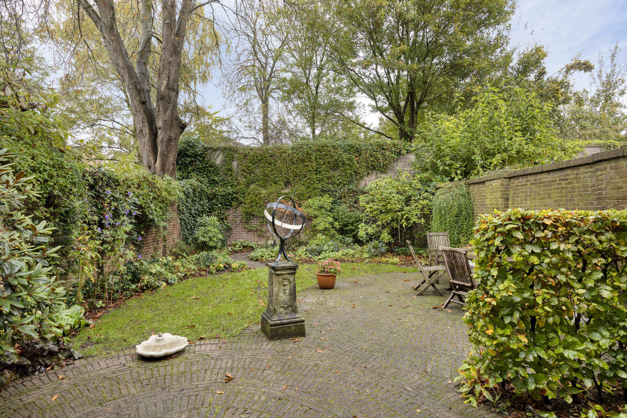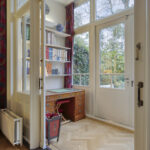 Prachtige hal met ornamentenplafond, origineel fonteintje en fraaie trapopgang. Kamer en suite met vier vaste kasten, schuifdeuren en twee zwart marmeren schouwen. Aansluitend een lichte serre met openslaande deuren naar de ommuurde binnentuin, die direct grenst aan de gezamenlijke ecologische watertuin – een groene, rustige oase zonder directe achterburen. Voor- en achtertuin zijn aangelegd volgens een stijlvast ontwerp van tuinarchitect Miek Versteegh. De keuken is praktisch ingericht en grenst aan de eetkamer.