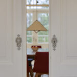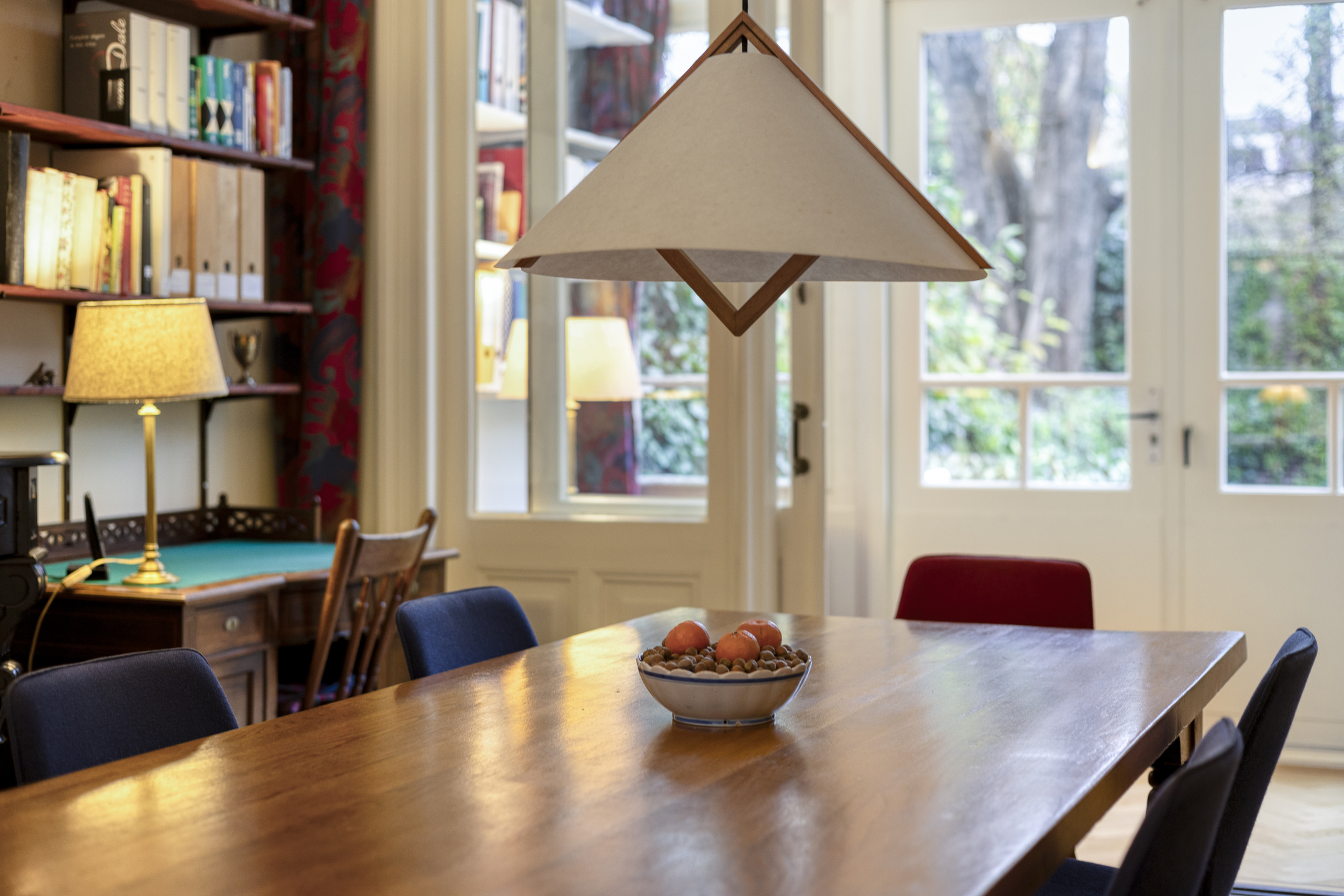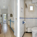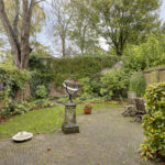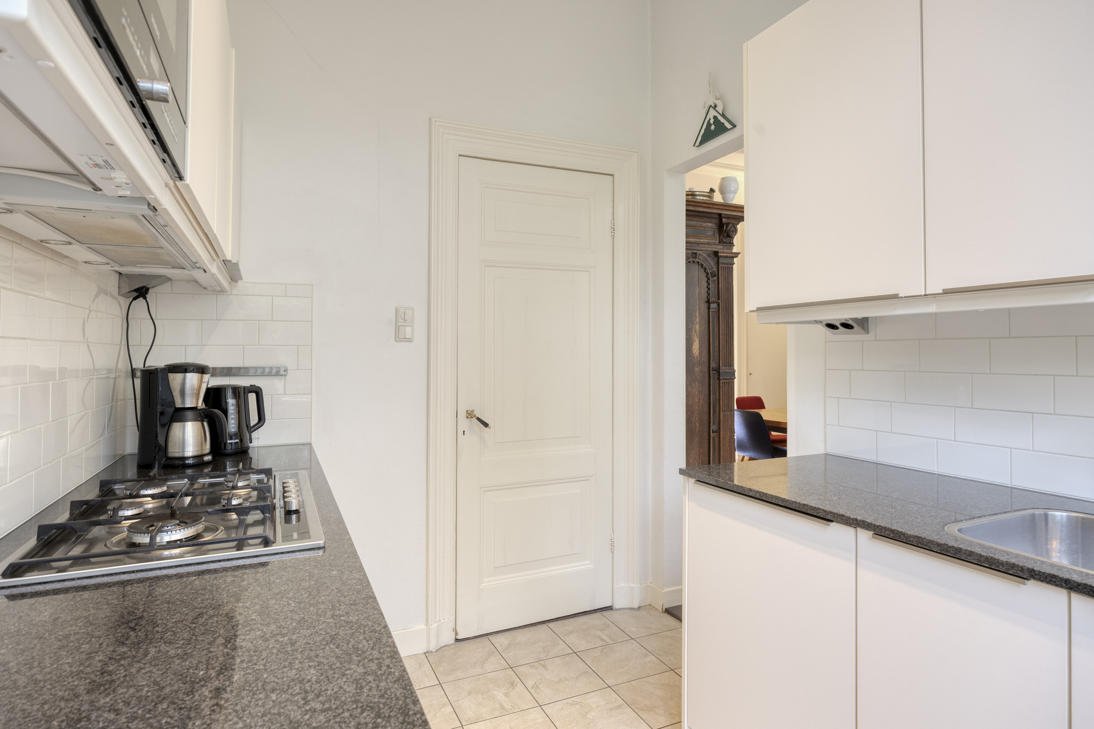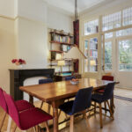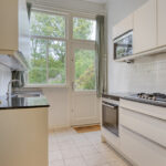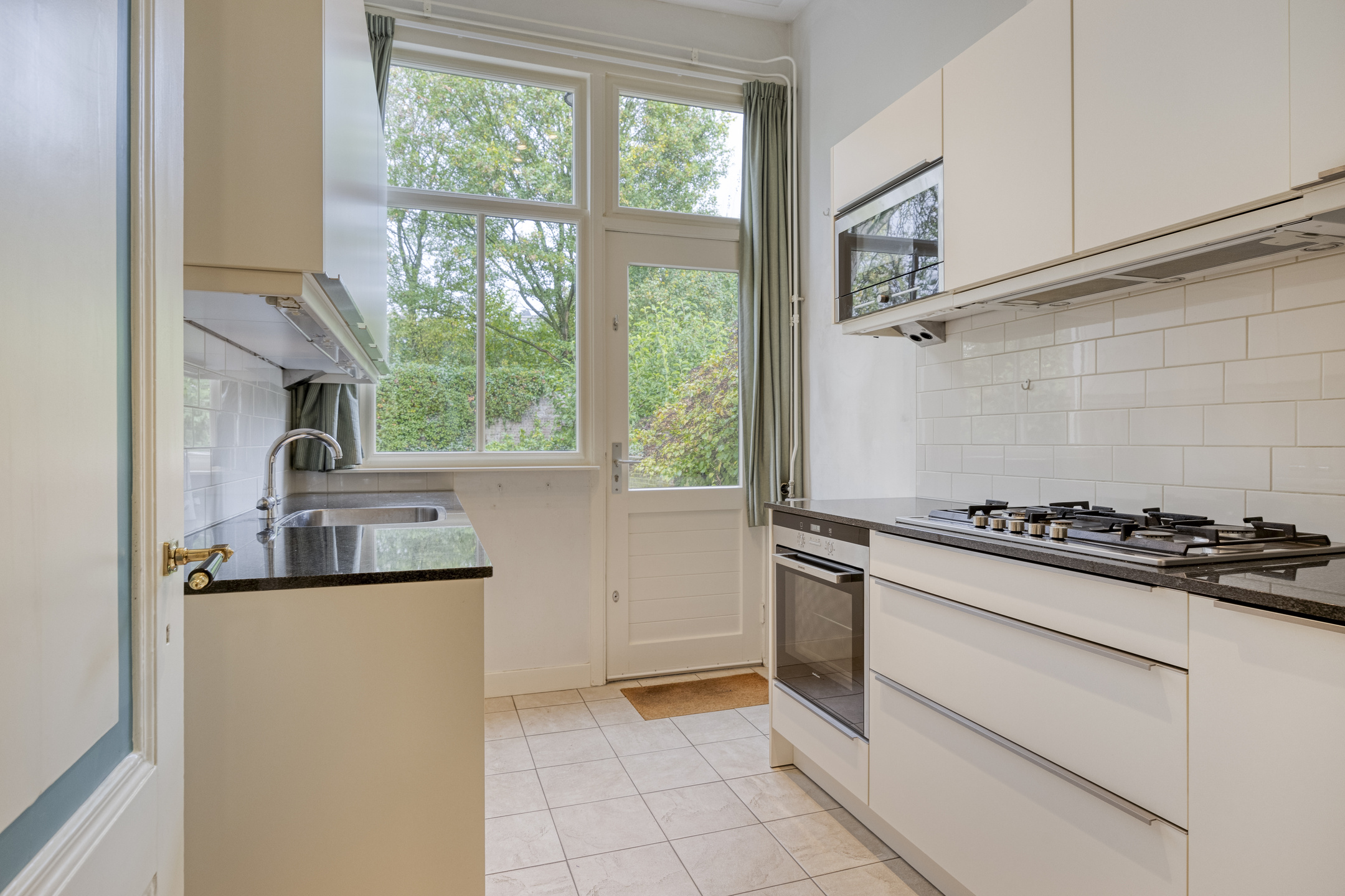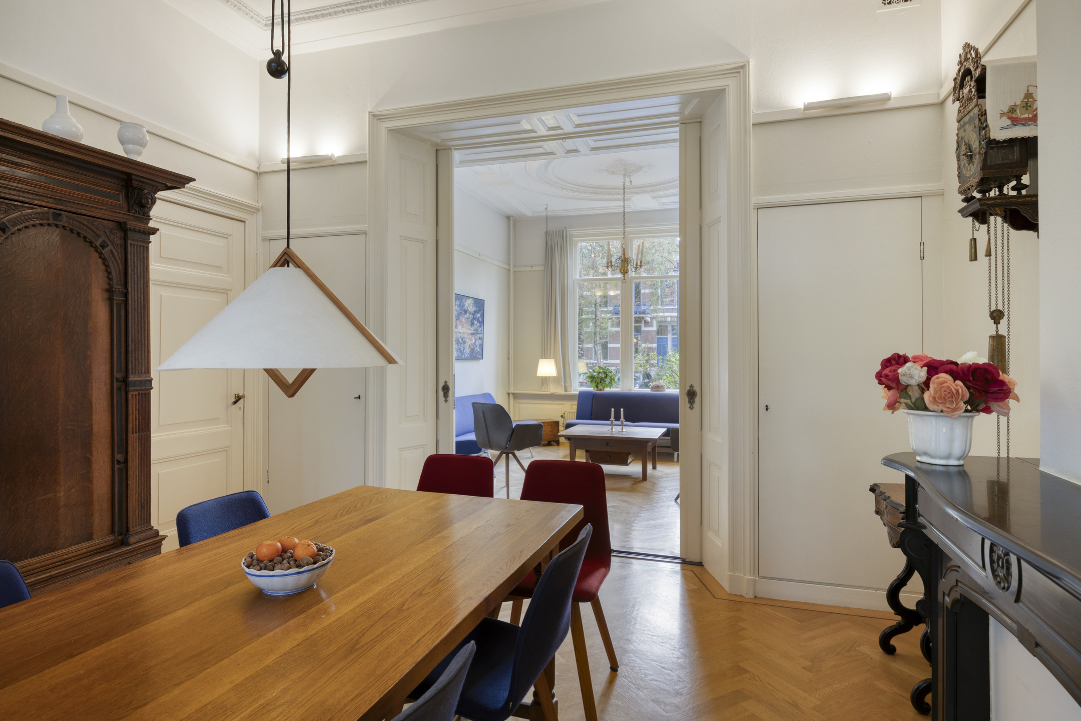 Prachtige hal met ornamentenplafond, origineel fonteintje en fraaie trapopgang. Kamer en suite met vier vaste kasten, schuifdeuren en twee zwart marmeren schouwen. Aansluitend een lichte serre met openslaande deuren naar de ommuurde binnentuin, die direct grenst aan de gezamenlijke ecologische watertuin – een groene, rustige oase zonder directe achterburen. Voor- en achtertuin zijn aangelegd volgens een stijlvast ontwerp van tuinarchitect Miek Versteegh. De keuken is praktisch ingericht en grenst aan de eetkamer.