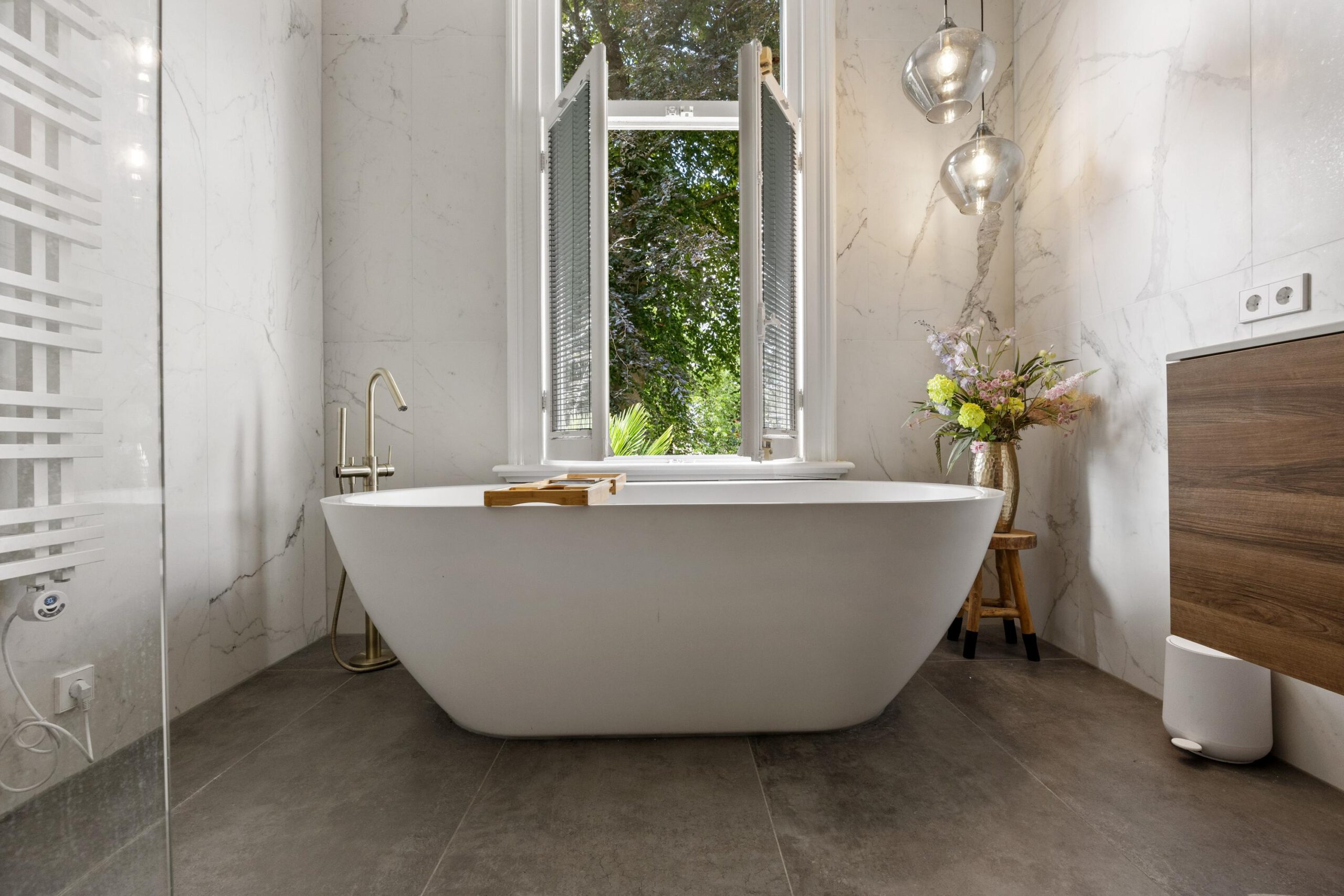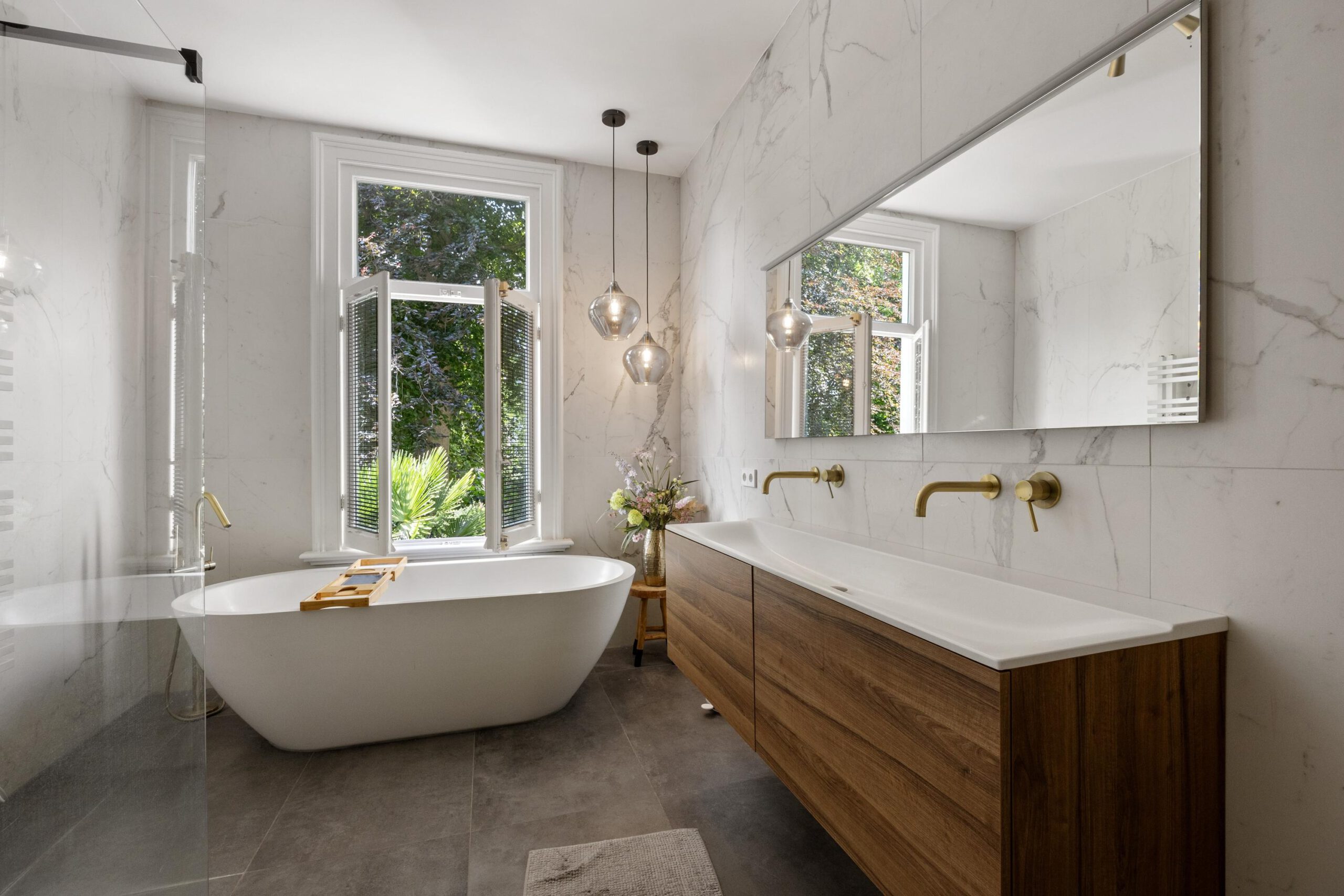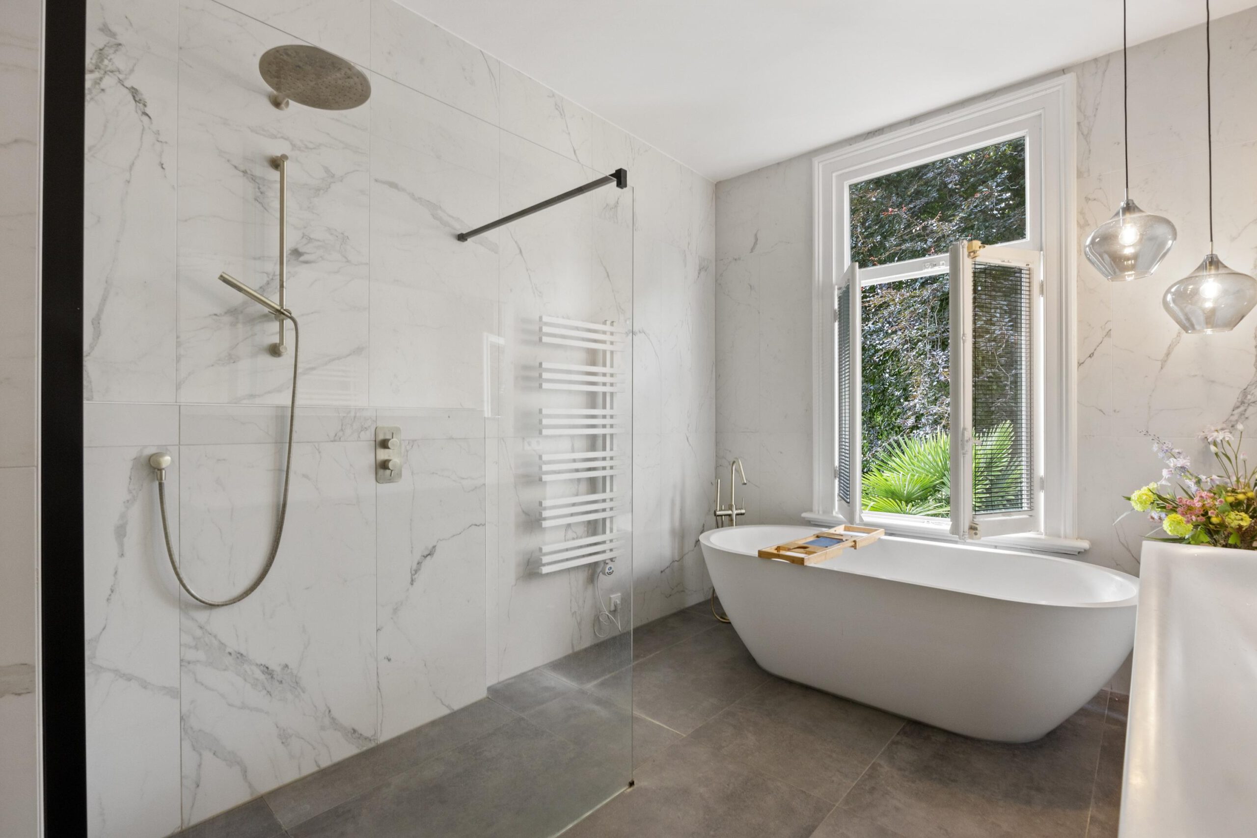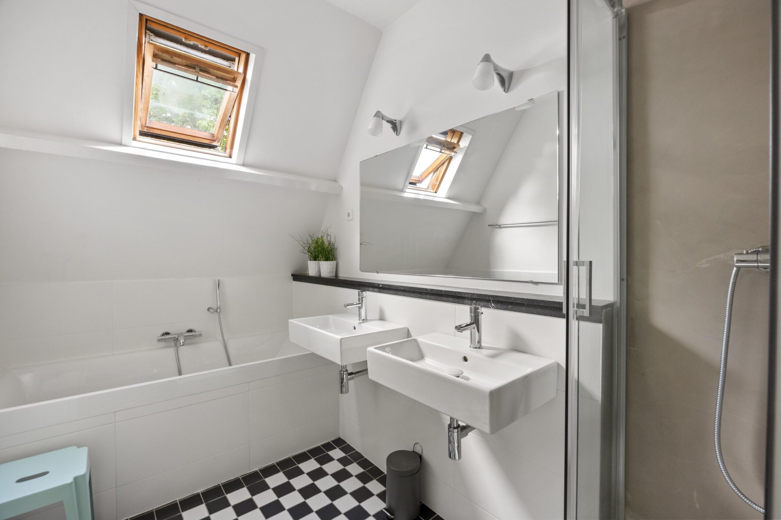 Op de eerste verdieping bevindt zich een luxe, recent gerenoveerde badkamer met een vrijstaand bad, dubbele wastafel en een royale inloopdouche. In deze badkamer kom je na een lange dag helemaal tot rust. Op deze verdieping vind je tevens twee ruime slaapkamers, waarvan één toegang biedt tot een balkon met uitzicht op de groene achtertuin. Deze verdieping beschikt ook over een inloopkast. Deze ruimte kan ook eenvoudig aangepast worden om als extra slaapkamer te gebruiken.