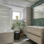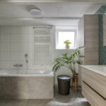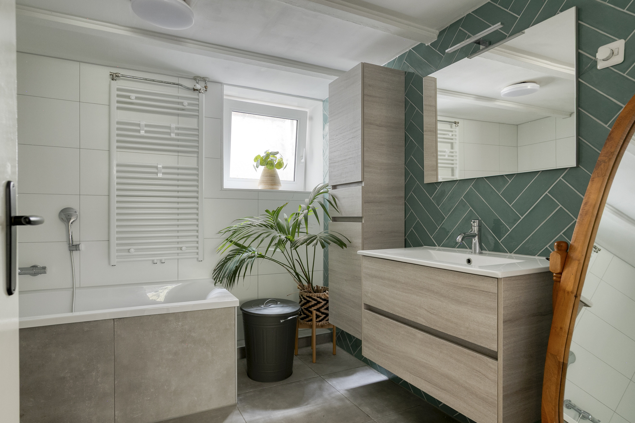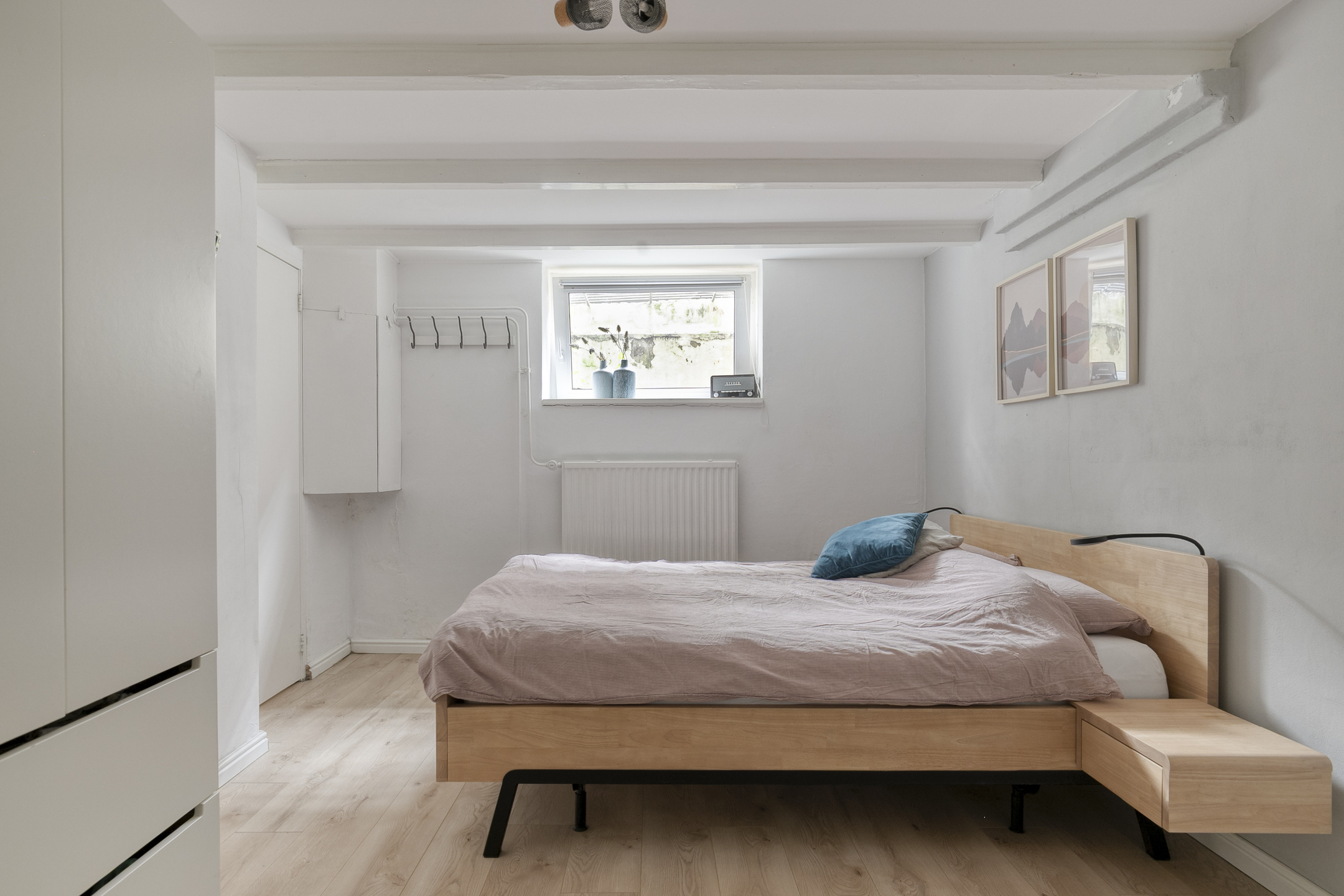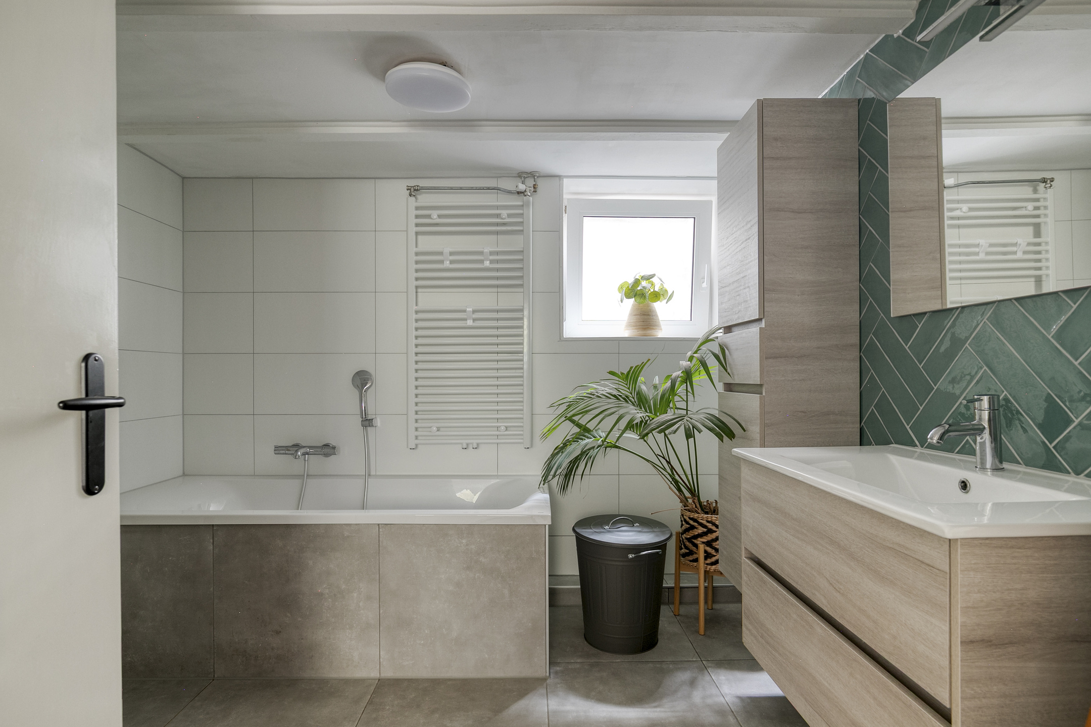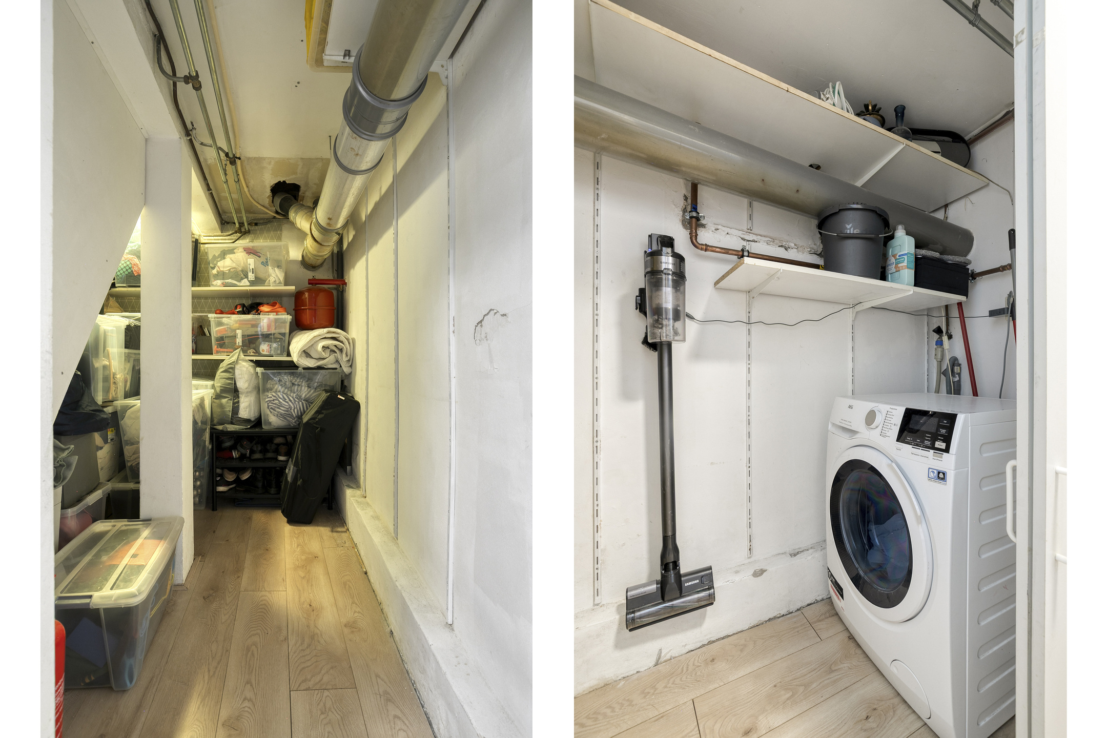 Via de trap bereik je het souterrain met verrassend veel ruimte en een goede stahoogte. Hier vind je een royale slaapkamer, een ruime hal met berging en wasruimte, én de vernieuwde badkamer stijlvol afgewerkt en uitgerust met een ligbad, aparte douche en wastafelmeubel.