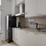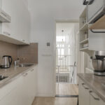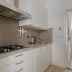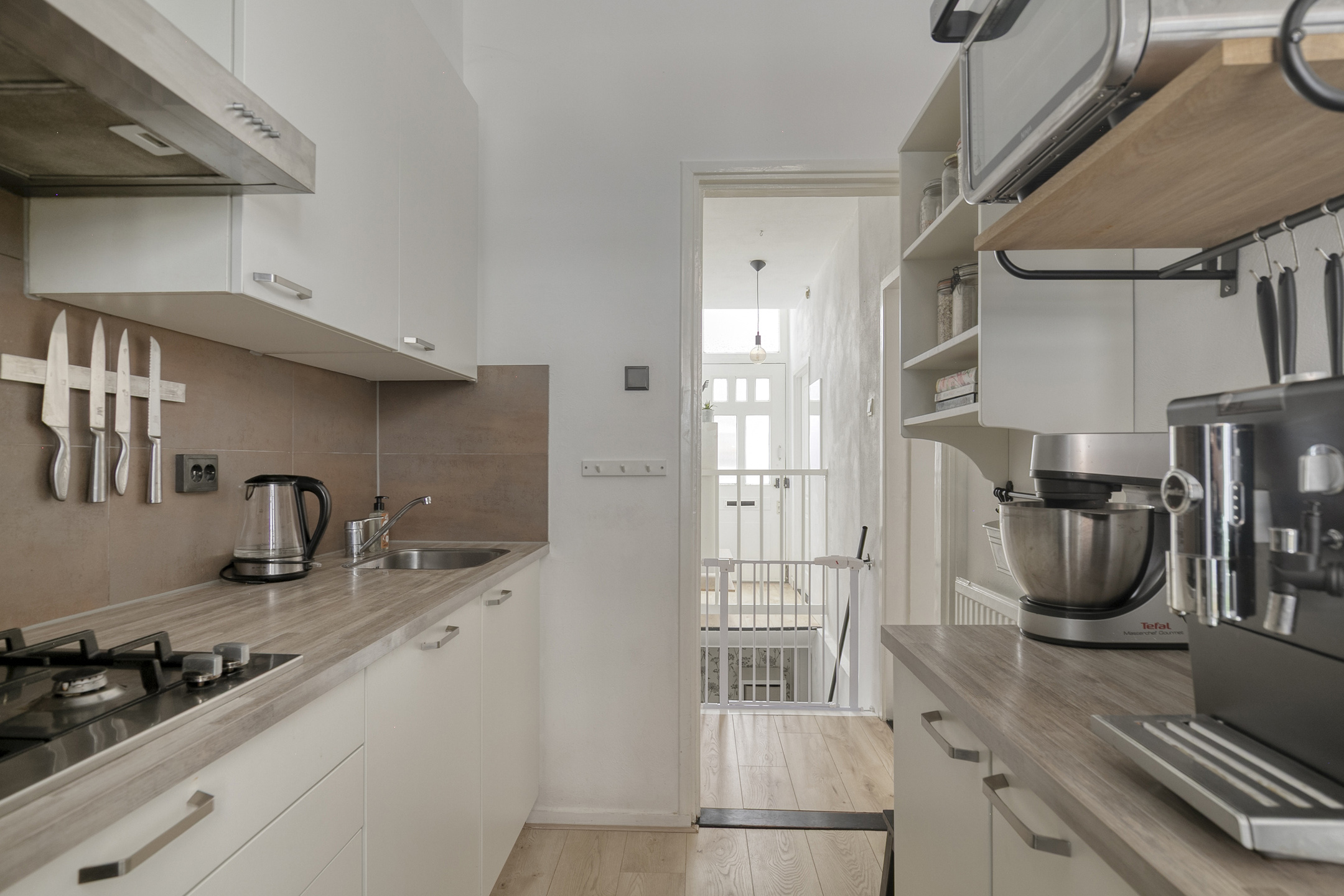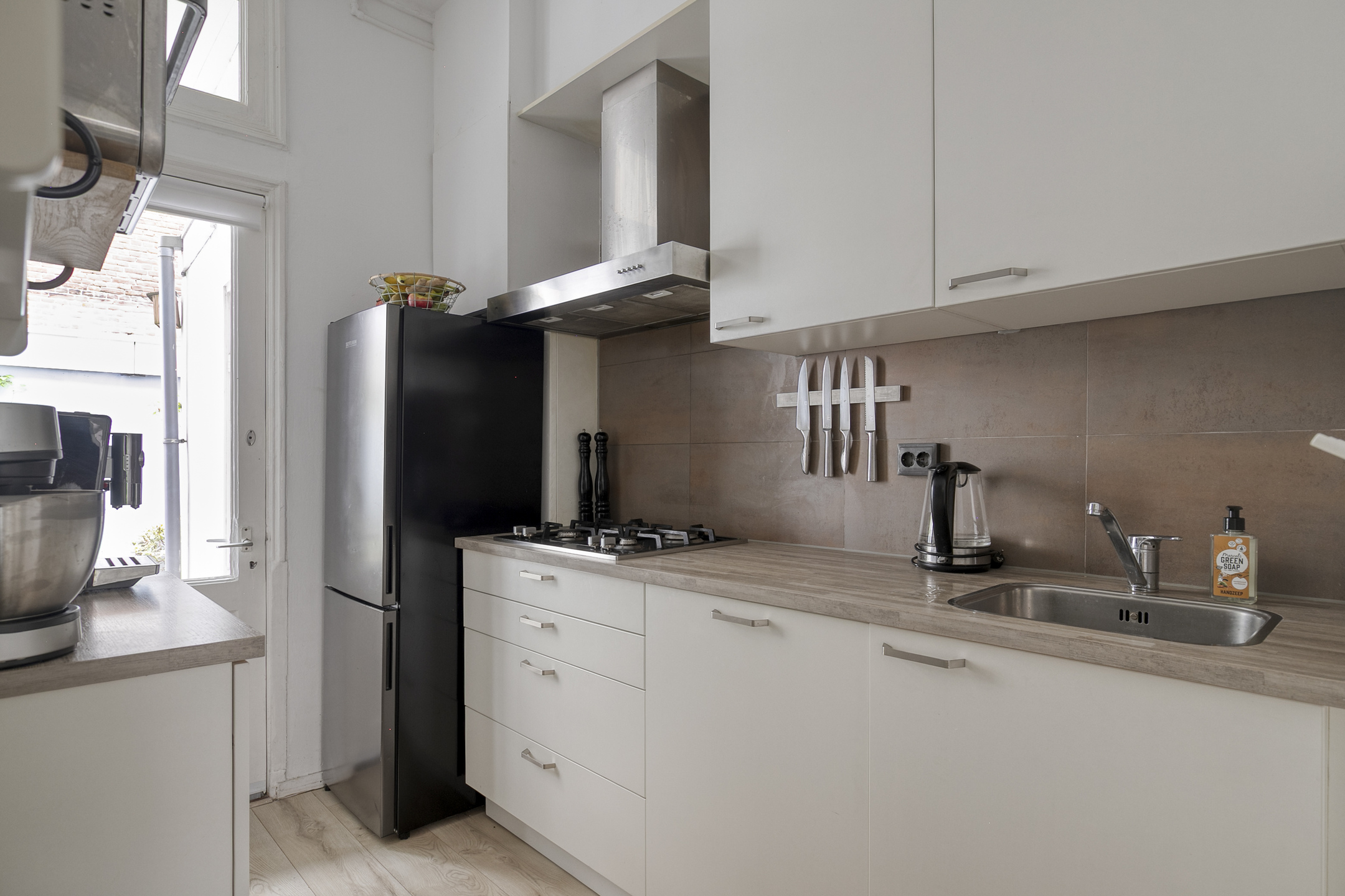 De keuken is voorzien van diverse inbouwapparatuur, waaronder een vaatwasser, gaskookplaat en afzuigkap, en biedt eveneens toegang tot de tuin.