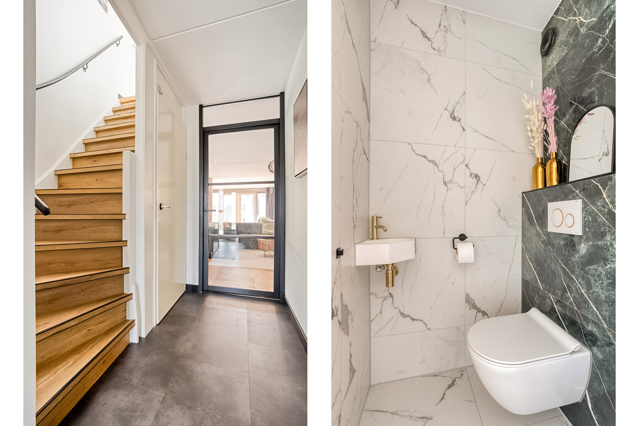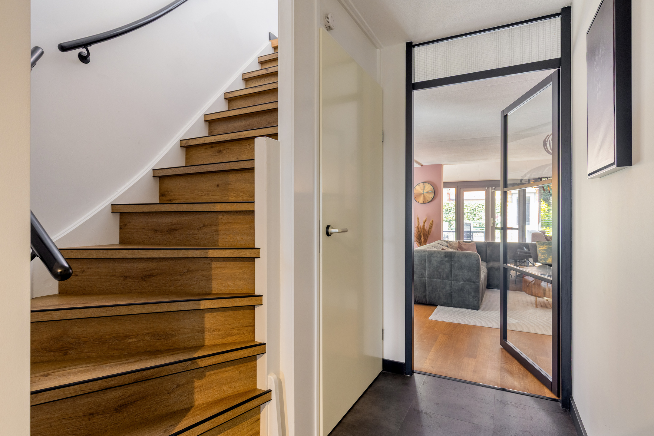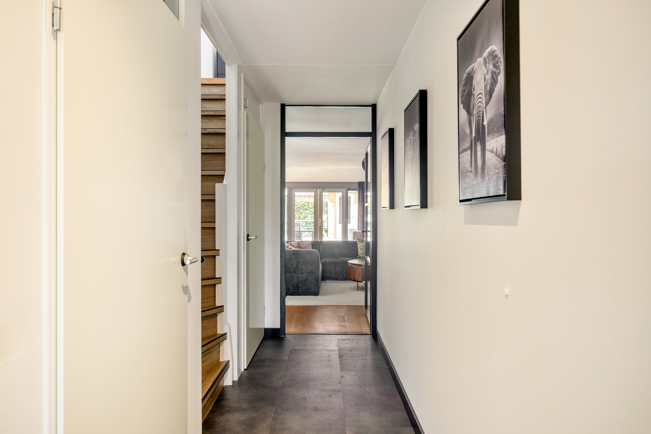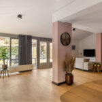 Bij binnenkomst in de representatieve hal met vernieuwde meterkast valt direct het hoogwaardige afwerkingsniveau op. Het schilderwerk is in 2024 volledig uitgevoerd en de bestaande eikenhouten vloer van topkwaliteit is professioneel behandeld en opnieuw gelakt, dit zorgt voor een natuurlijke, warme uitstraling.