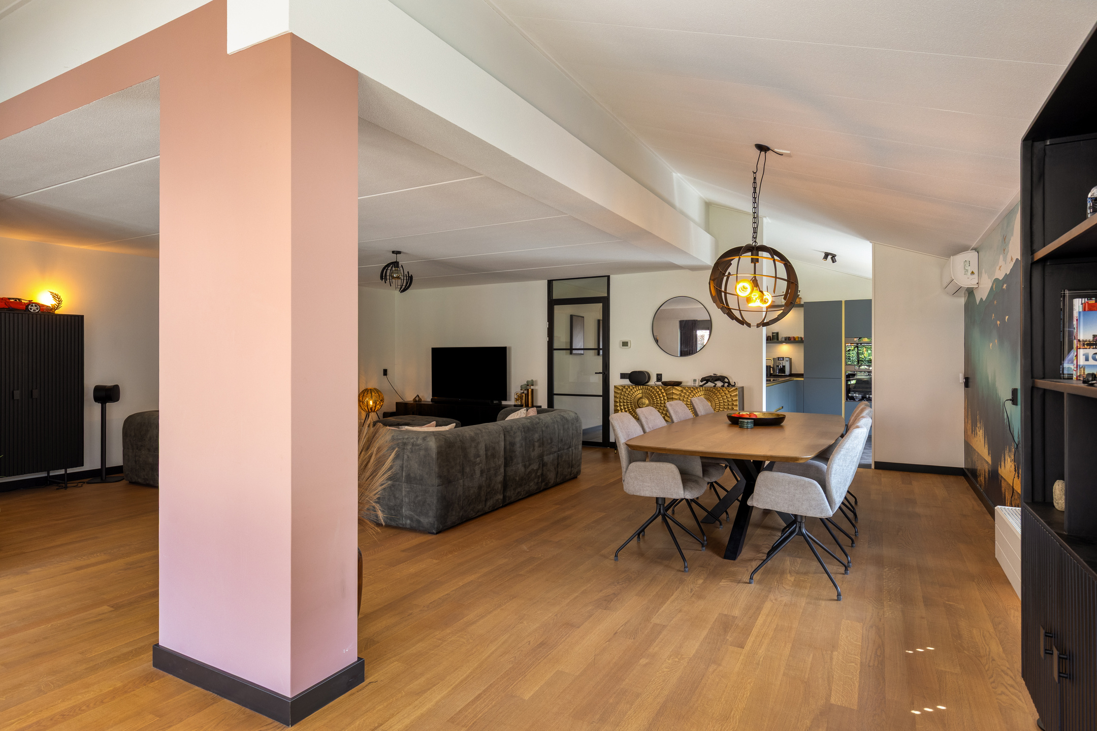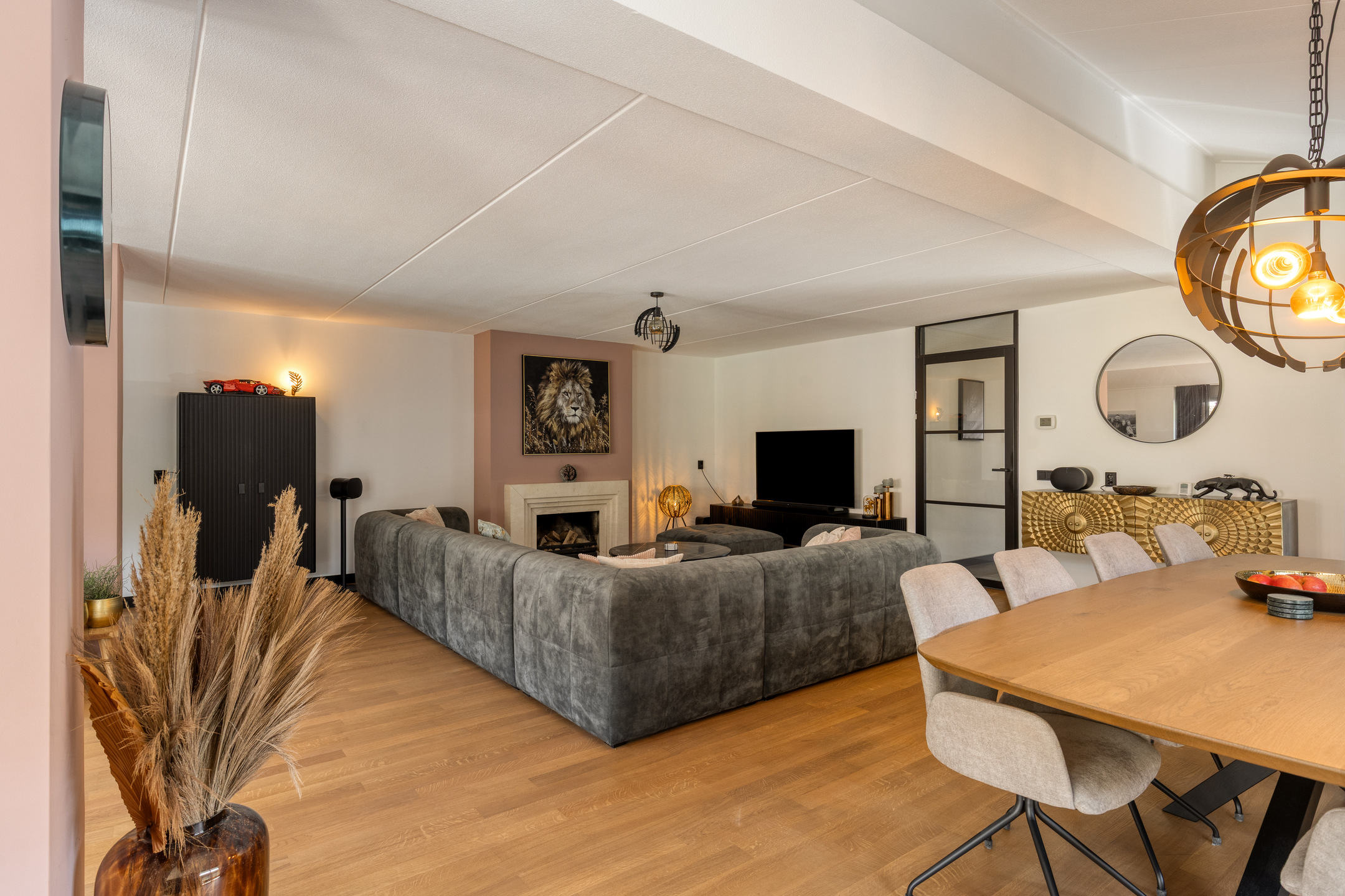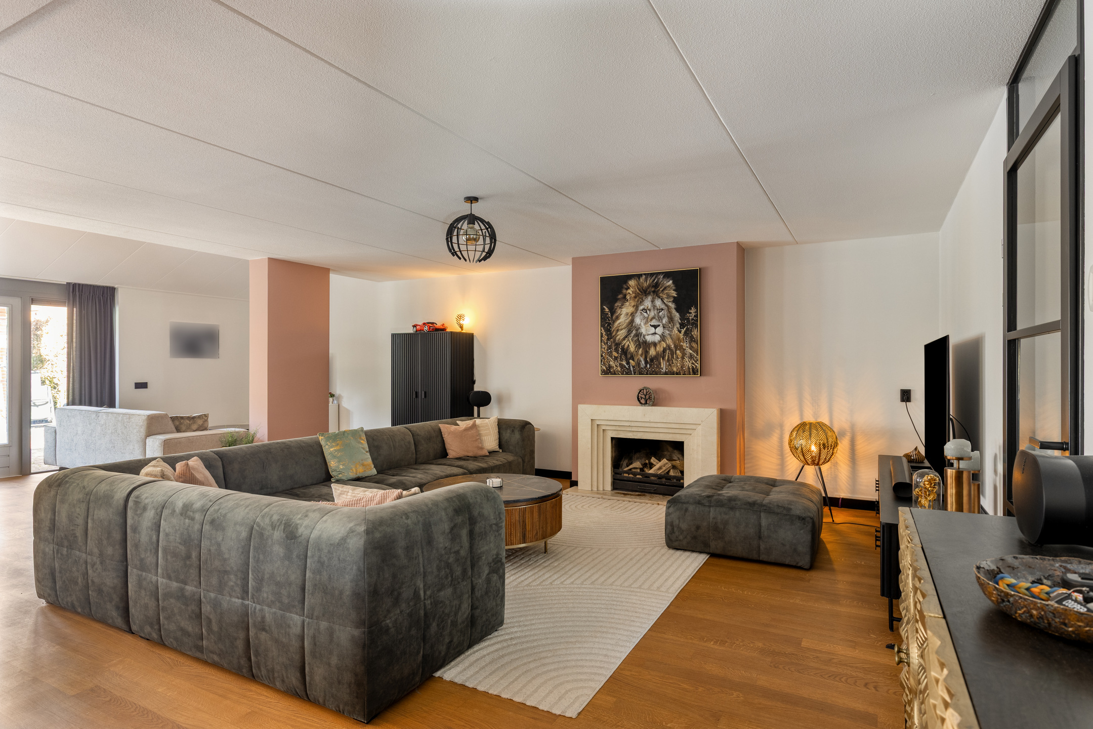 Aan de linkerzijde treft u een rustig gelegen kantoorruimte: de ideale plek voor de veeleisende thuiswerker (voorzien van glasvezel). De royale woonkamer is een baken van licht en beschikt over een sfeervolle open haard. De slimme indeling biedt een aparte tv-hoek; een fijne plek waar de kinderen zich kunnen terugtrekken zonder het contact met de rest van het gezin te verliezen.