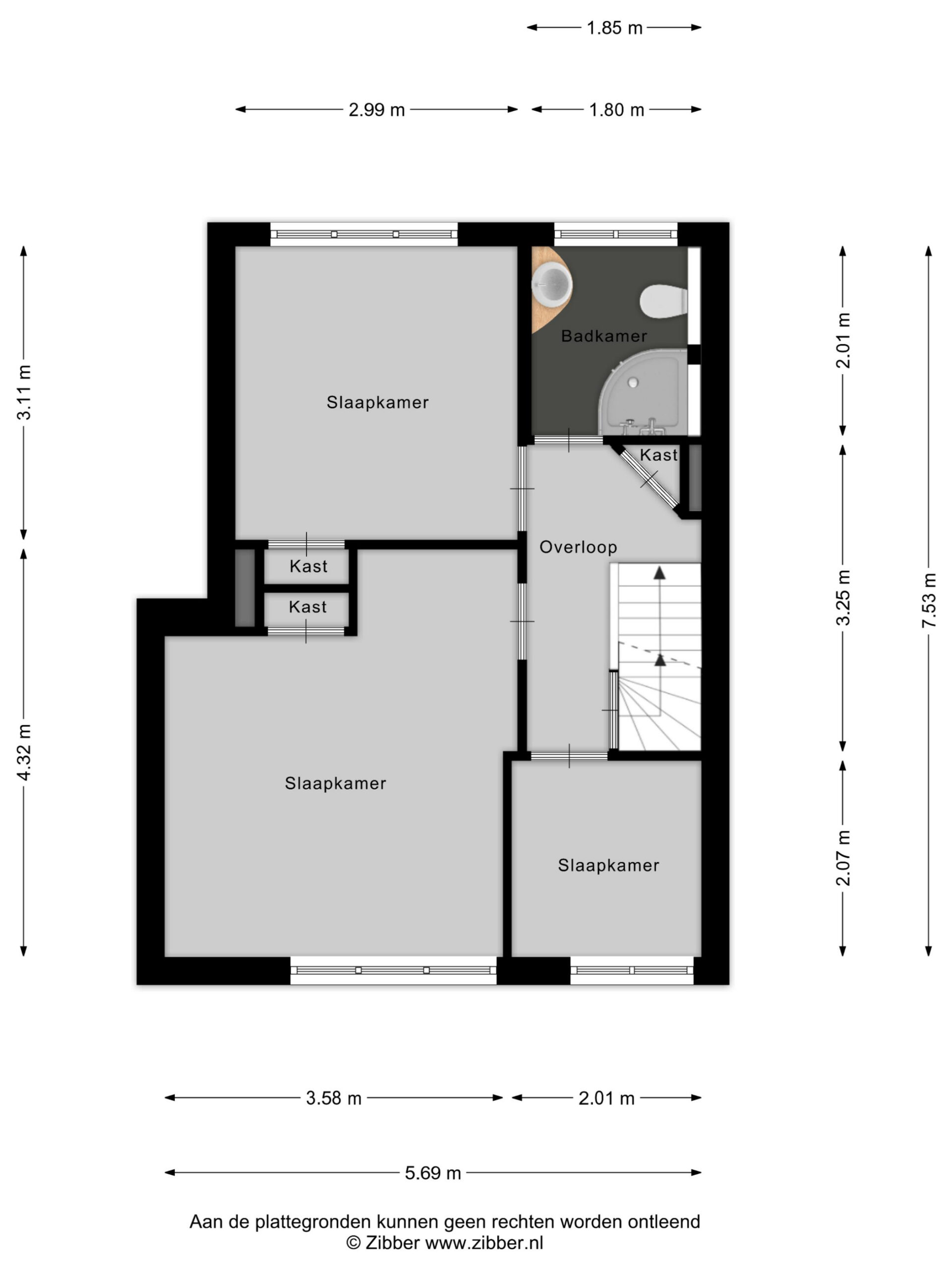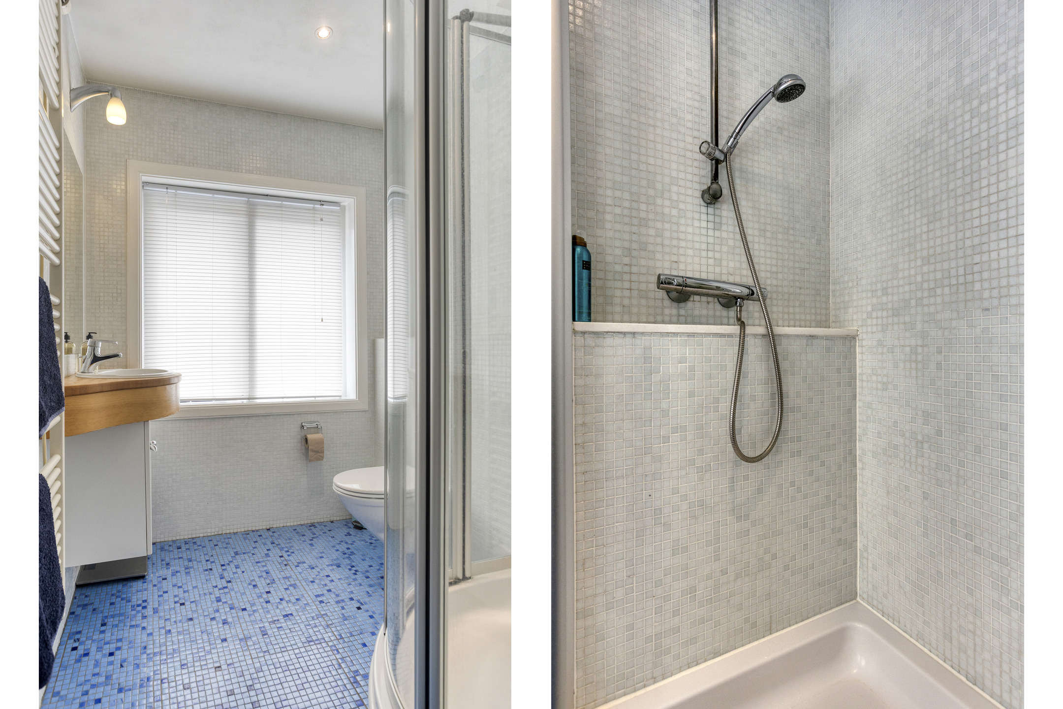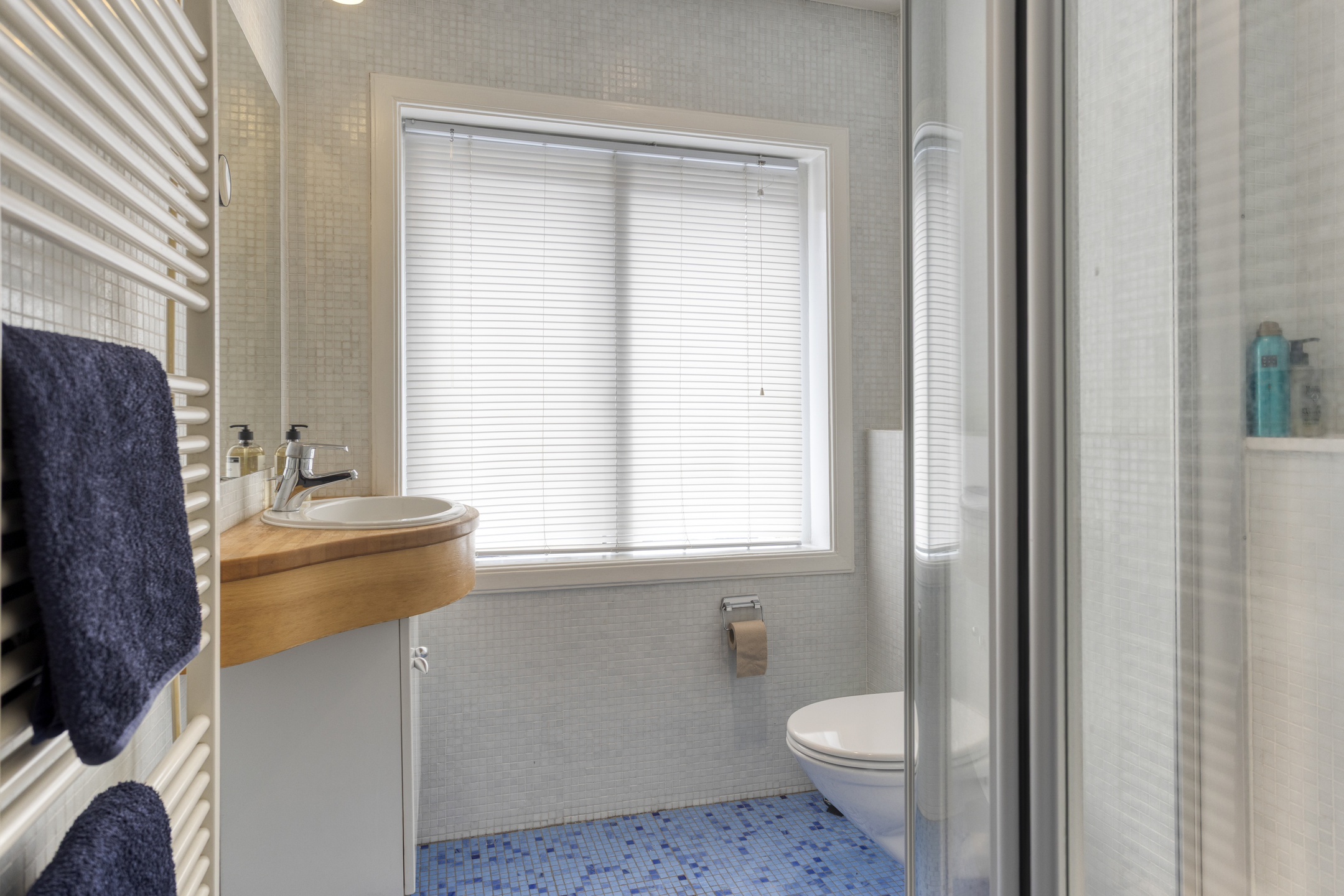 Vanaf de overloop heb je toegang tot drie slaapkamers: twee ruime kamers en een derde, kleinere kamer die zich uitstekend leent als kantoor, kinderkamer of inloopkast. Ook bevindt zich op deze verdieping de badkamer, die is uitgerust met een douche, een wastafel met meubel en een toilet.