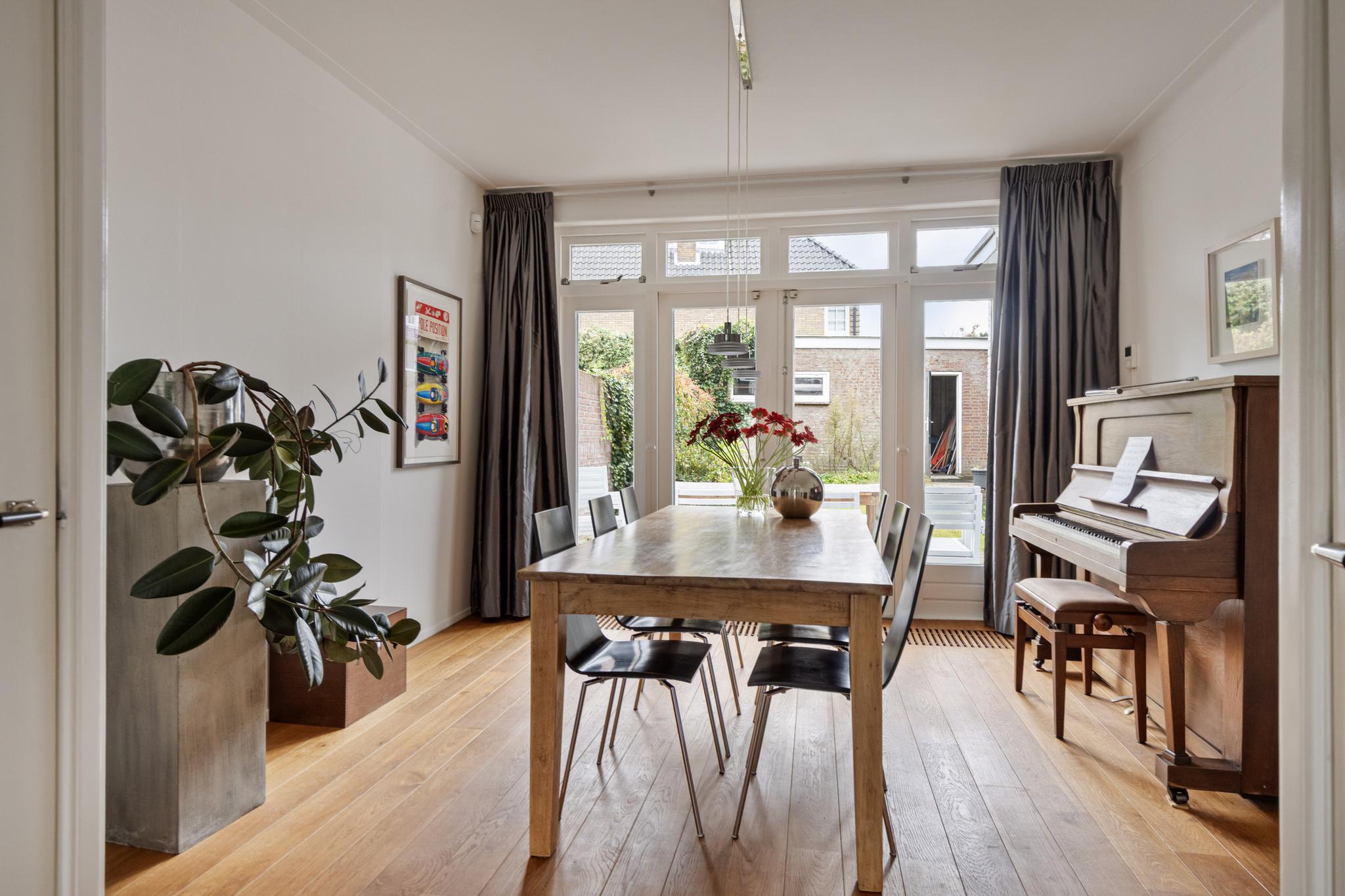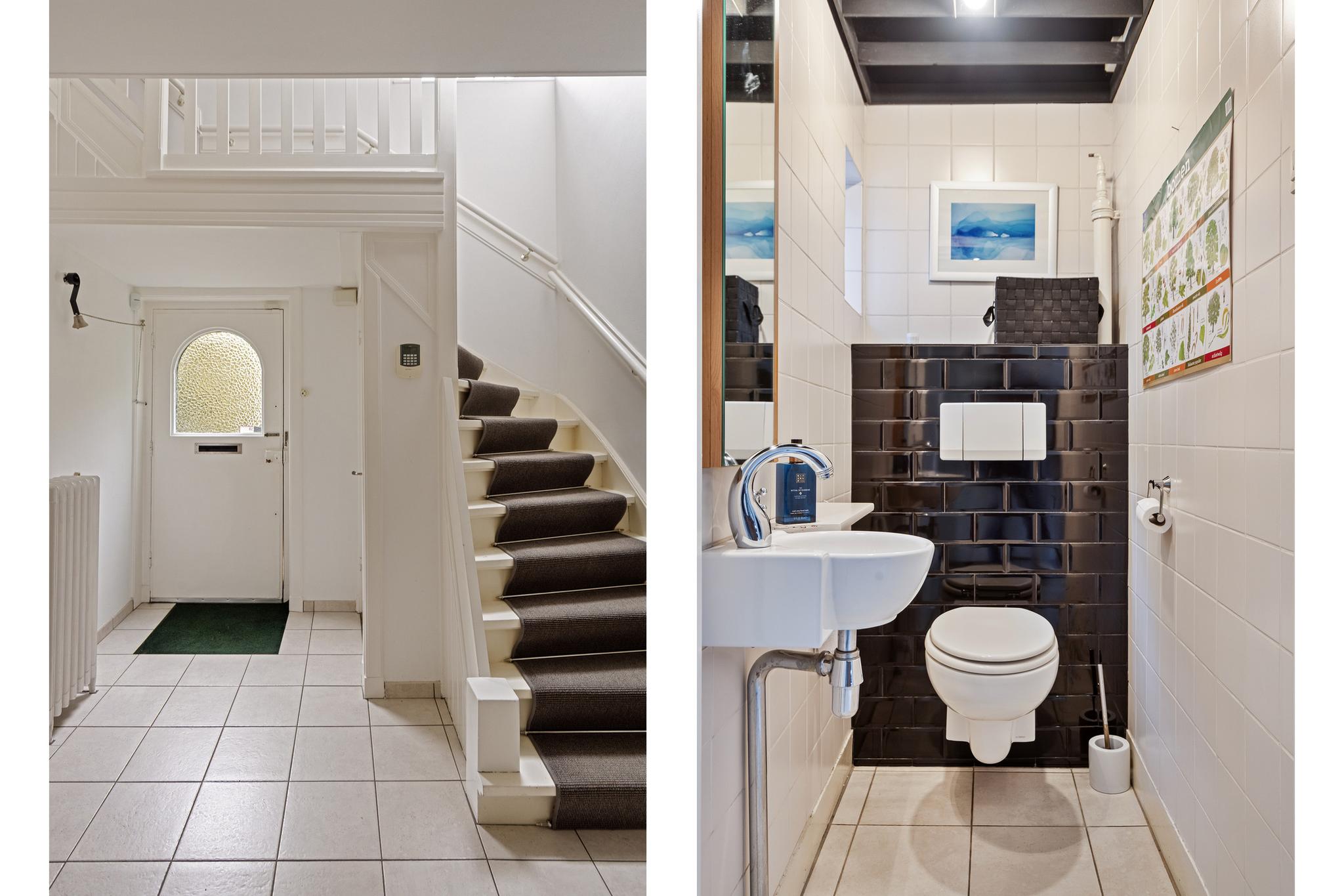 Entree, riante ontvangsthal met trappenhuis en toegang naar de verschillende ruimtes, toilet, dichte keuken met deur naar de tuin, woonkamer met prachtige ensuite deuren naar de eetkamer, vanuit de eetkamer heb je via de openslaande deuren toegang naar de zonnige tuin, de woonkamer is ruim te noemen en heeft een gezellige open haard.