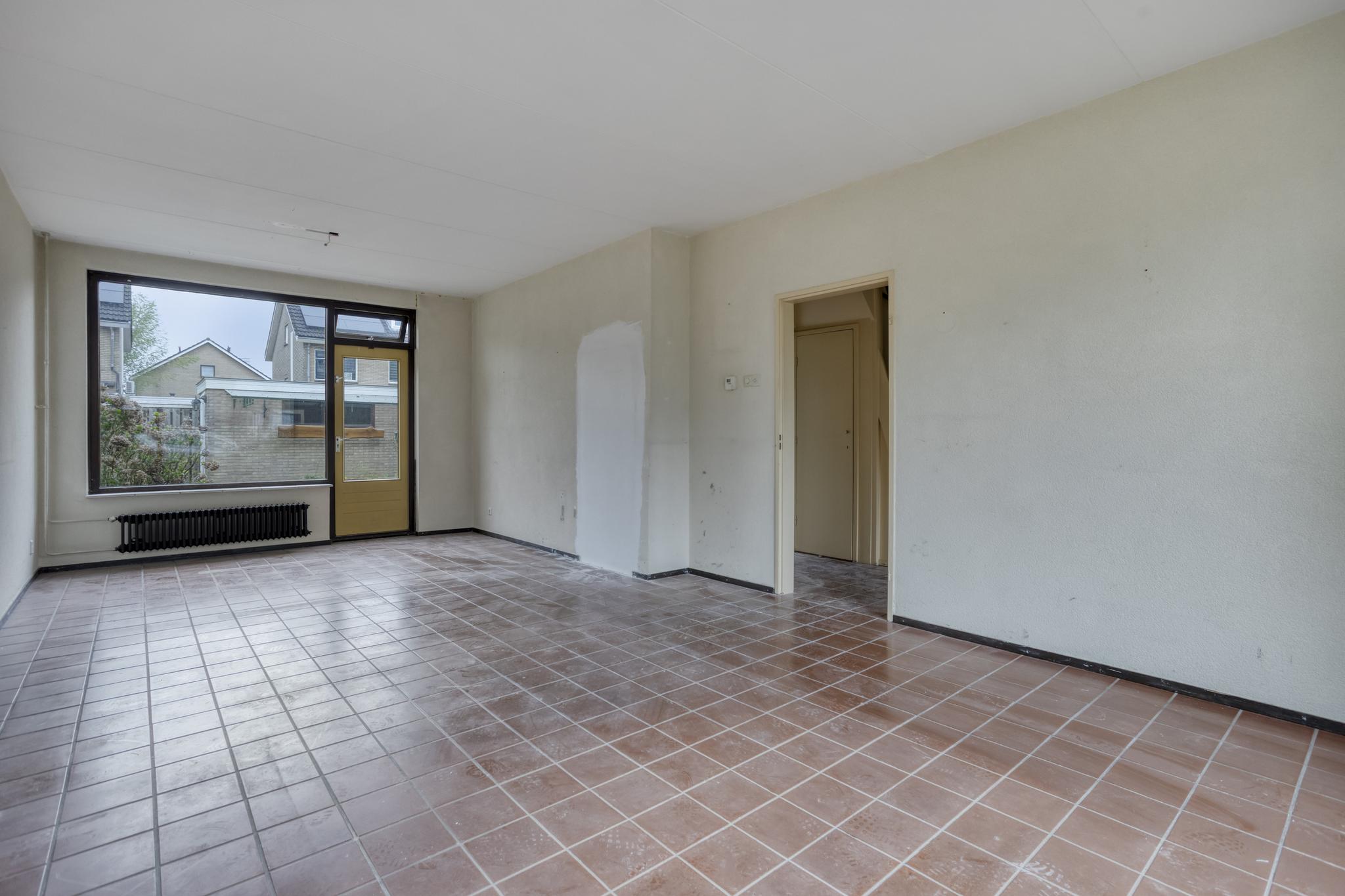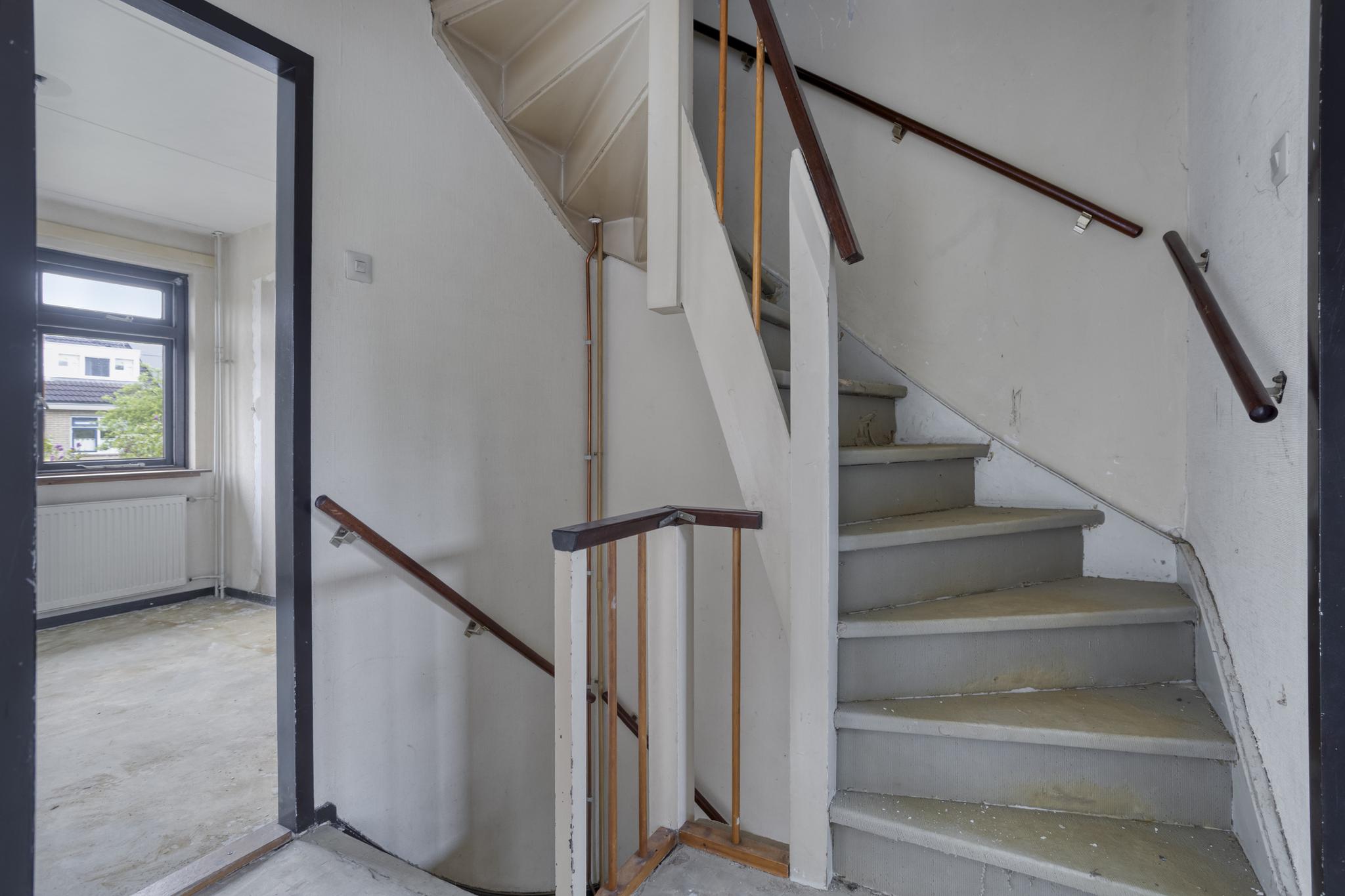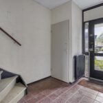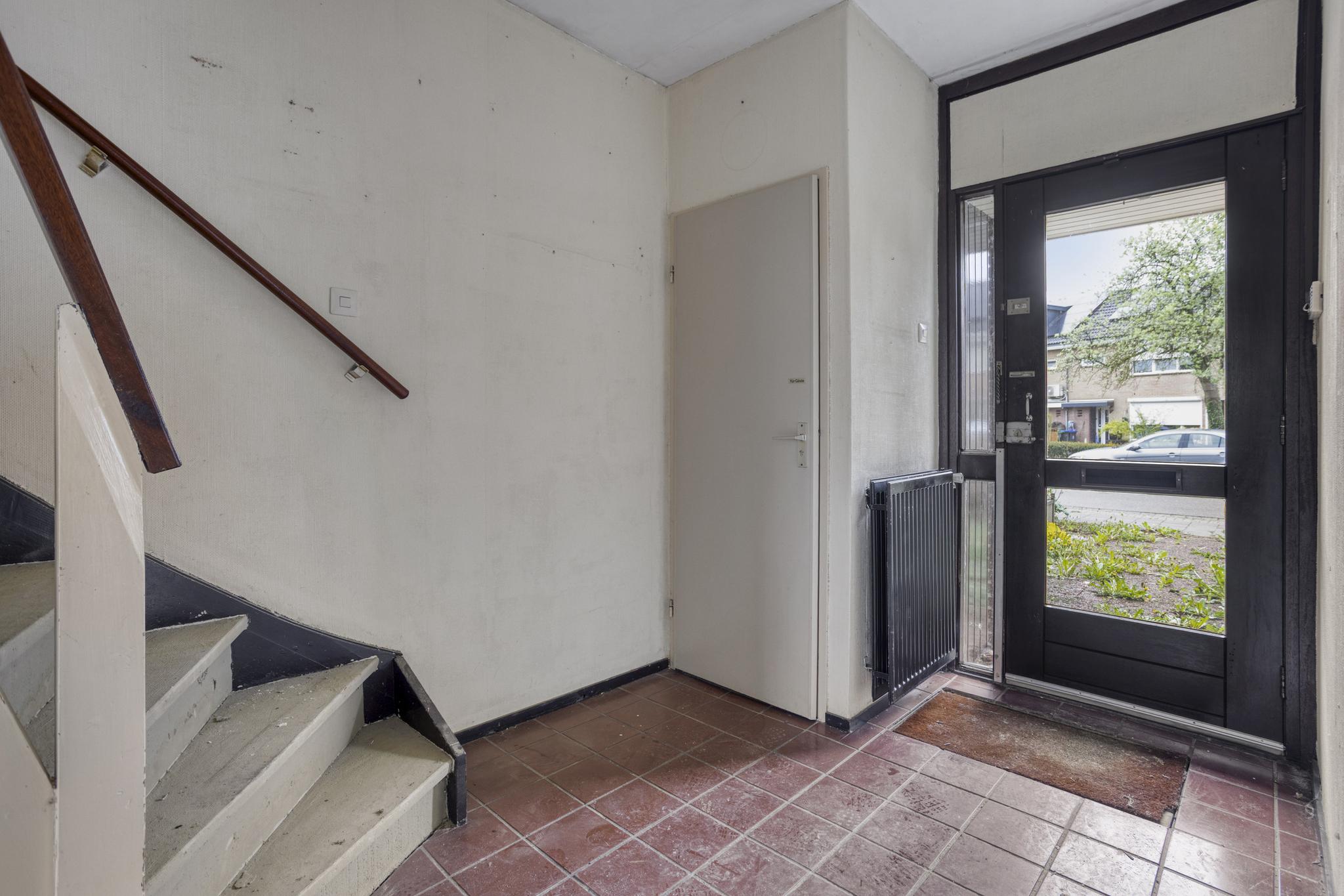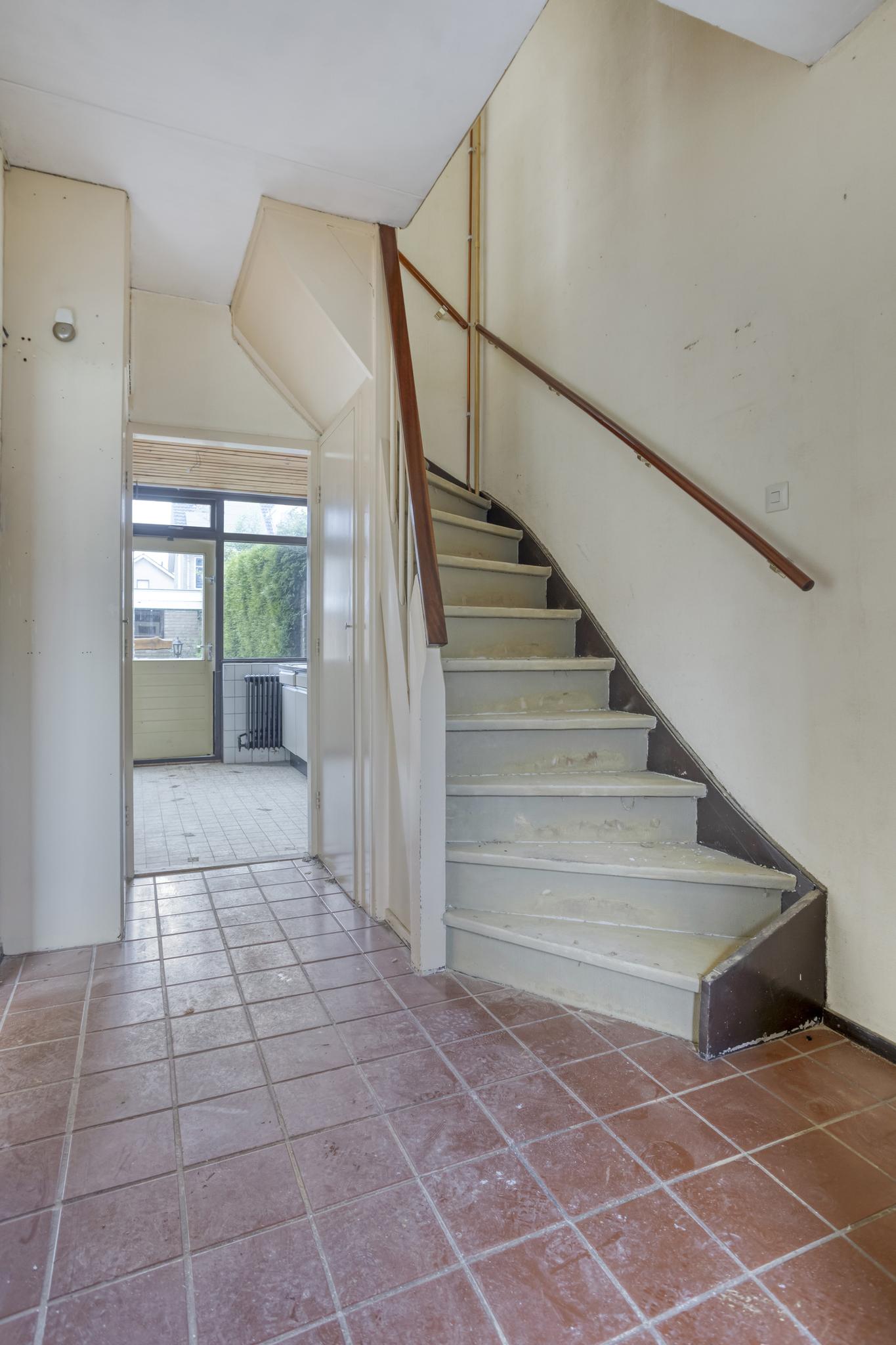 Entree, hal, toilet, trapkast, dichte keuken en royale woonkamer. Vanuit de woonkamer is er toegang tot de achtertuin.