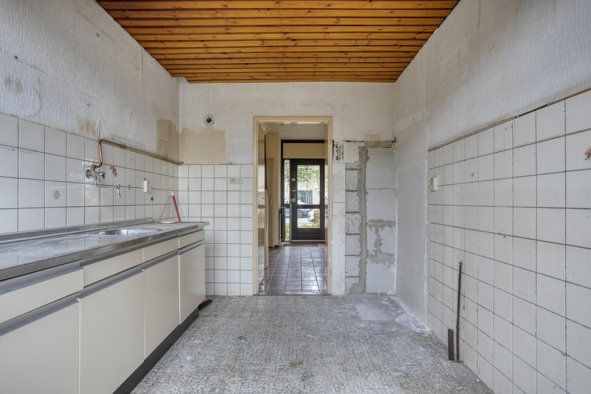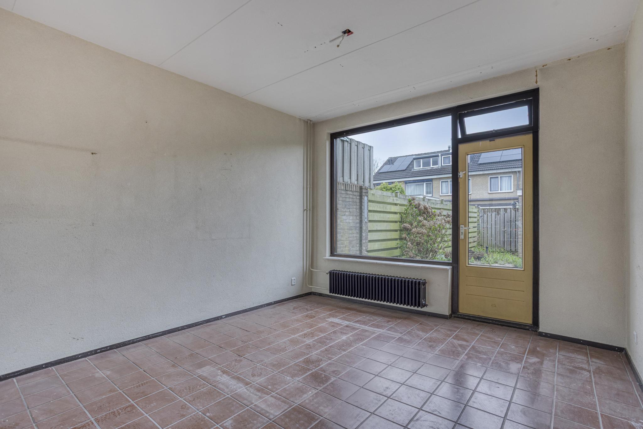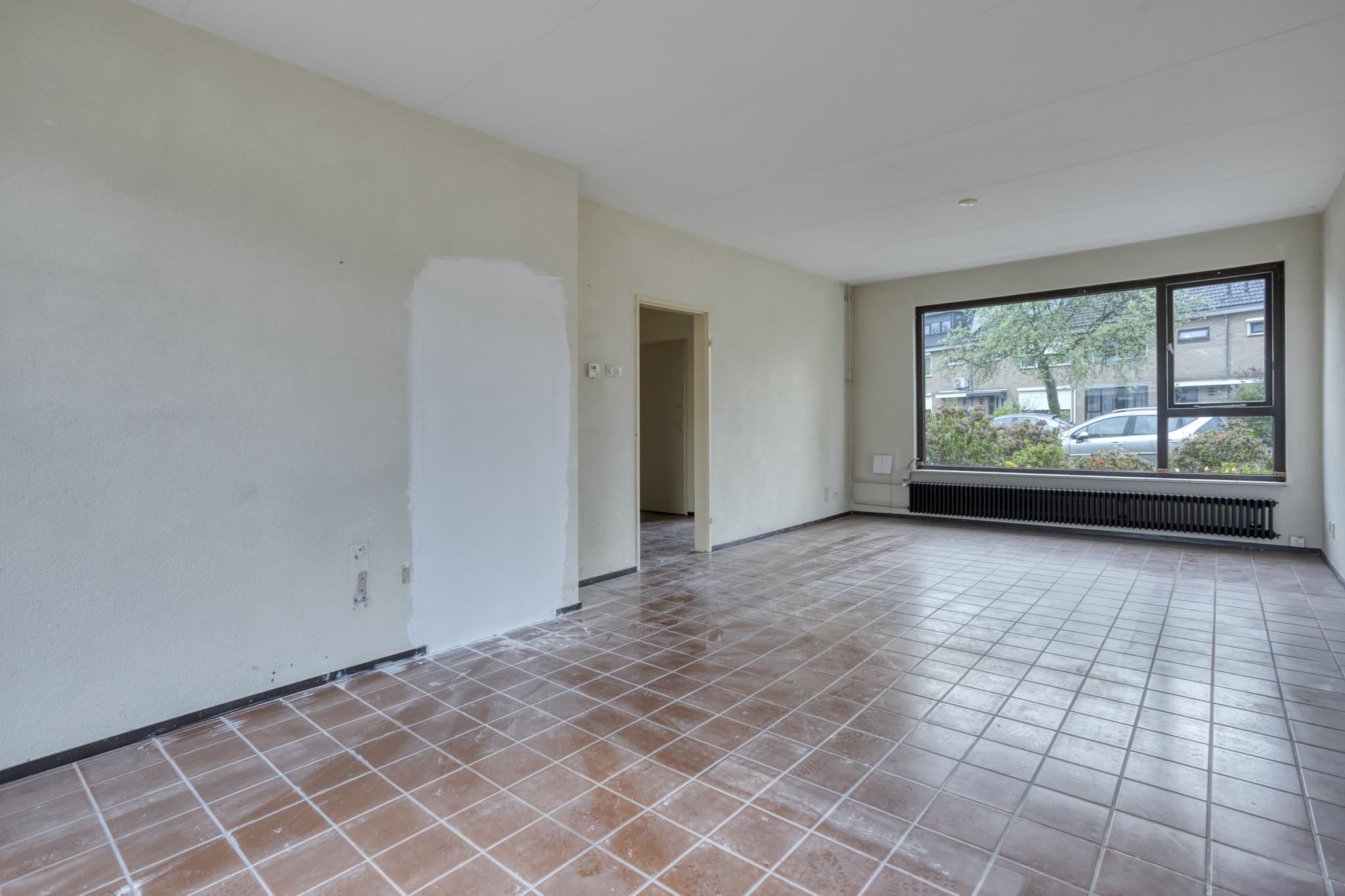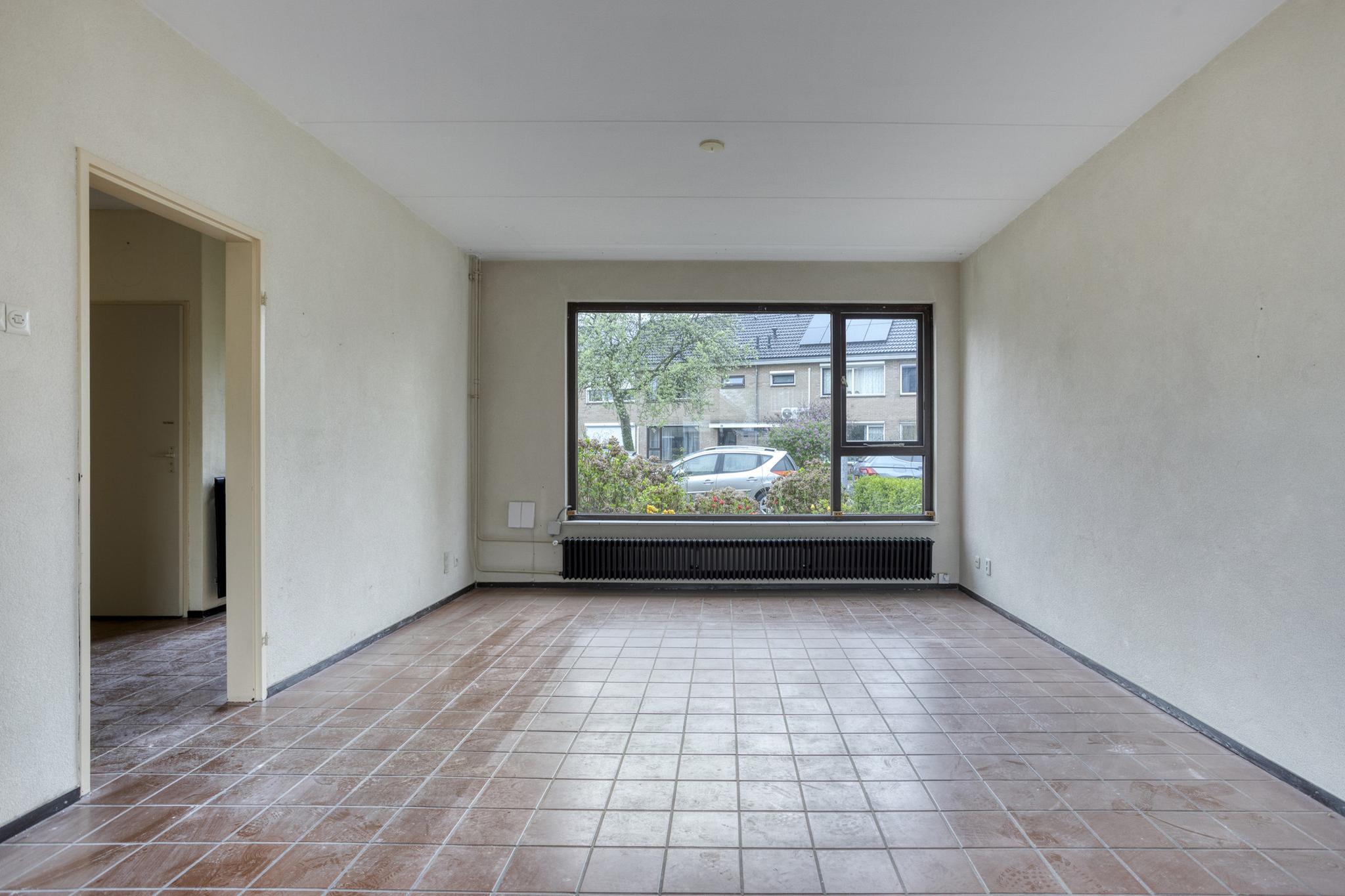 Entree, hal, toilet, trapkast, dichte keuken en royale woonkamer. Vanuit de woonkamer is er toegang tot de achtertuin.