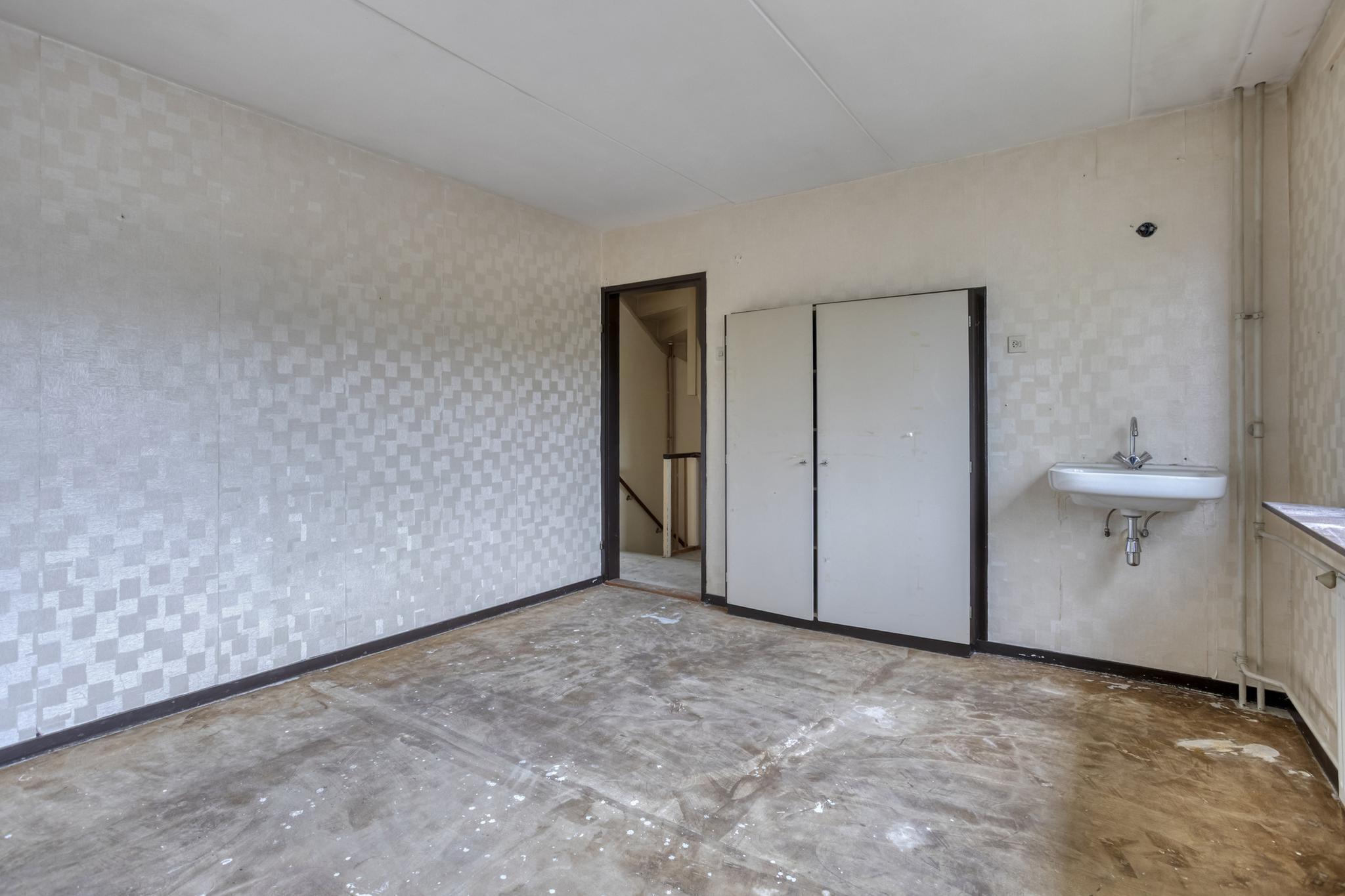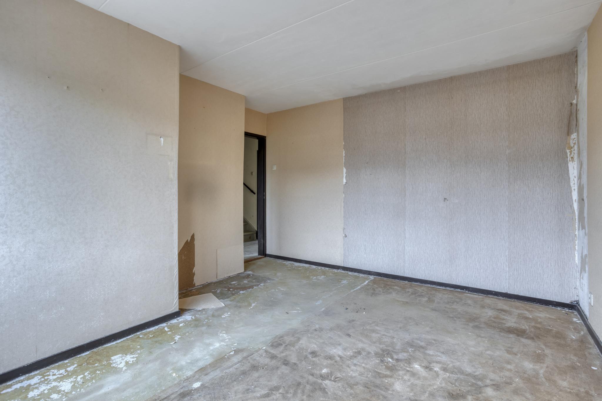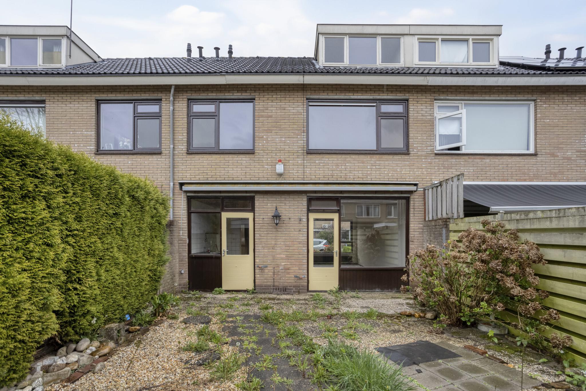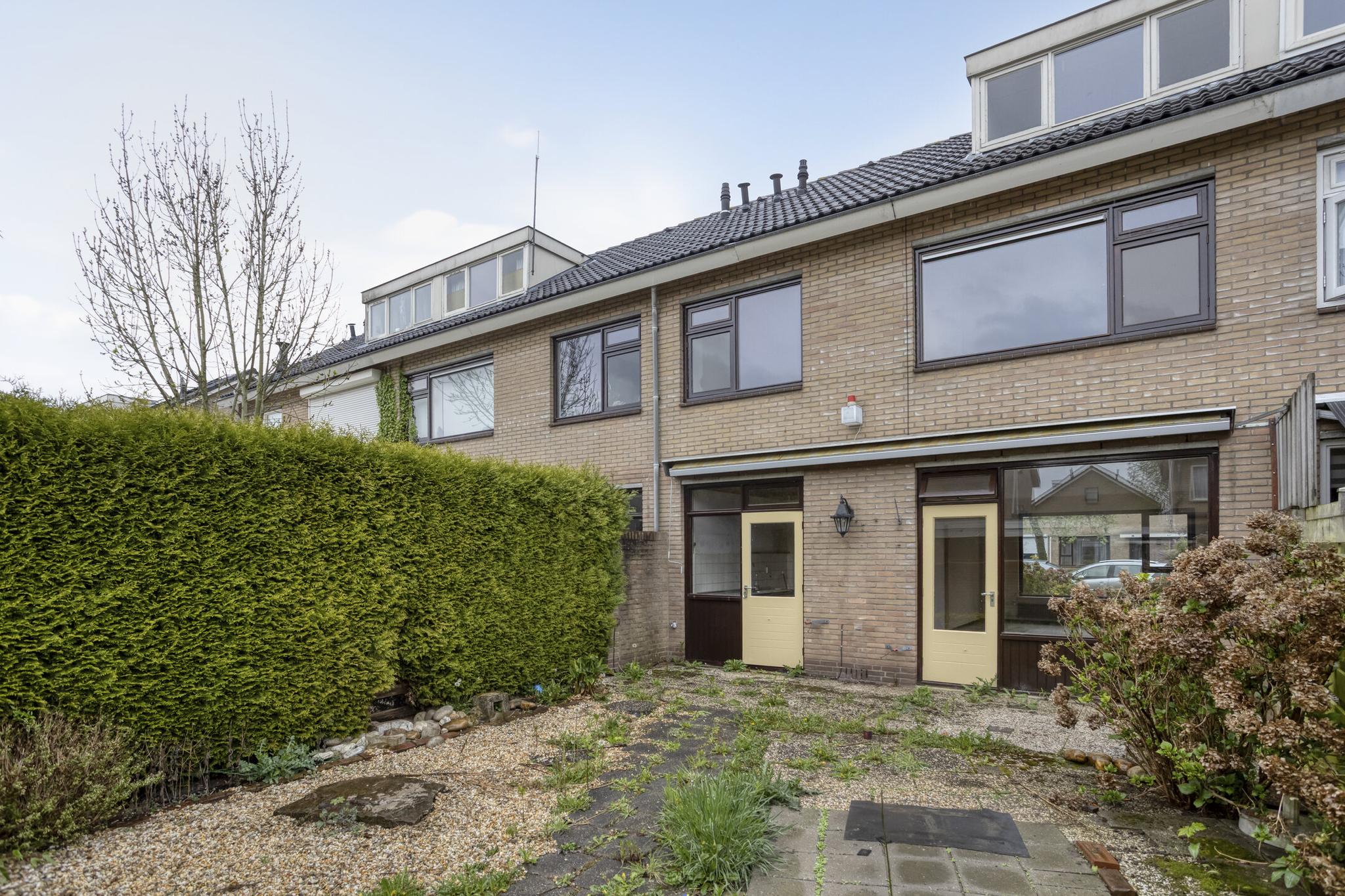 Entree, hal, toilet, trapkast, dichte keuken en royale woonkamer. Vanuit de woonkamer is er toegang tot de achtertuin.