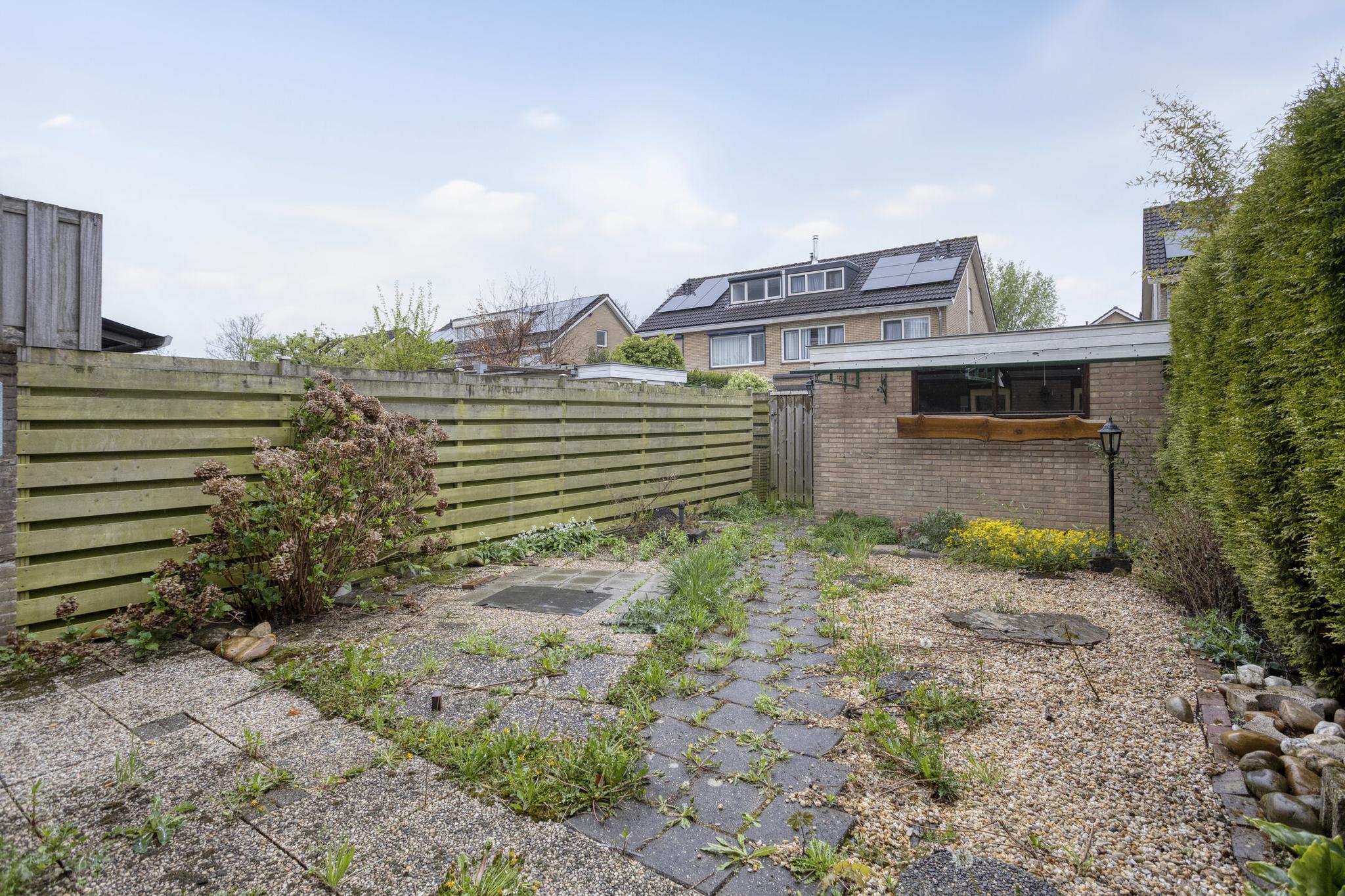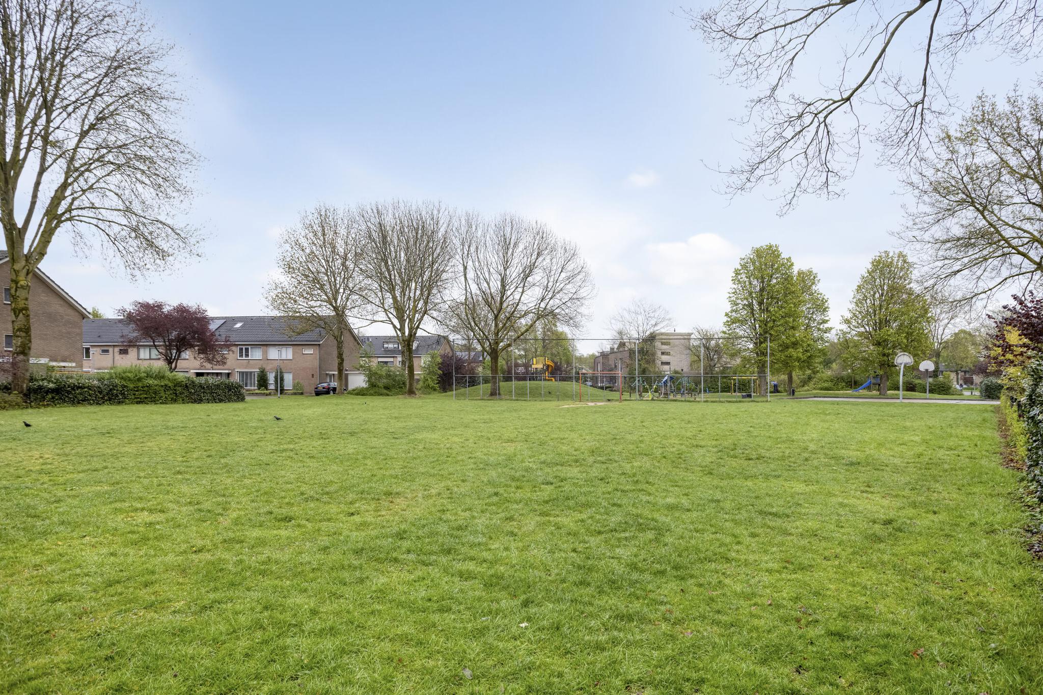 Op fraaie locatie tegenover speelweide/groen gelegen royale deels gemoderniseerde eengezinswoning met stenen berging en goed omsloten tuin gesitueerd op het Westen met achterom.