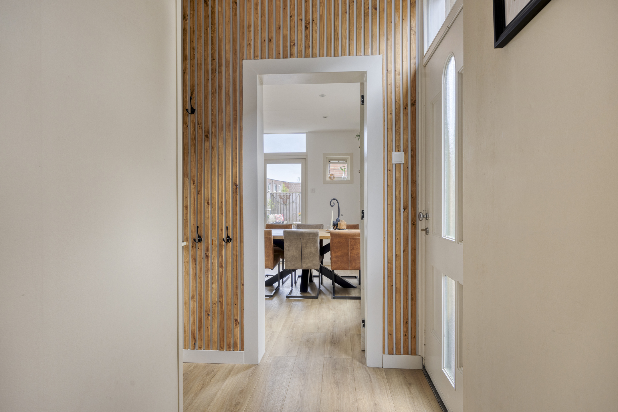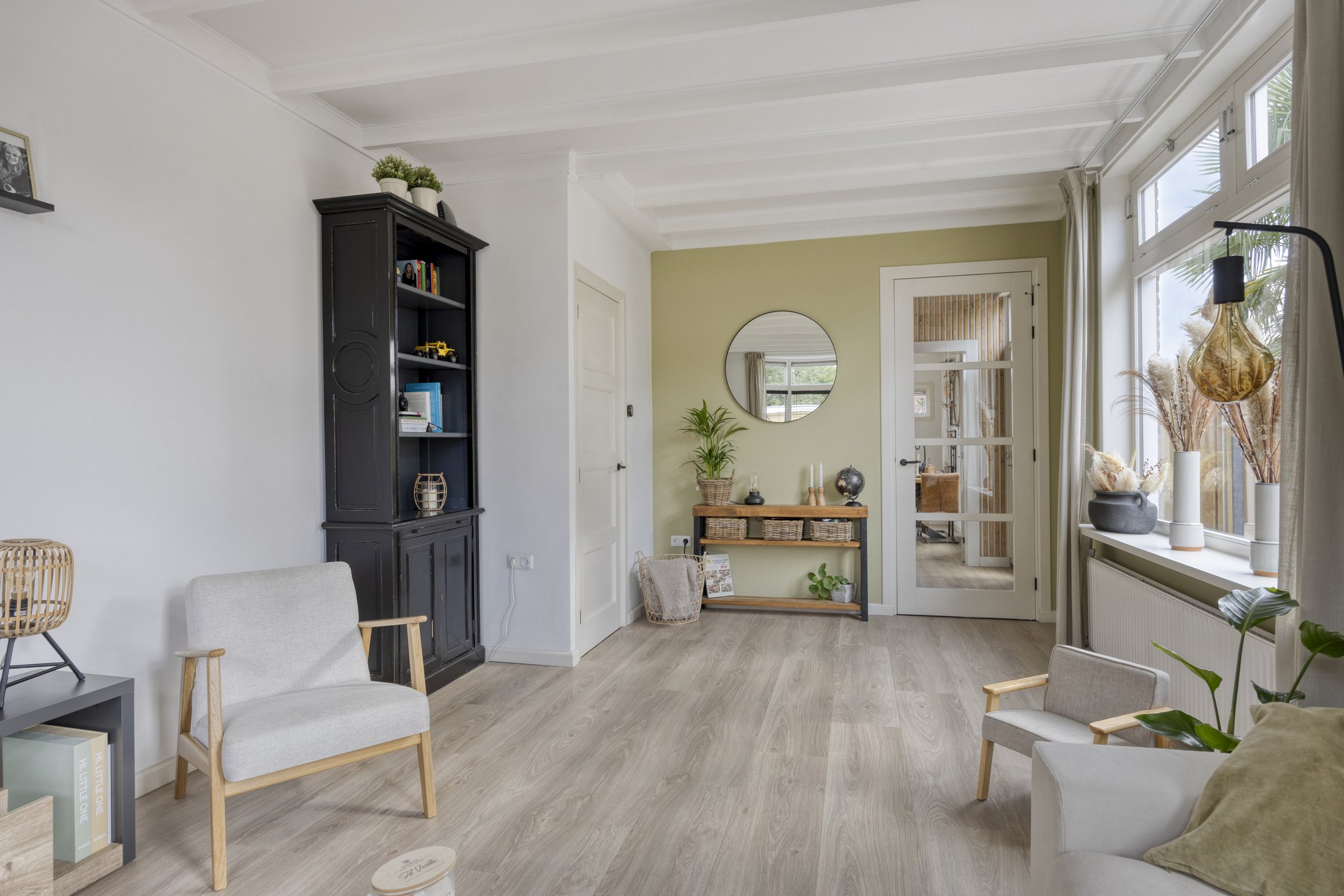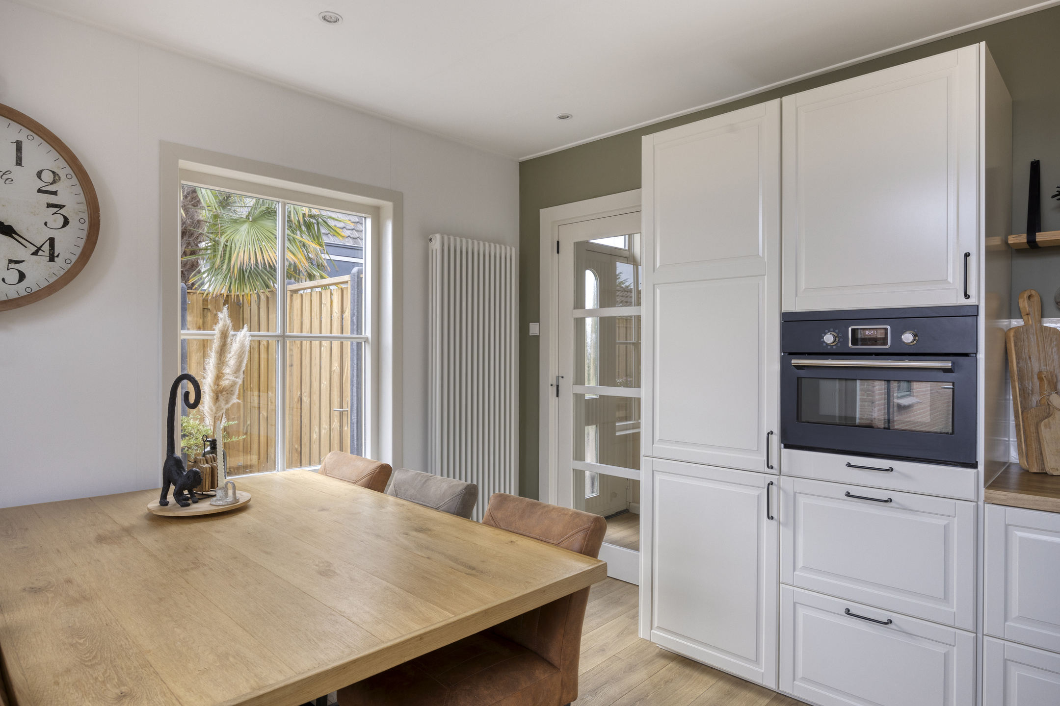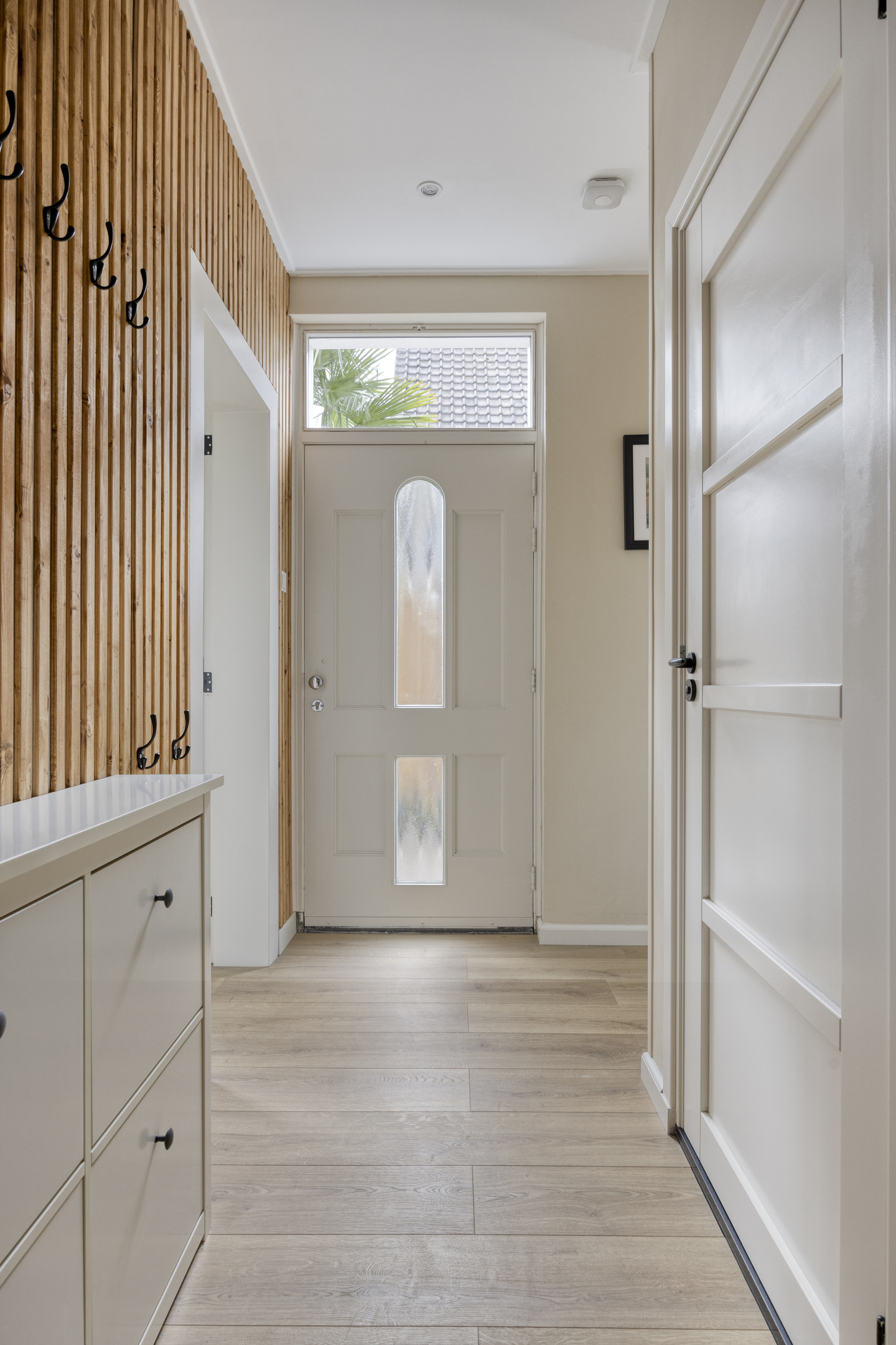 Entree, hal met toegang tot de woonkamer en keuken. Deze ruime en lichte woonkamer met stijlvolle houtlook laminaatvloer voelt aan als een heerlijke woonsfeer. Vanuit de hal stap je de lichte keuken binnen, compleet met handige inbouwapparatuur en uitzicht op de tuin. De keuken is voorzien van inductiekookplaat met afzuiging, vaatwasser, koelkast, vriezer en combimagnetron.