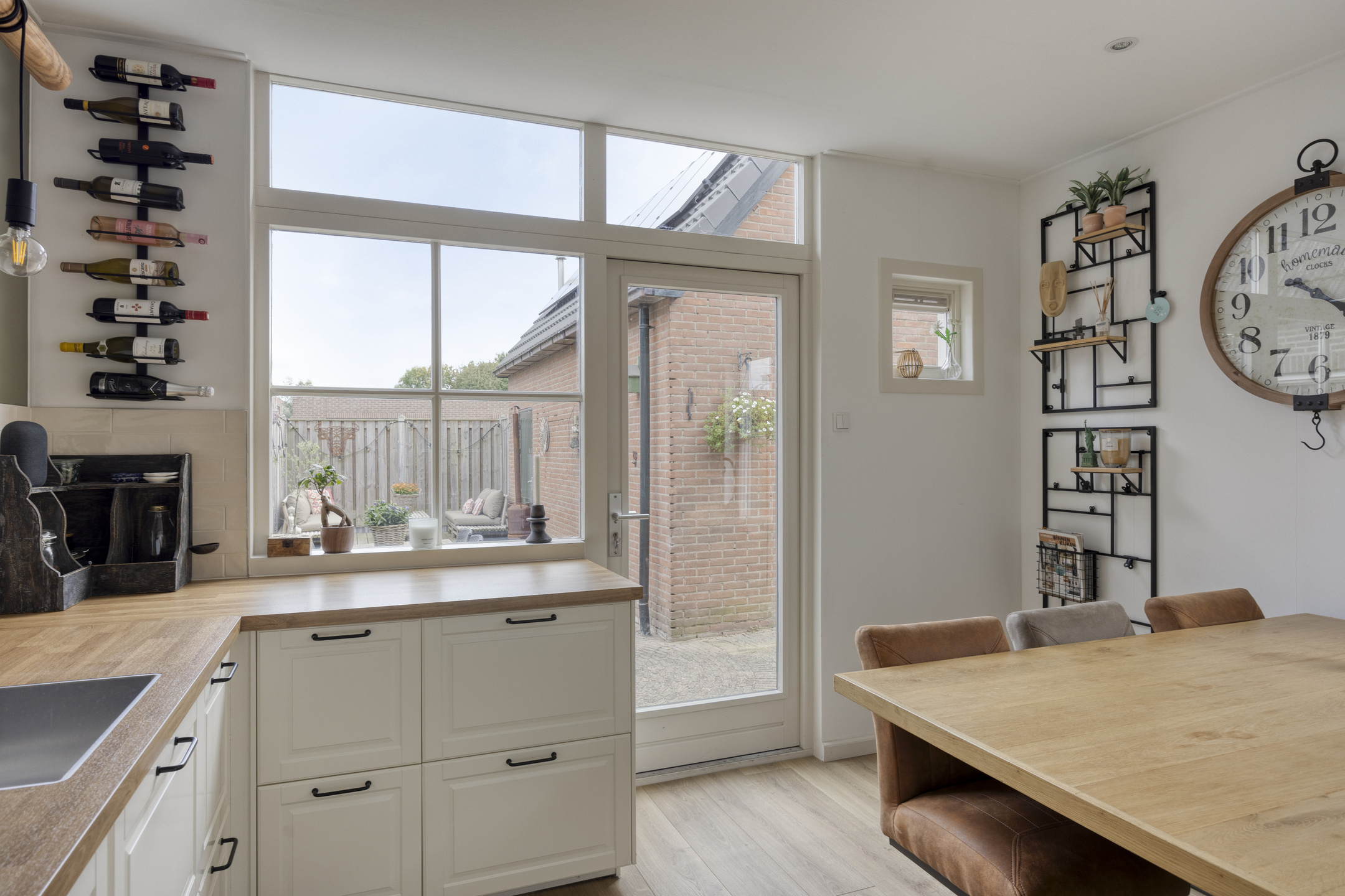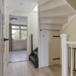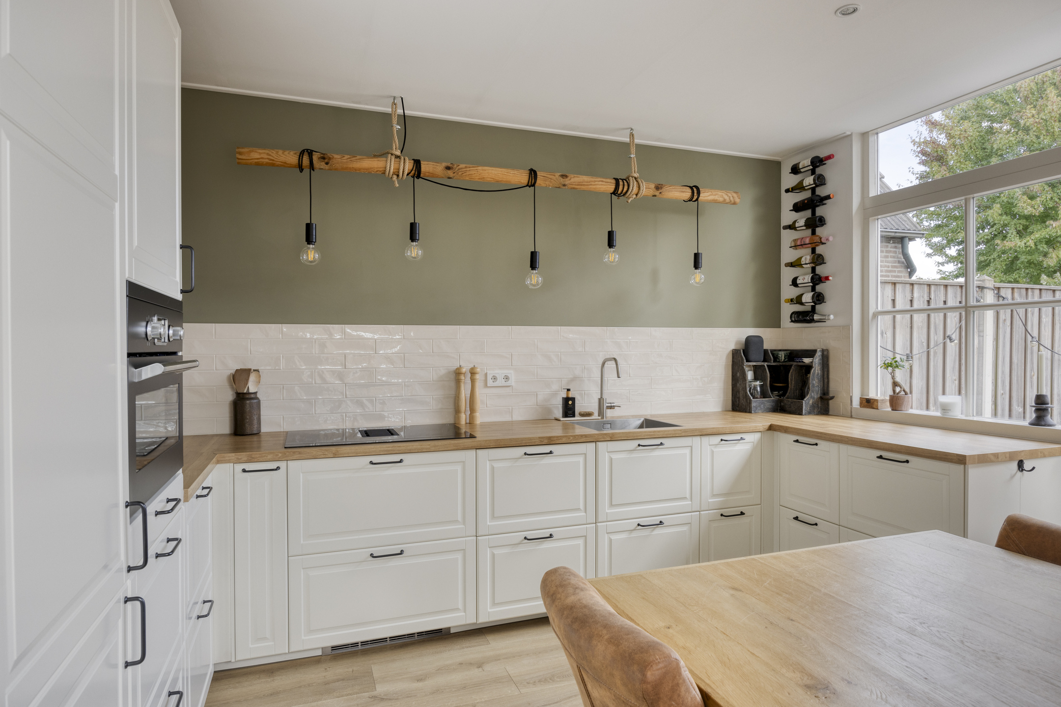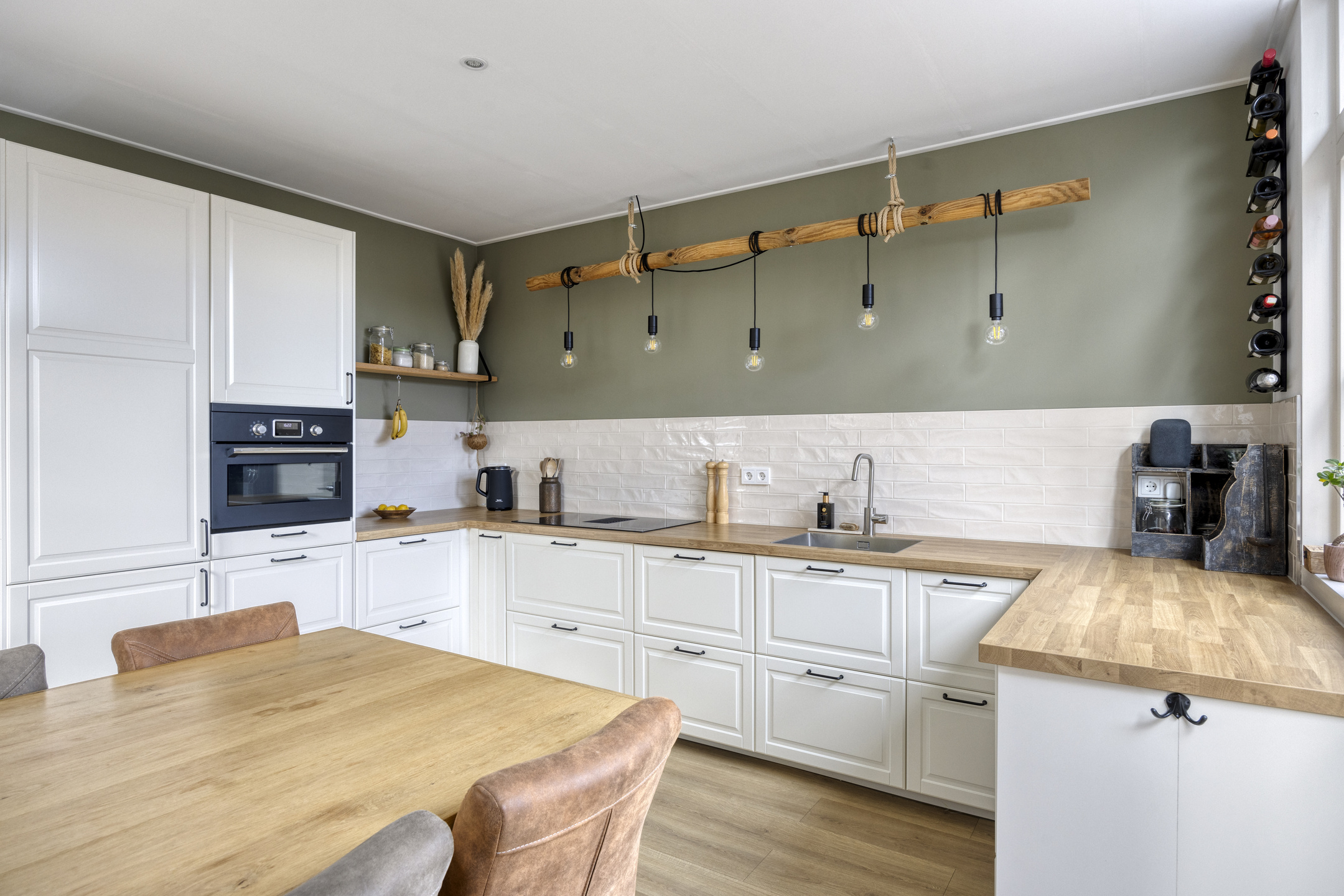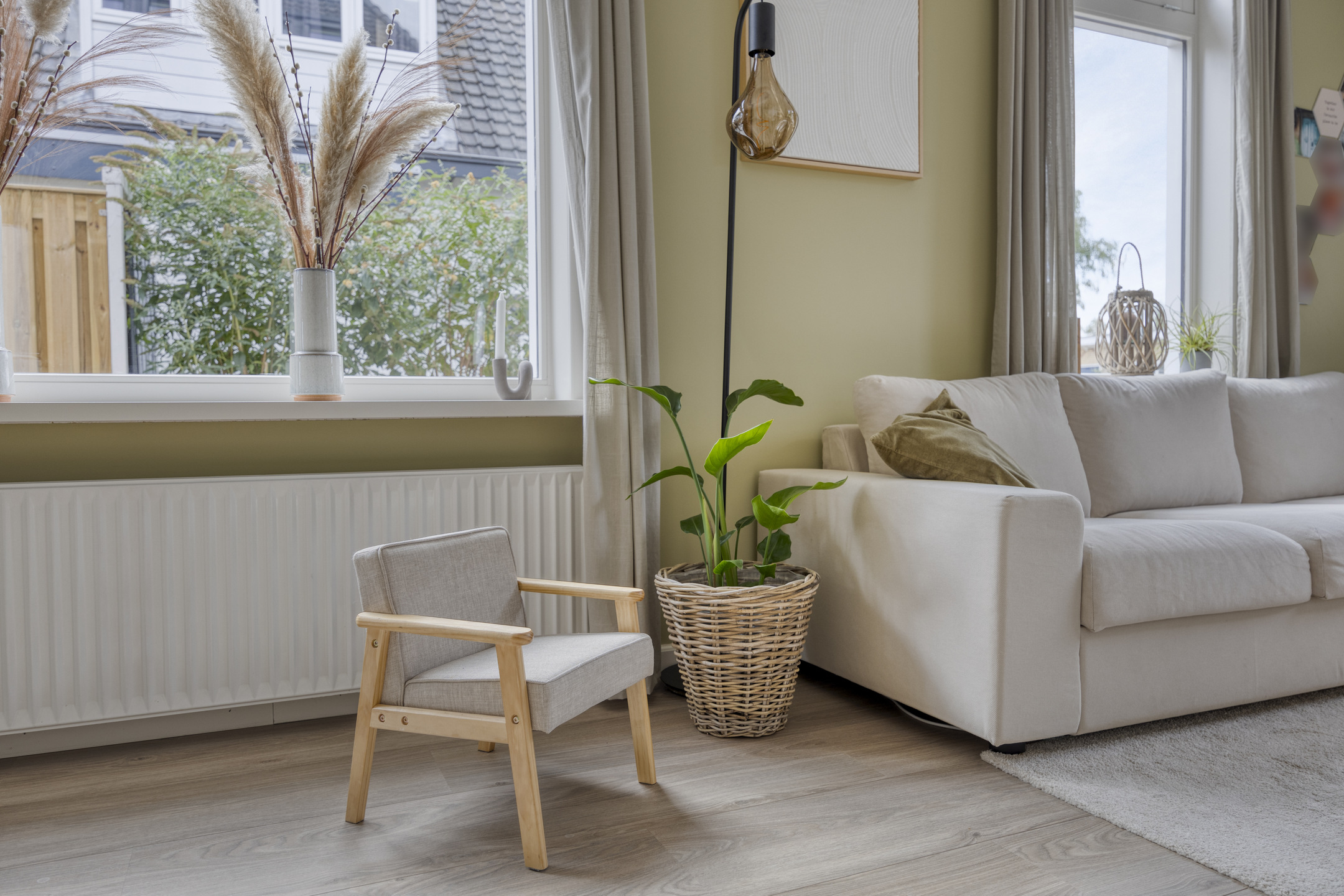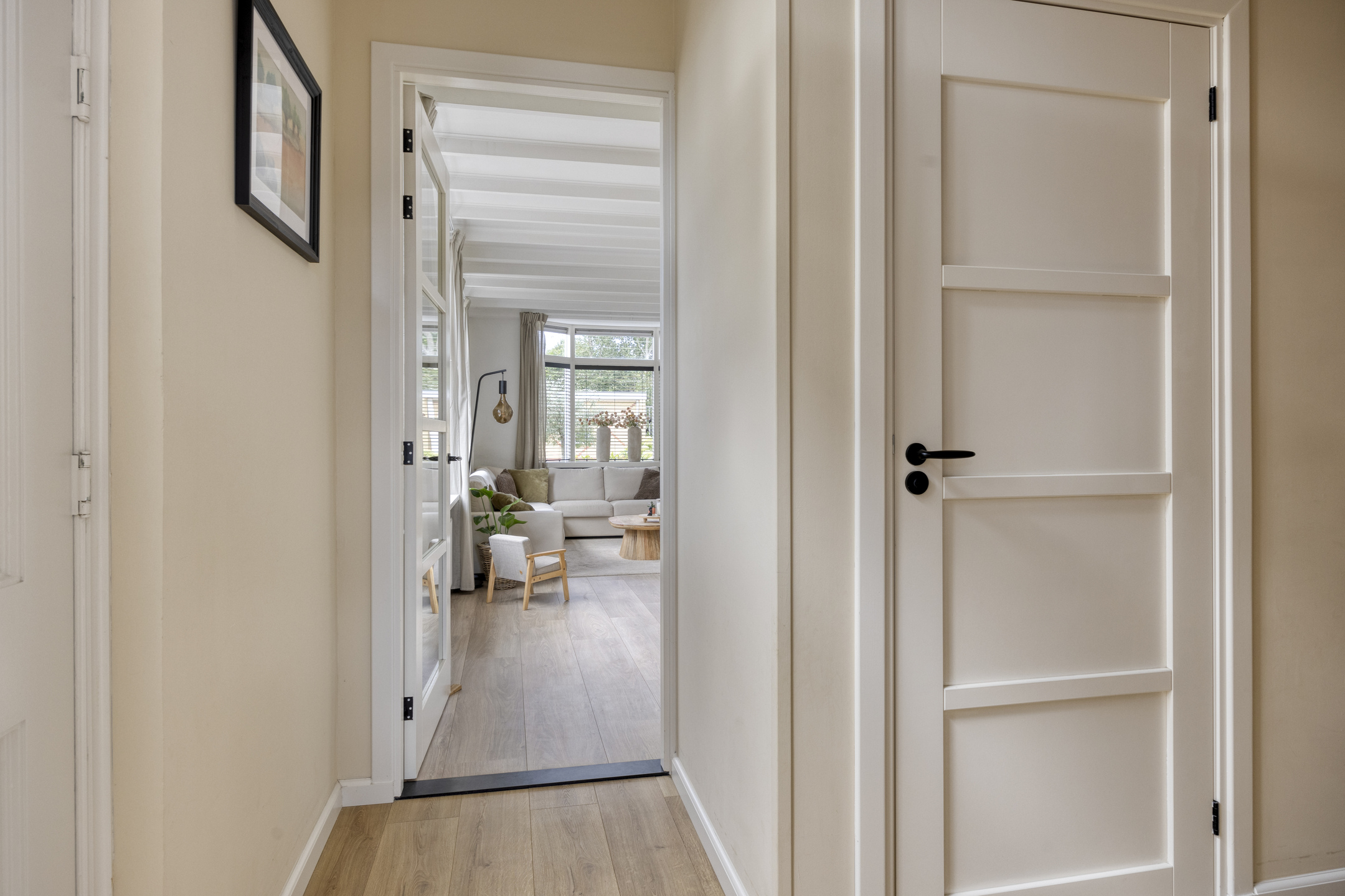 Entree, hal met toegang tot de woonkamer en keuken. Deze ruime en lichte woonkamer met stijlvolle houtlook laminaatvloer voelt aan als een heerlijke woonsfeer. Vanuit de hal stap je de lichte keuken binnen, compleet met handige inbouwapparatuur en uitzicht op de tuin. De keuken is voorzien van inductiekookplaat met afzuiging, vaatwasser, koelkast, vriezer en combimagnetron.